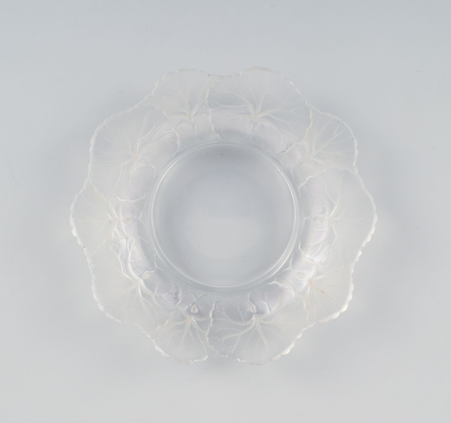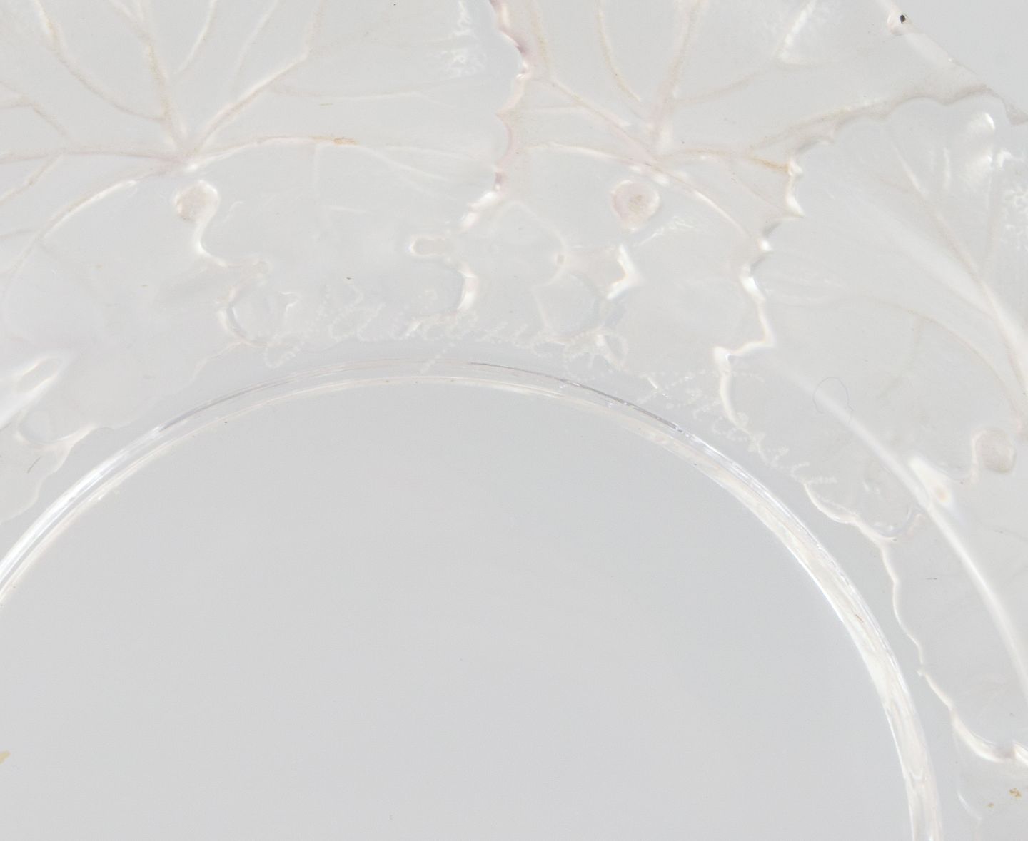 Lalique flaskebakke i klart kunstglas med blomsterdekoration. Ca. 1980. D 14,5 cm. x H 2,5 cm. Passer til flaskebund på 7,0 cm I perfekt stand. Indgraveret signatur ”Lalique France”.