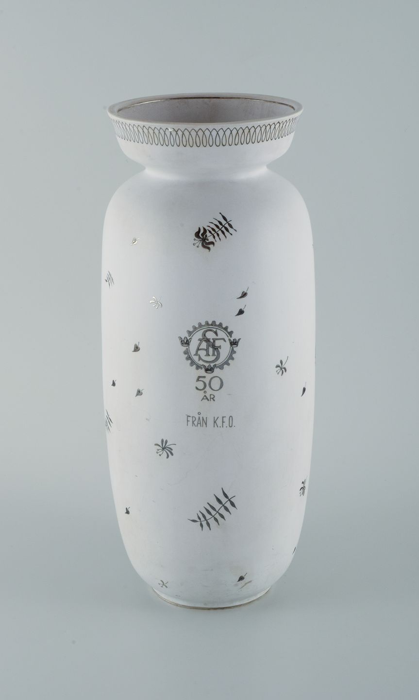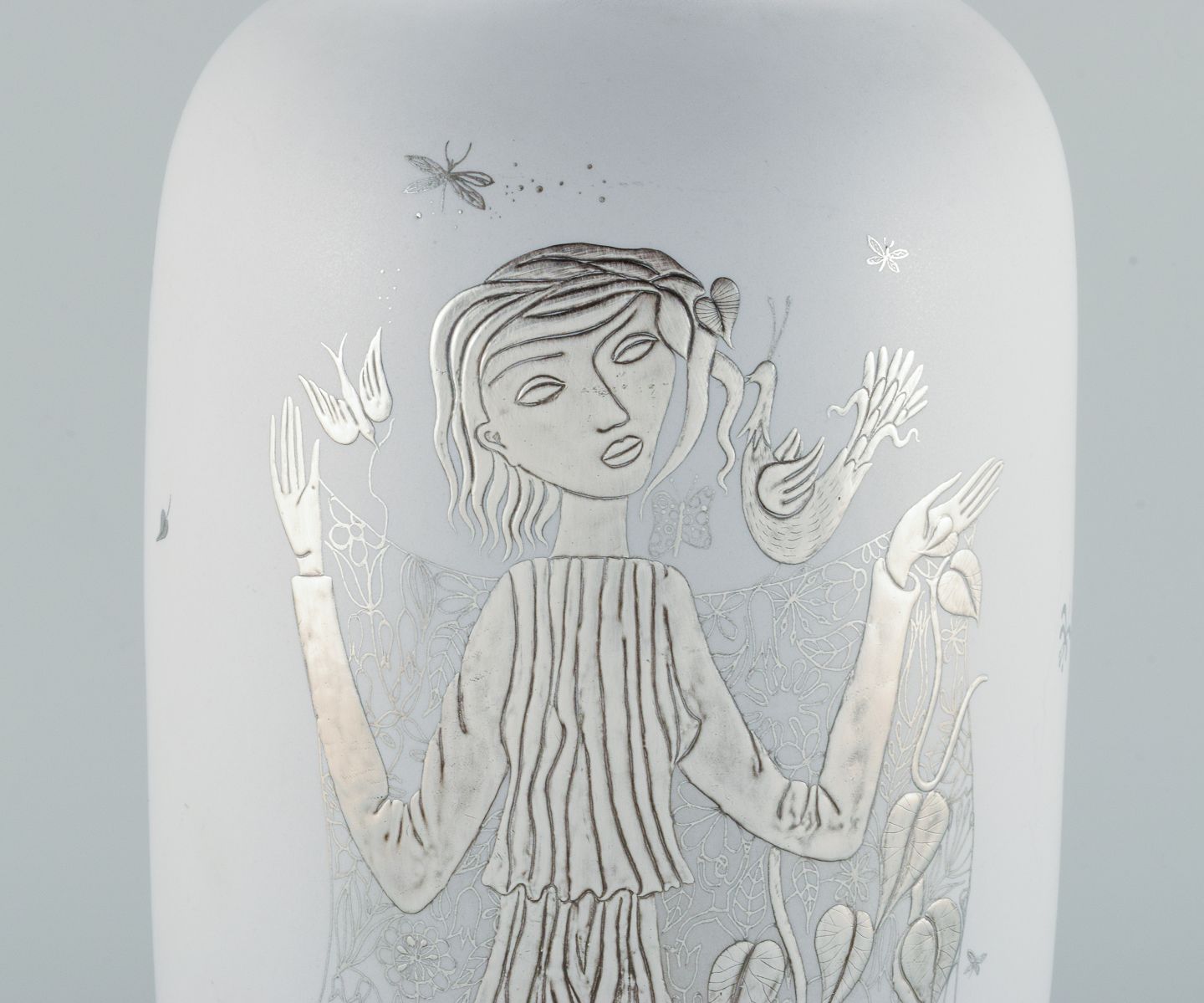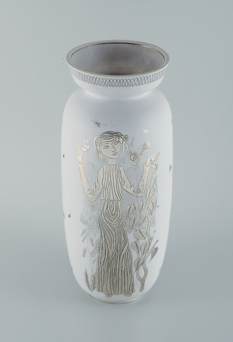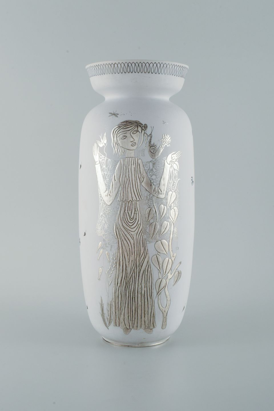 Stig Lindberg for Gustavsberg, Sweden. Large "Grazia" ceramic vase with silver inlay in the shape of a standing woman.