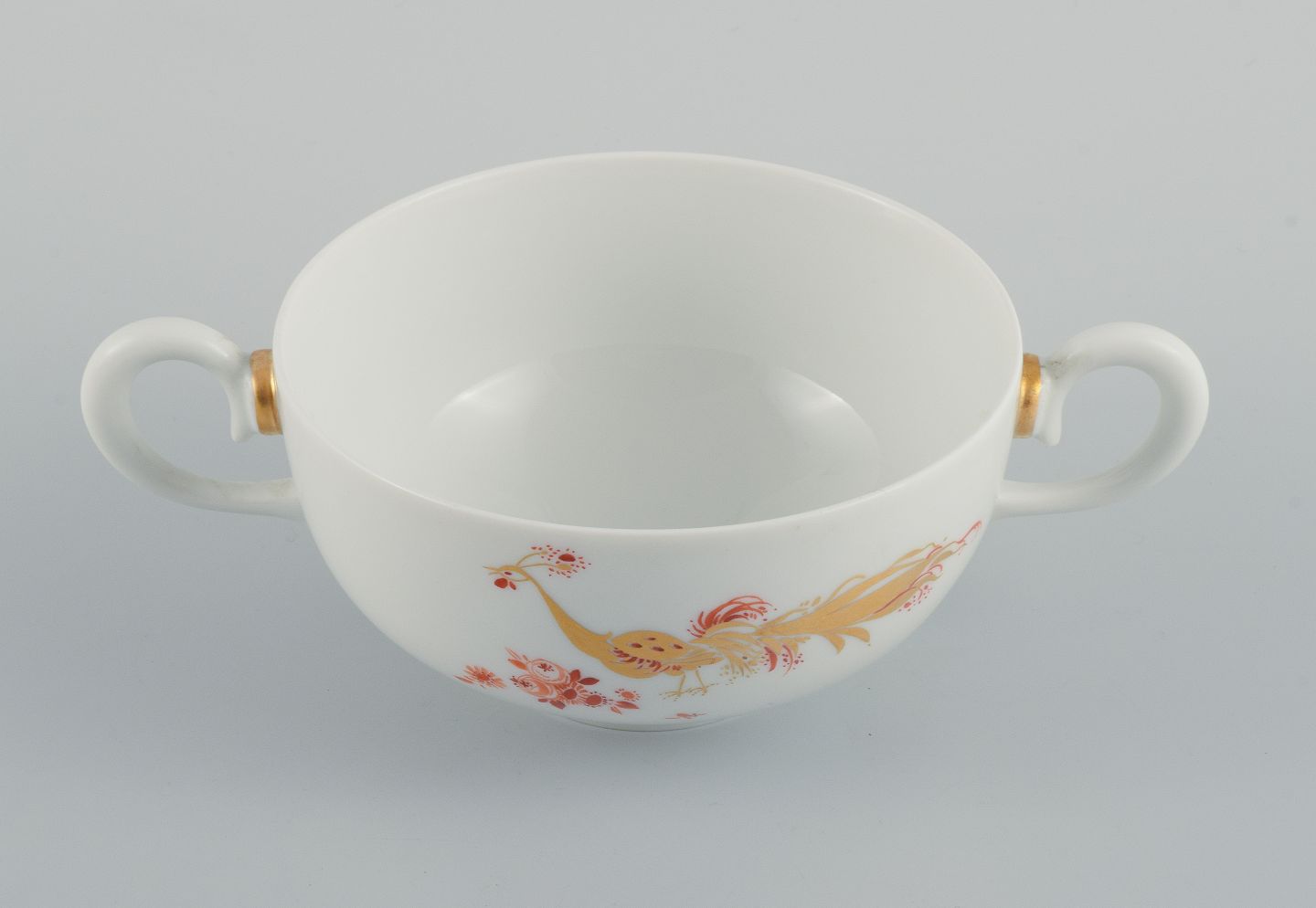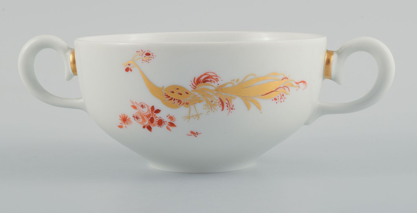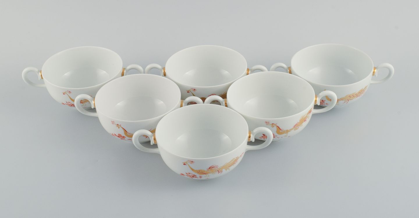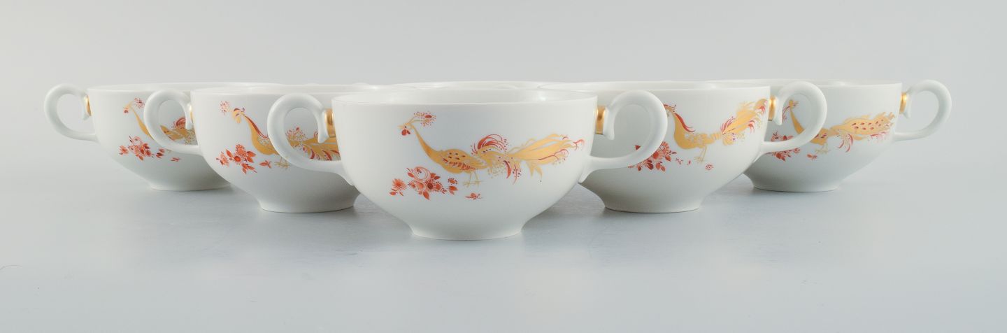 Meissen, Germany, a set of six art deco gold peacock bouillon cups. 1930s. Diameter 12.0 (without handle) x H 6.5 cm. In excellent condition. Marked. Third factory quality.