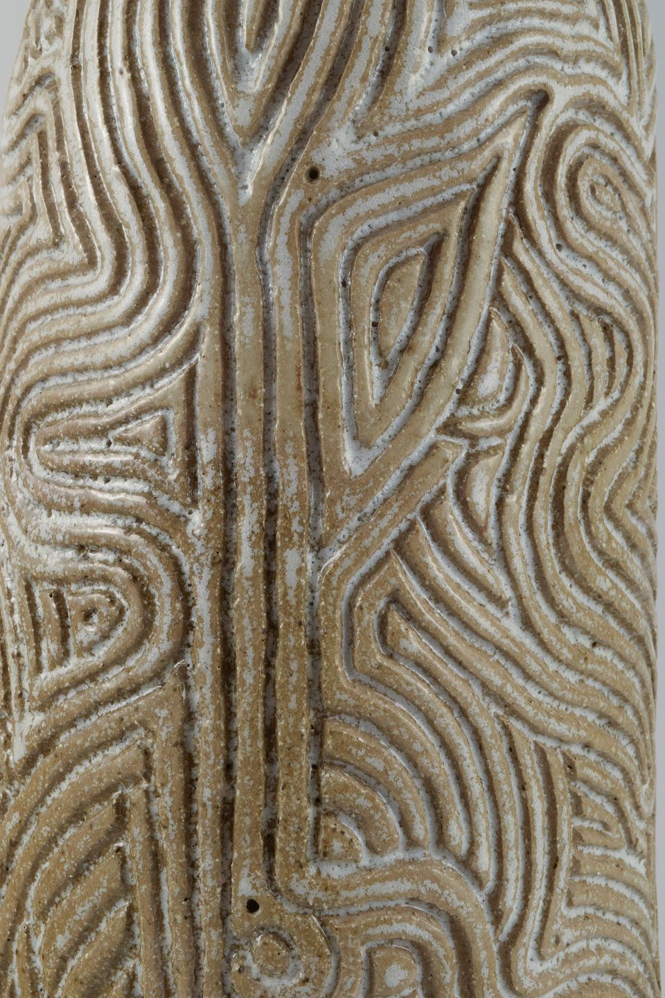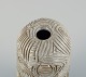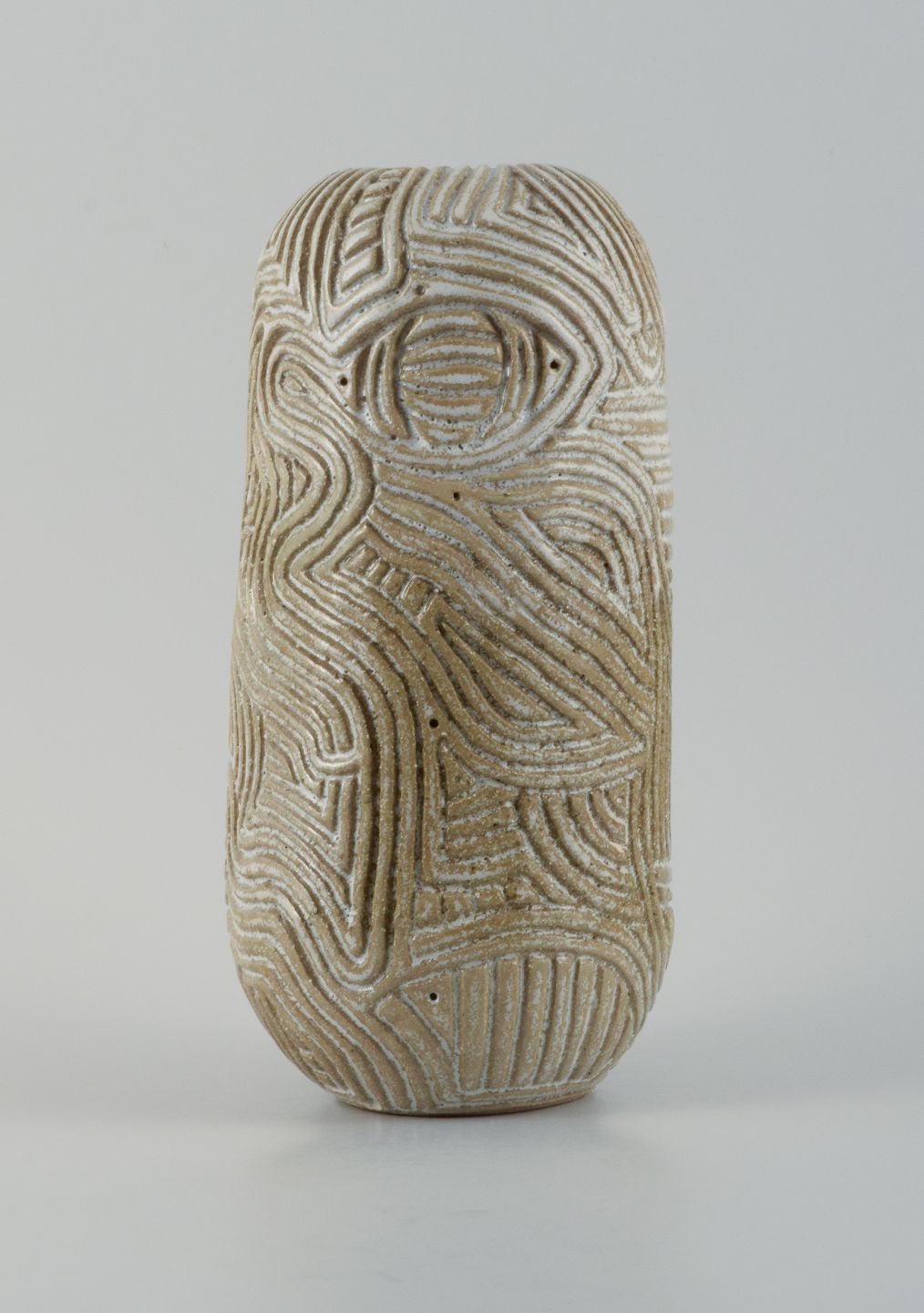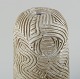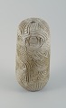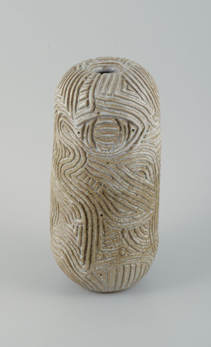 Unique, handcarved vase in stoneware clay. Covered in a shiny, semi transparent glaze with white flakes.