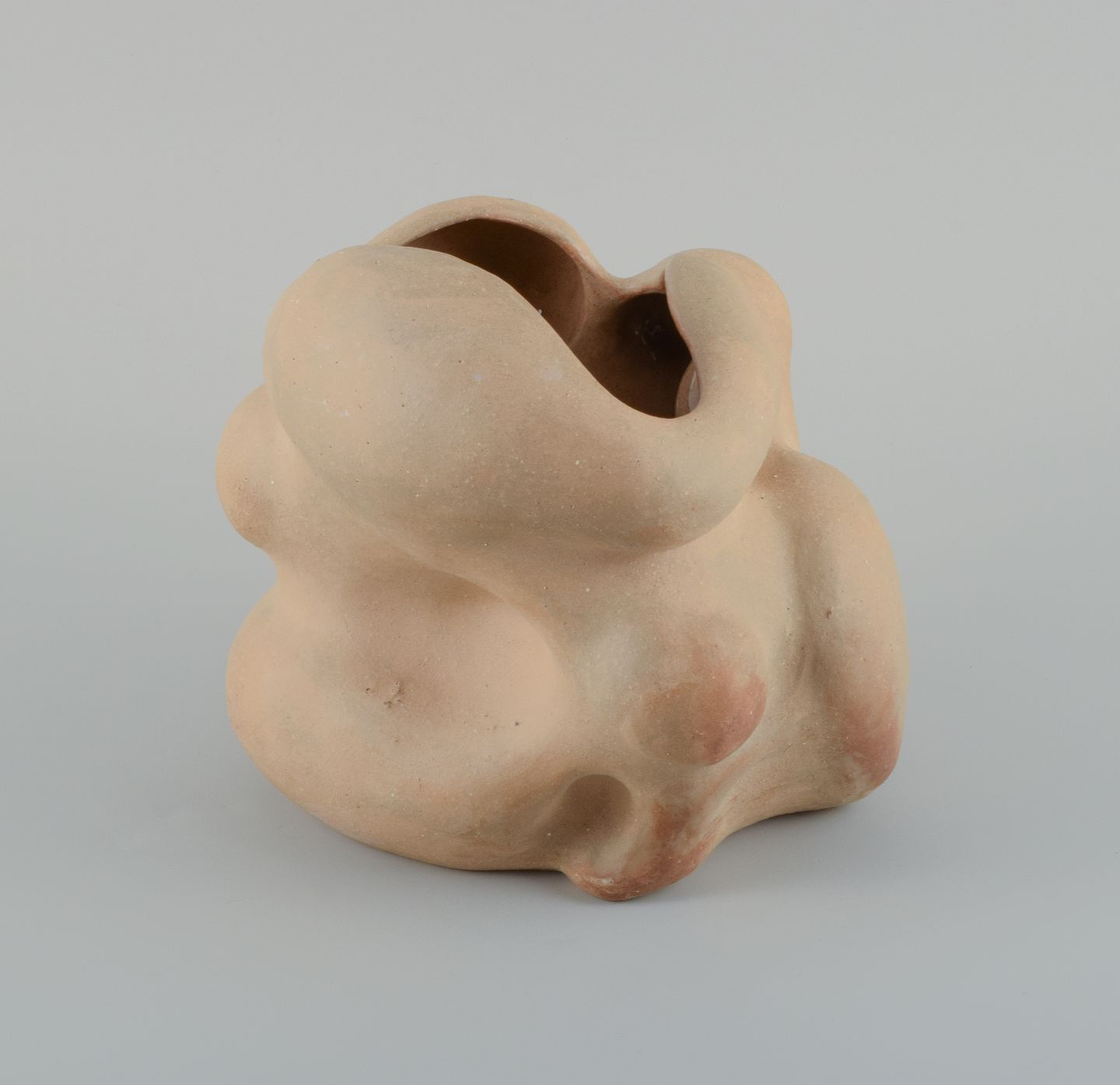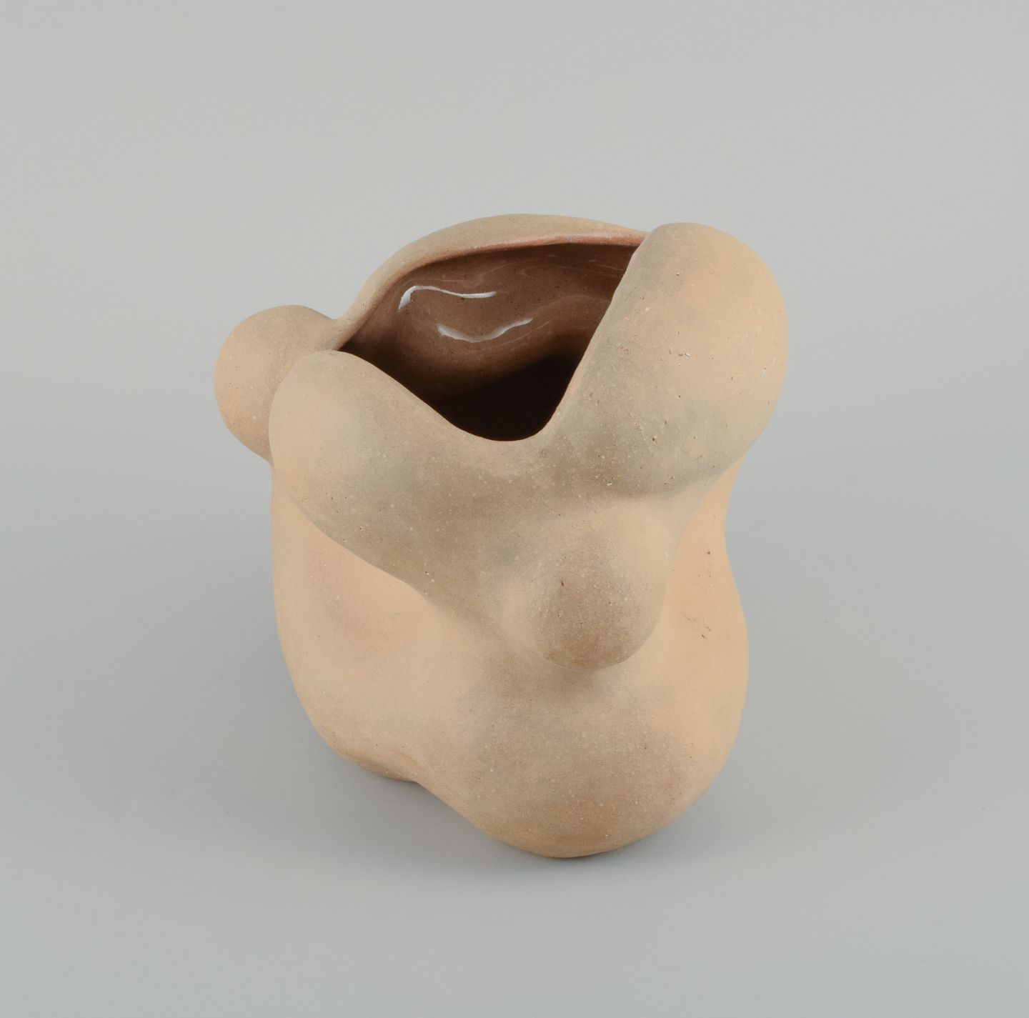 Unique organically shaped vase in light golden stoneware clay. Clear glaze on the inside.