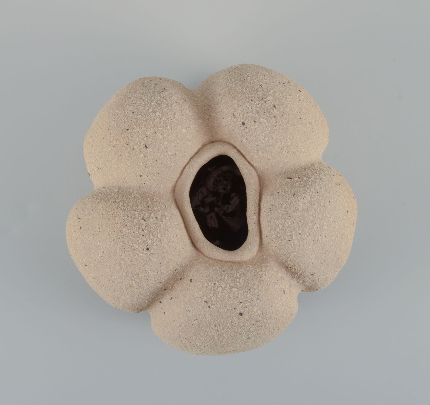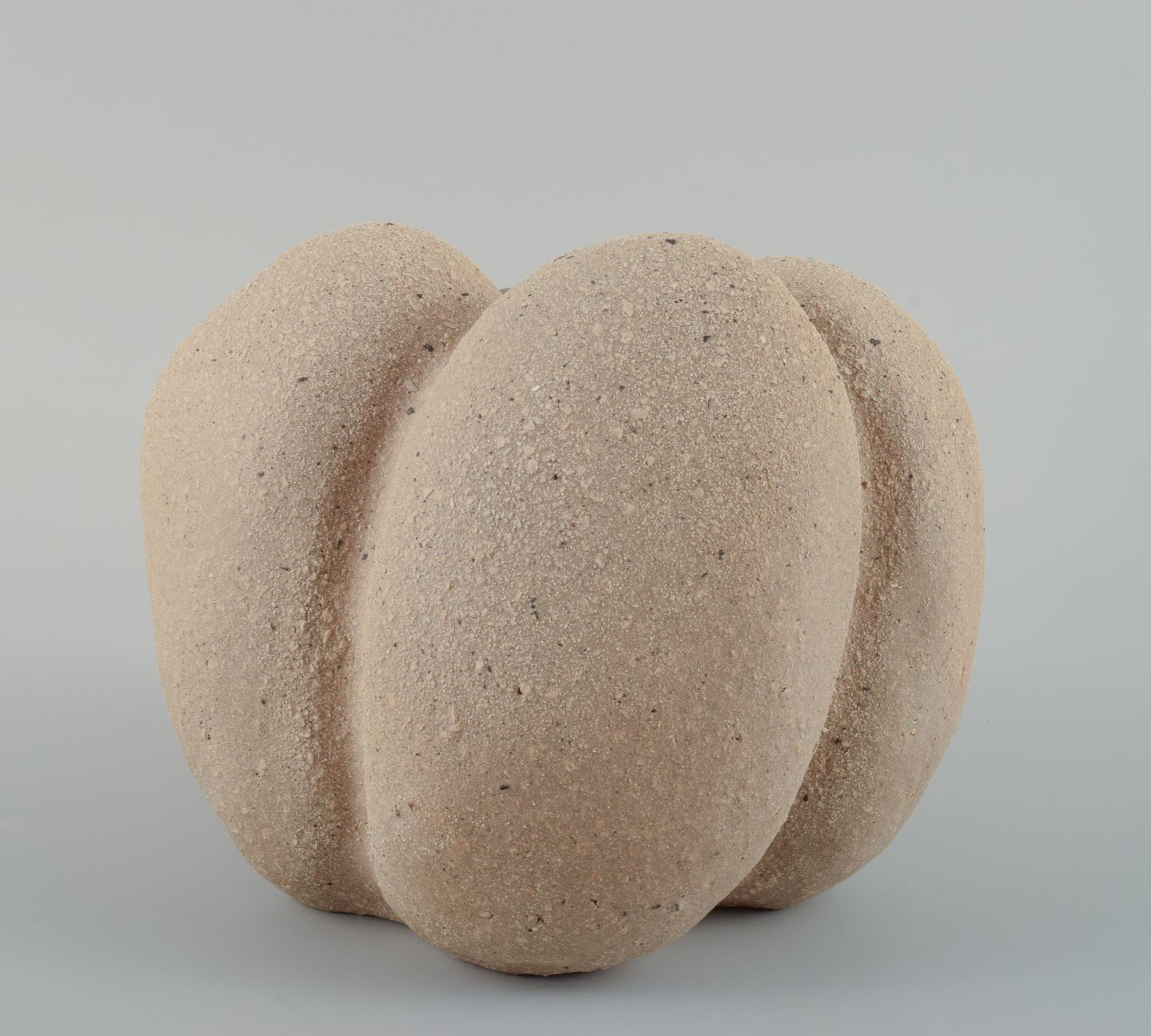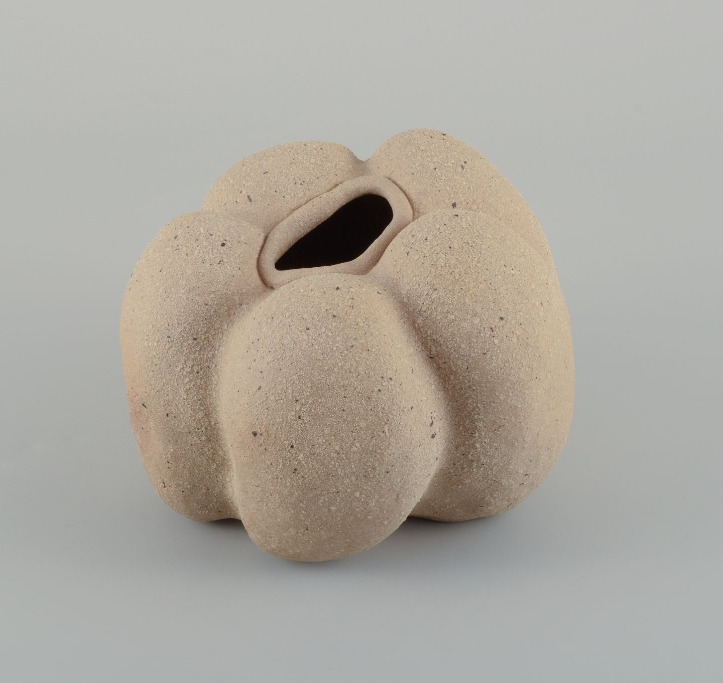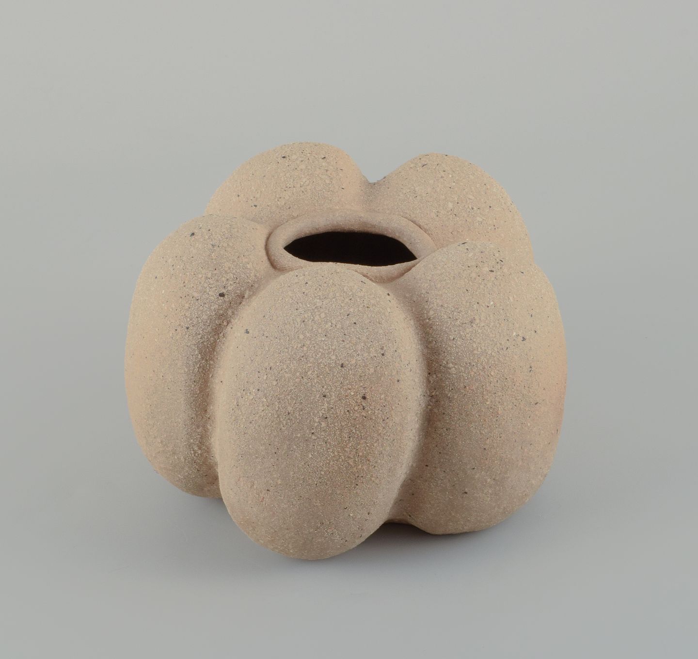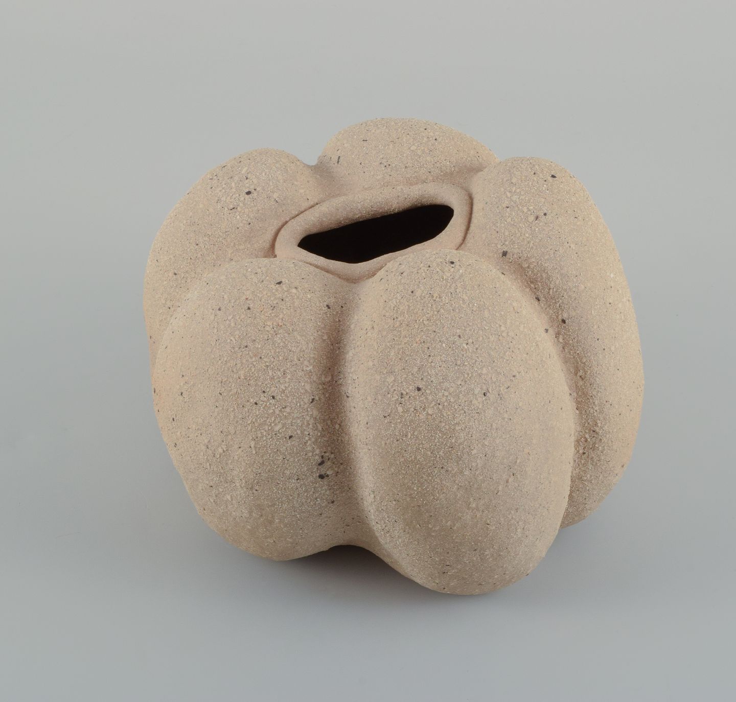 Small, unique stoneware seedpod vase. Unglazed, with specks the vessel is organically shaped.