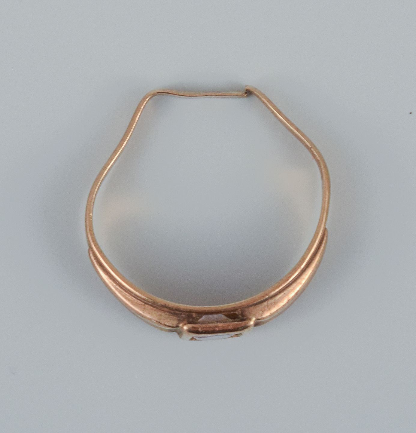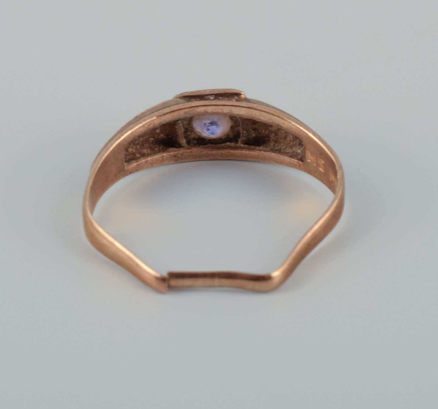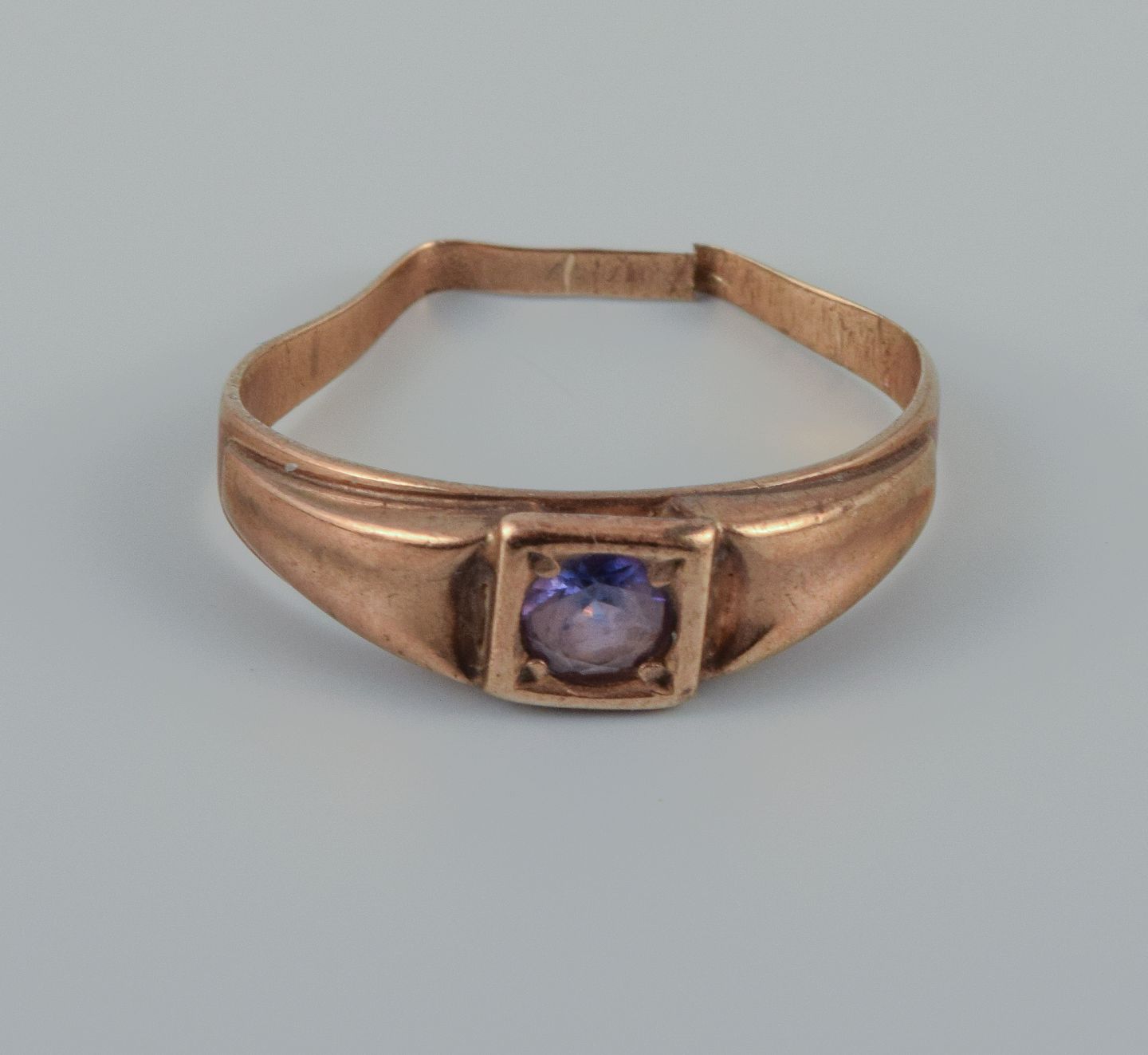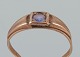 Dansk guldsmed. Guldring med lilla halvædelsten i art deco design. 1930/40’erne. Målt til 14 karat. Stemplet ”SH” 19 mm. Ringen er klippet op og dermed justerbar.