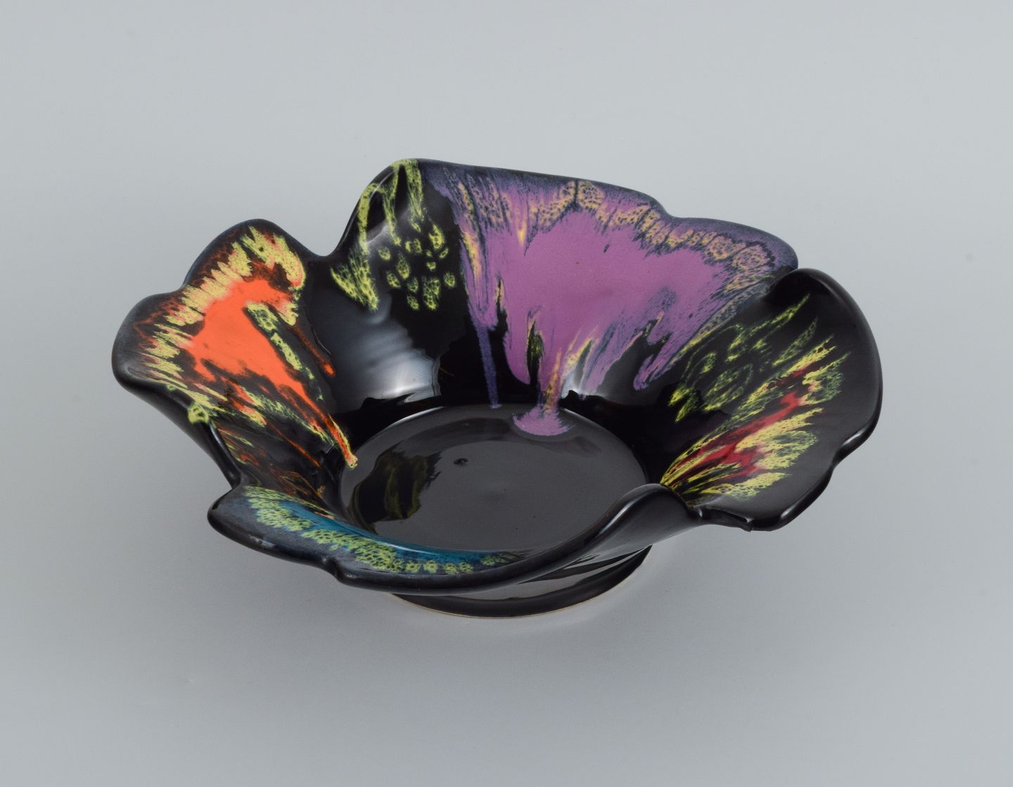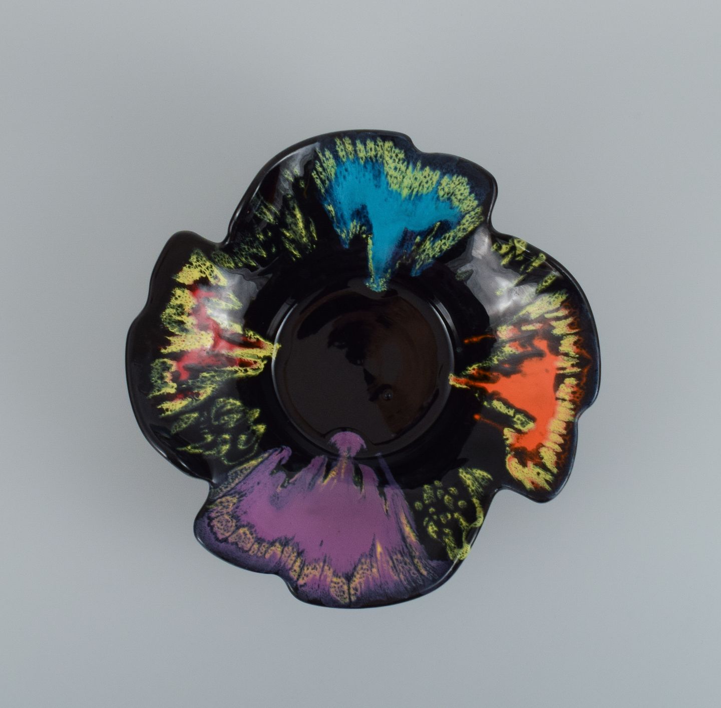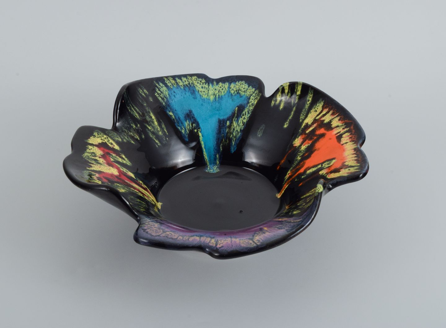 Vallauris, Frankrig, keramikskål i farvestrålende glasurer på sort bund.