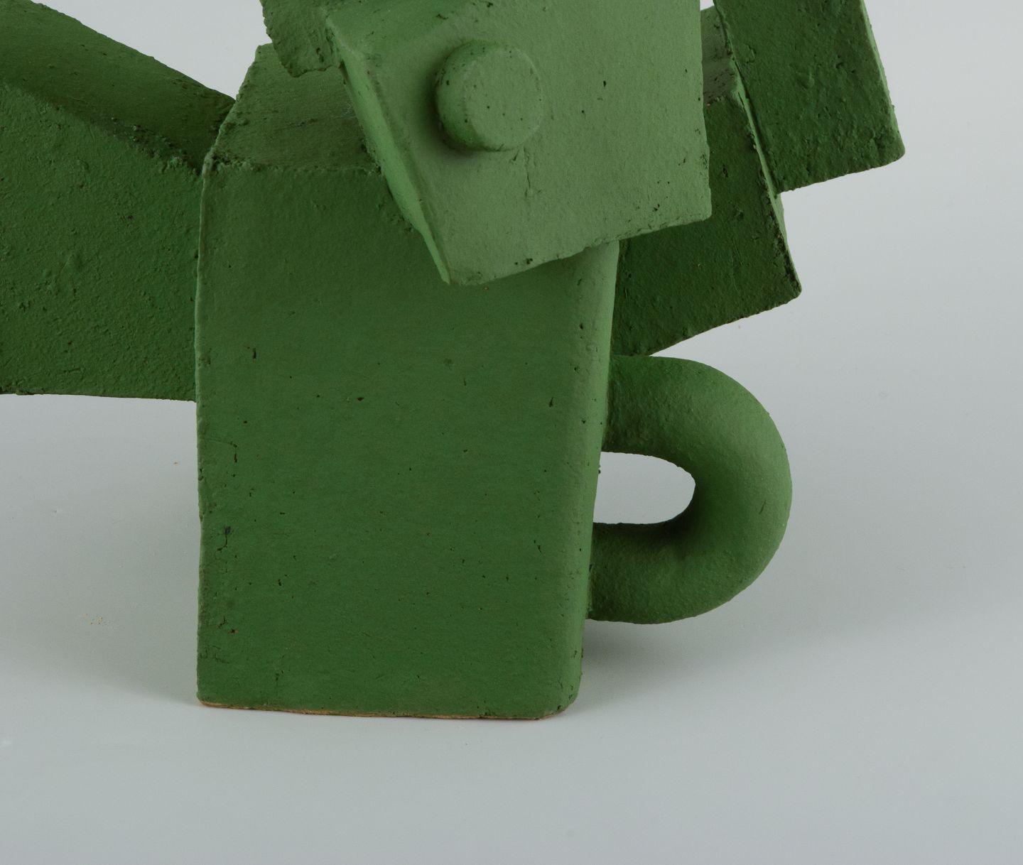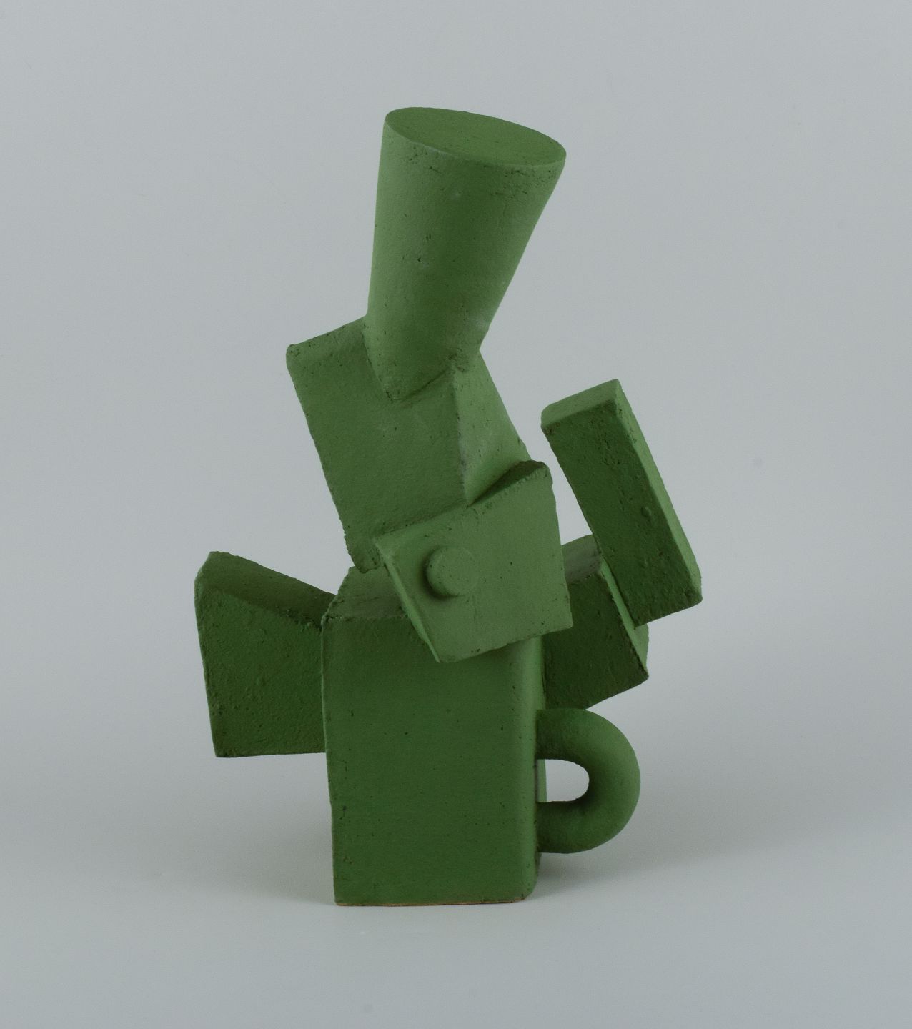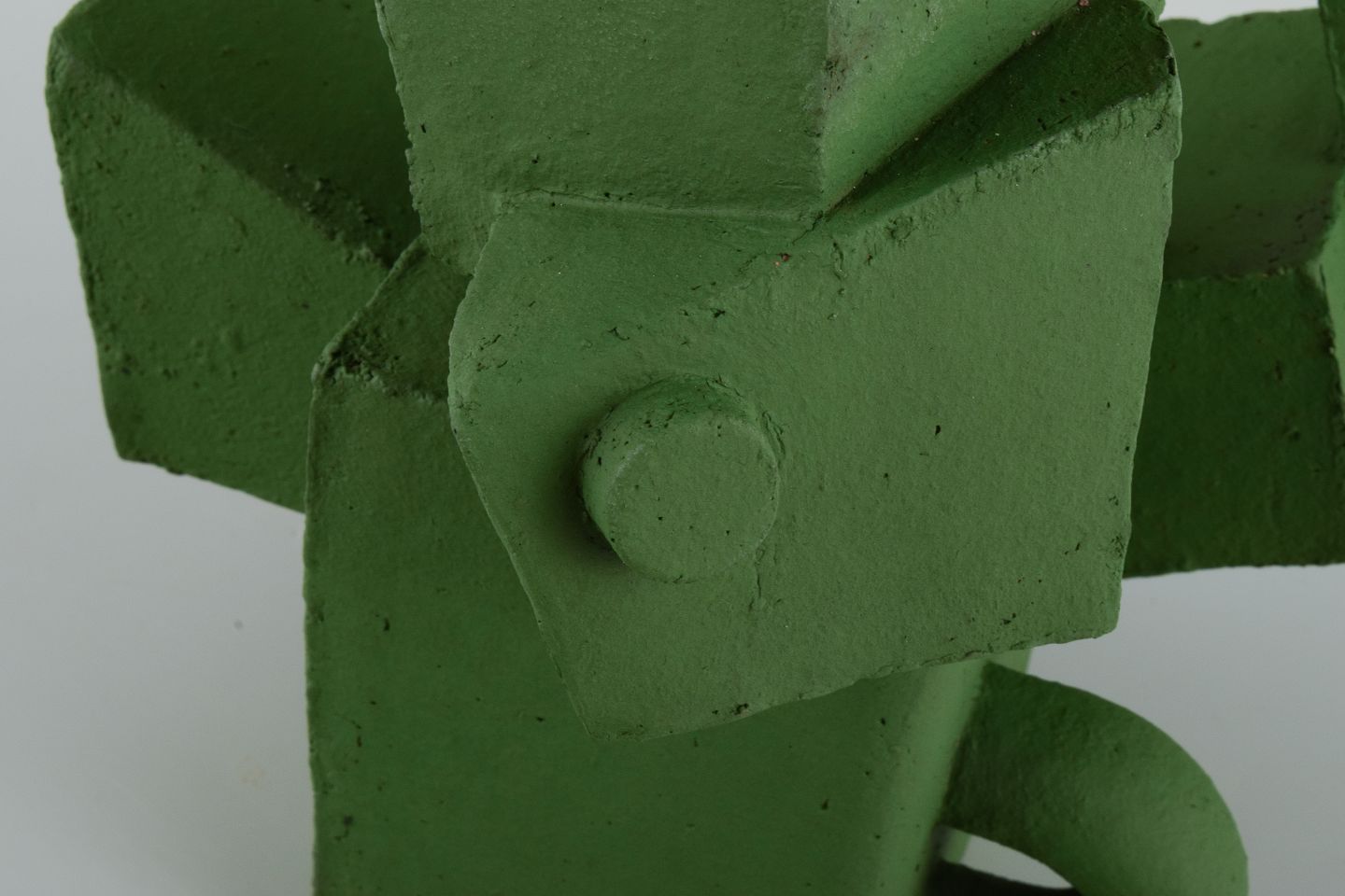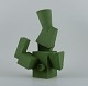 Unique cubist stoneware sculpture in matte grass green glaze.