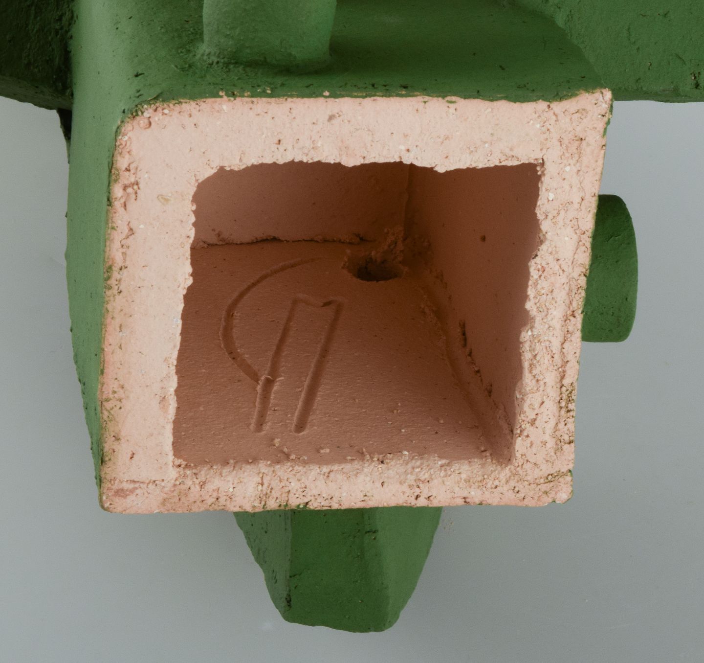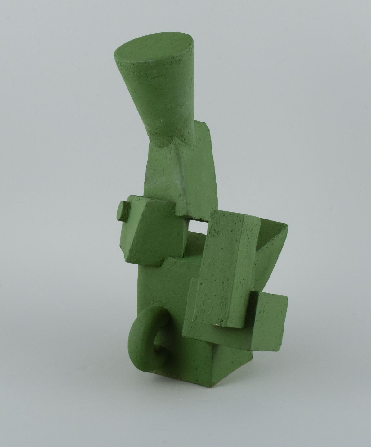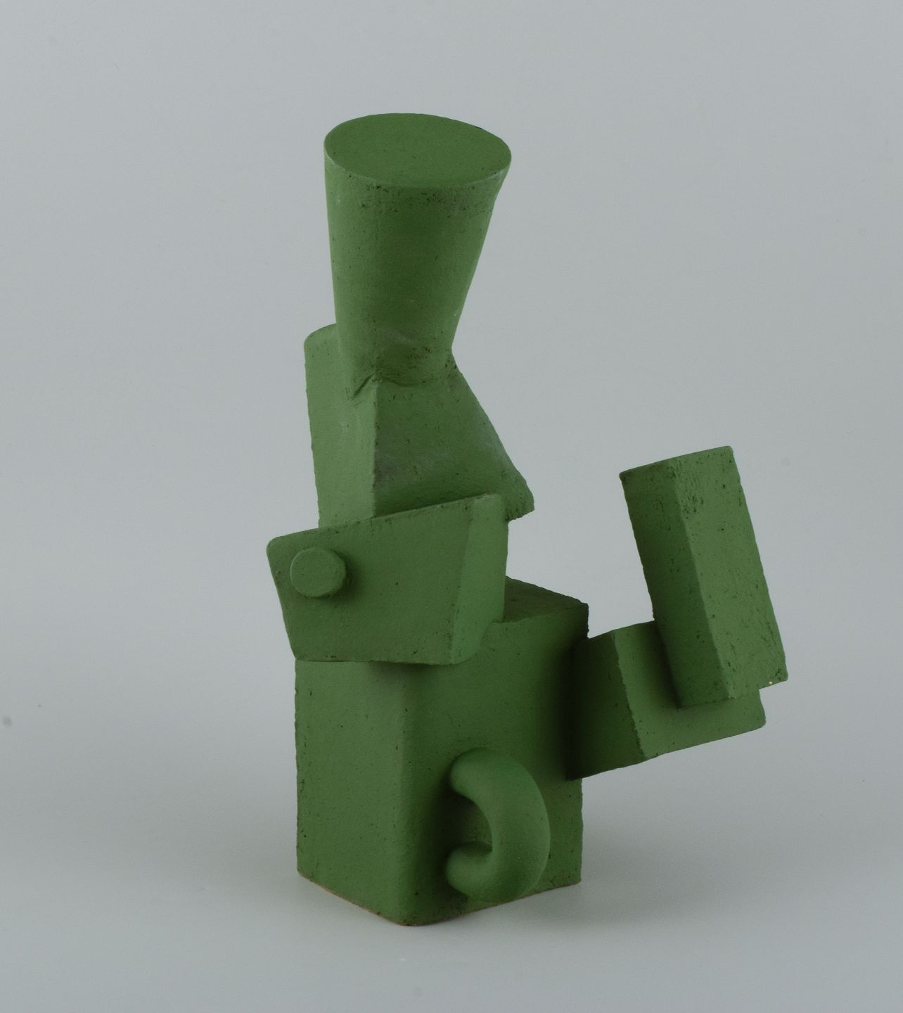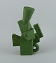 Unique cubist stoneware sculpture in matte grass green glaze.