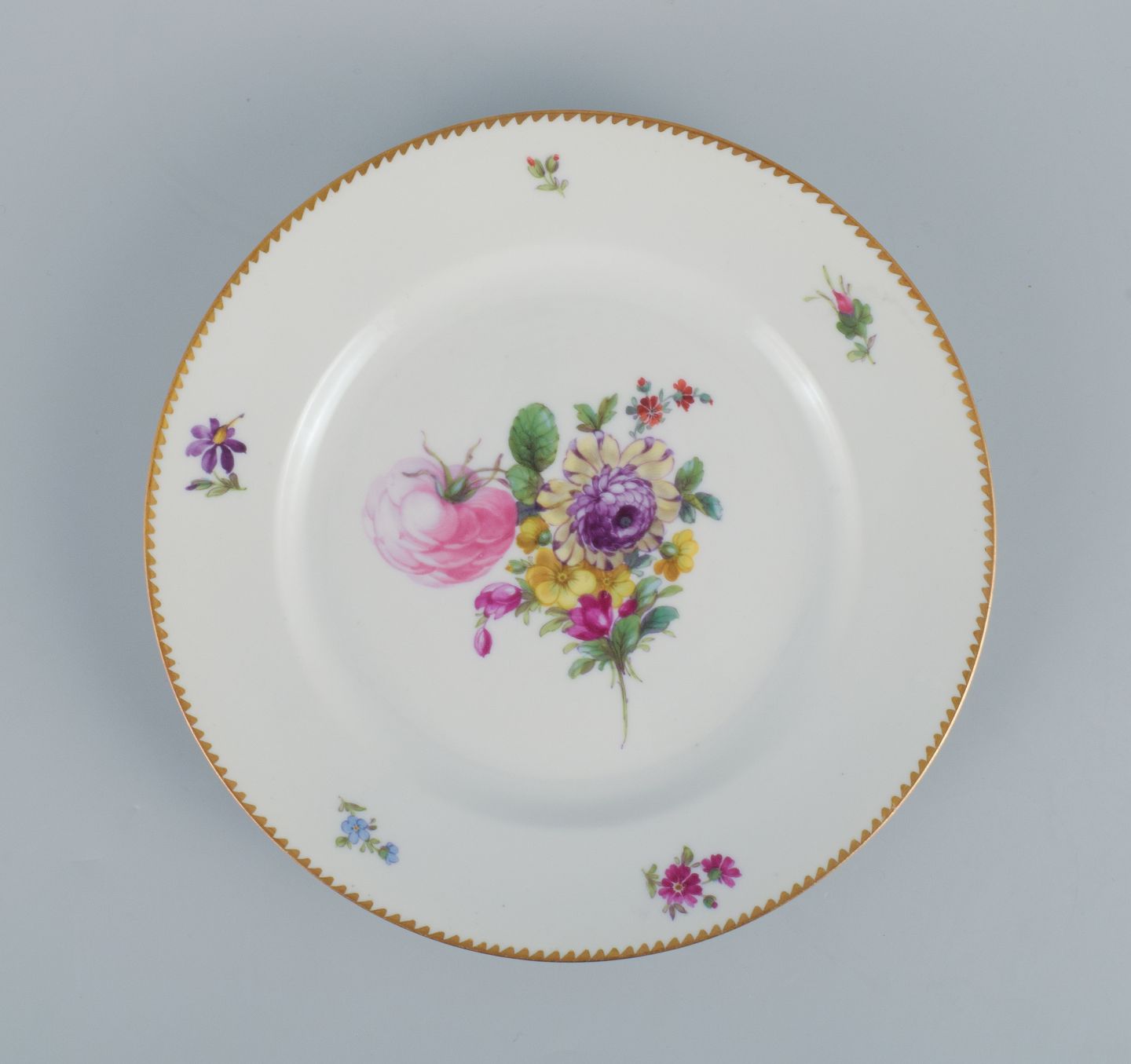 Fire middagstallerkner dekoreret med blomster og guldkant.