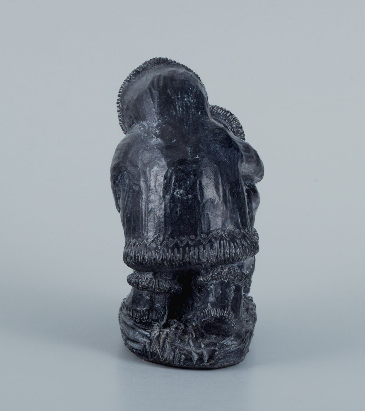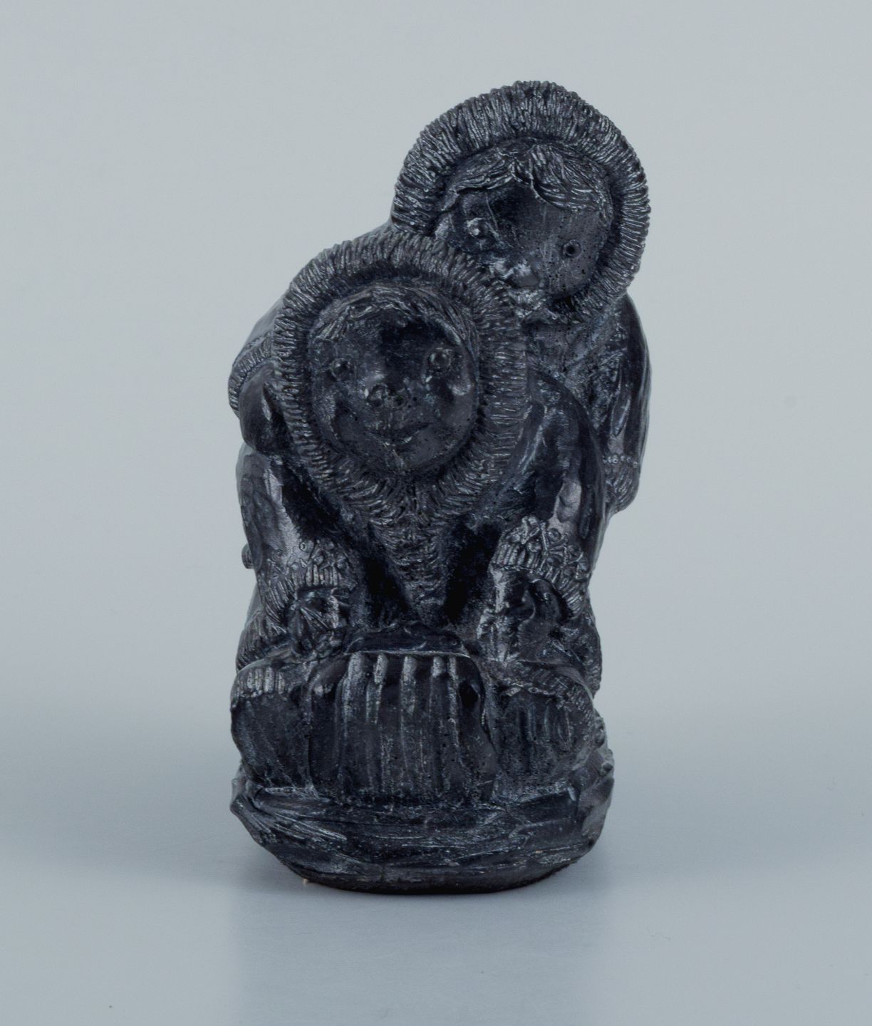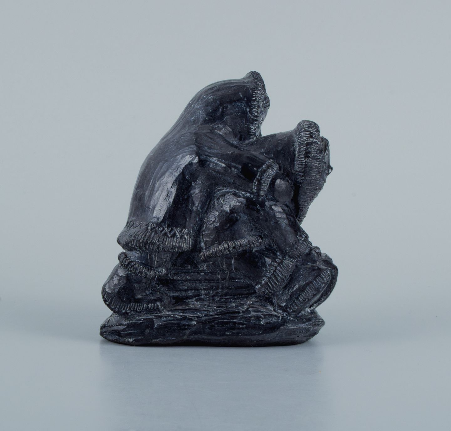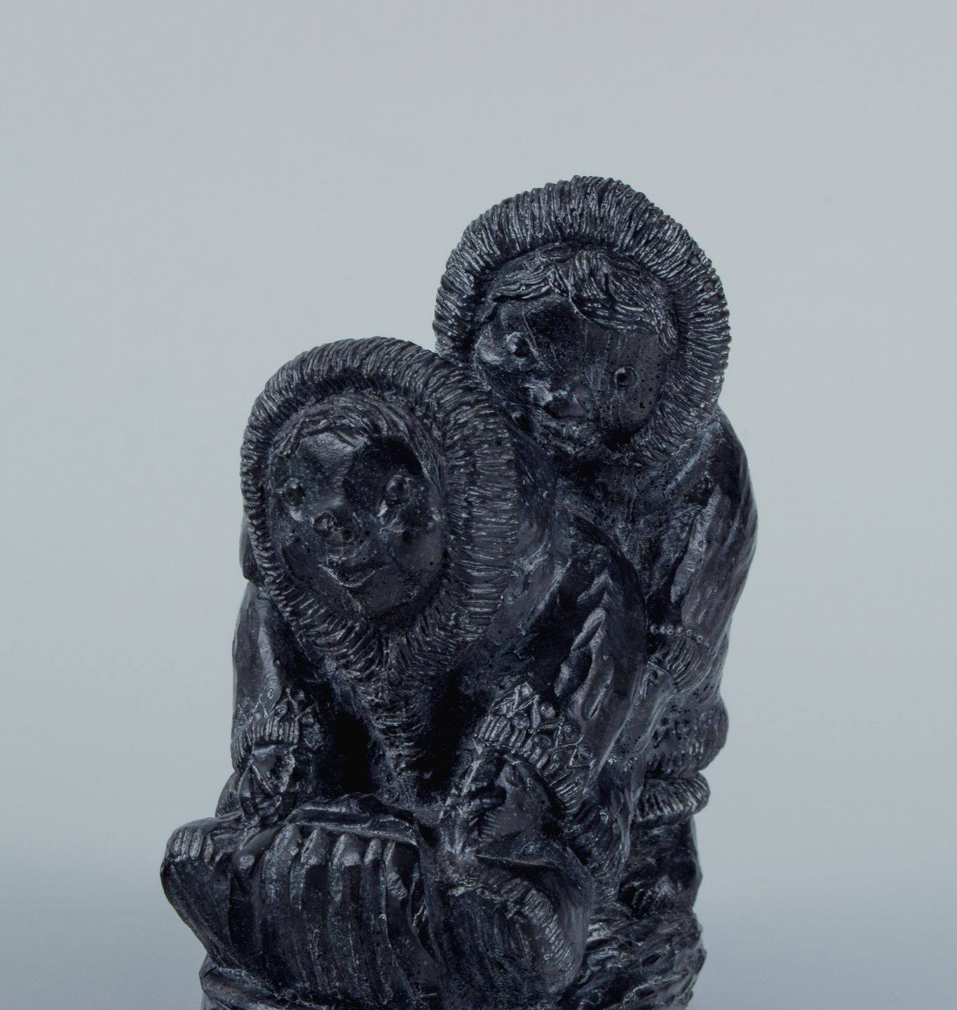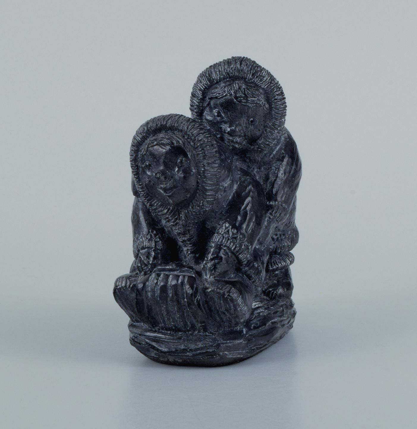 Grønlandica, Et par inuit-børn på slæde udført i fedtsten. Ca. 1970/80'erne. I god stand, brugspræg. Mærkat. Mål: L 8,0 x D 4,0 x H 8,5 cm.