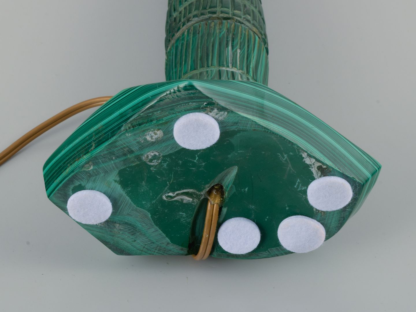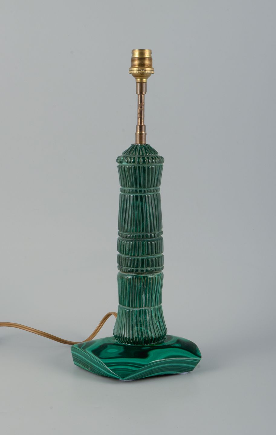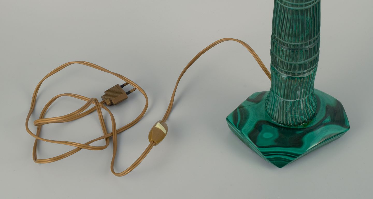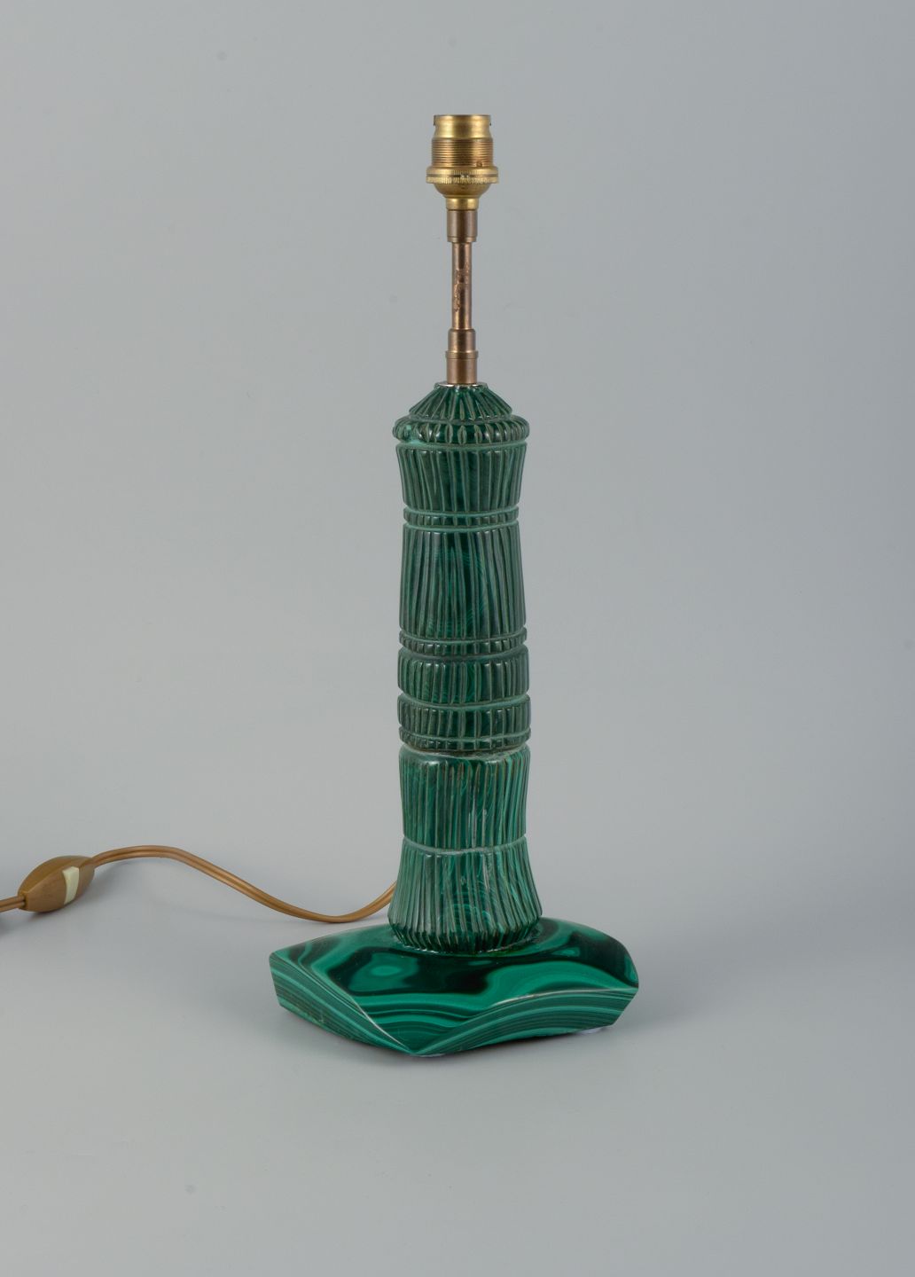 Fransk bordlampe i malakit. Midt 1900-tallet. I perfekt stand. Mål: H 39,0 (inklusiv fatning) x 15,5 cm.