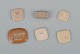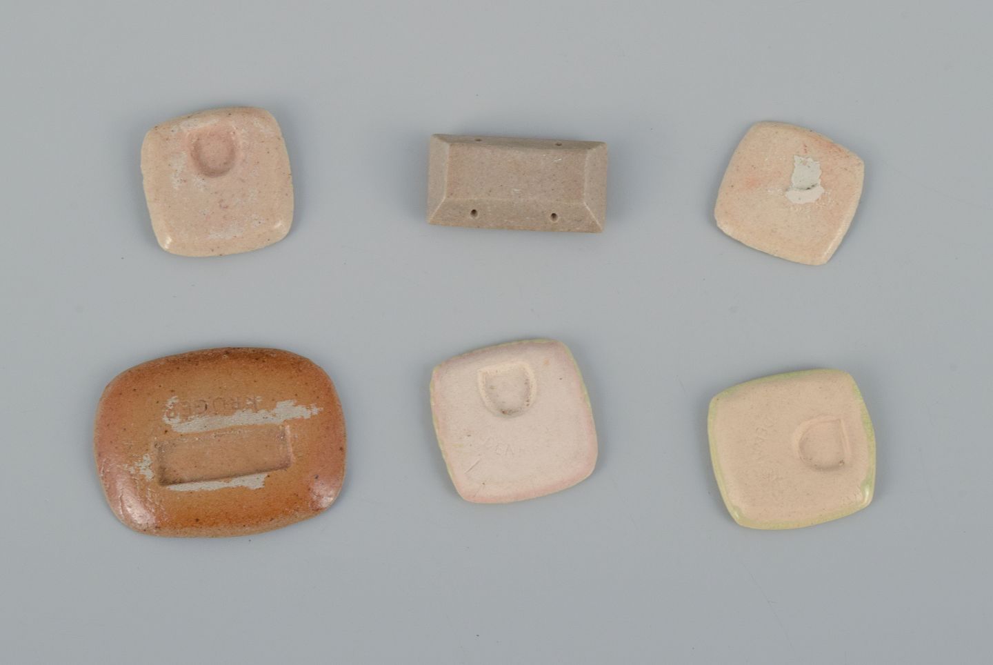 Six unique brooches in glazed stoneware in shades of yellow and brown.