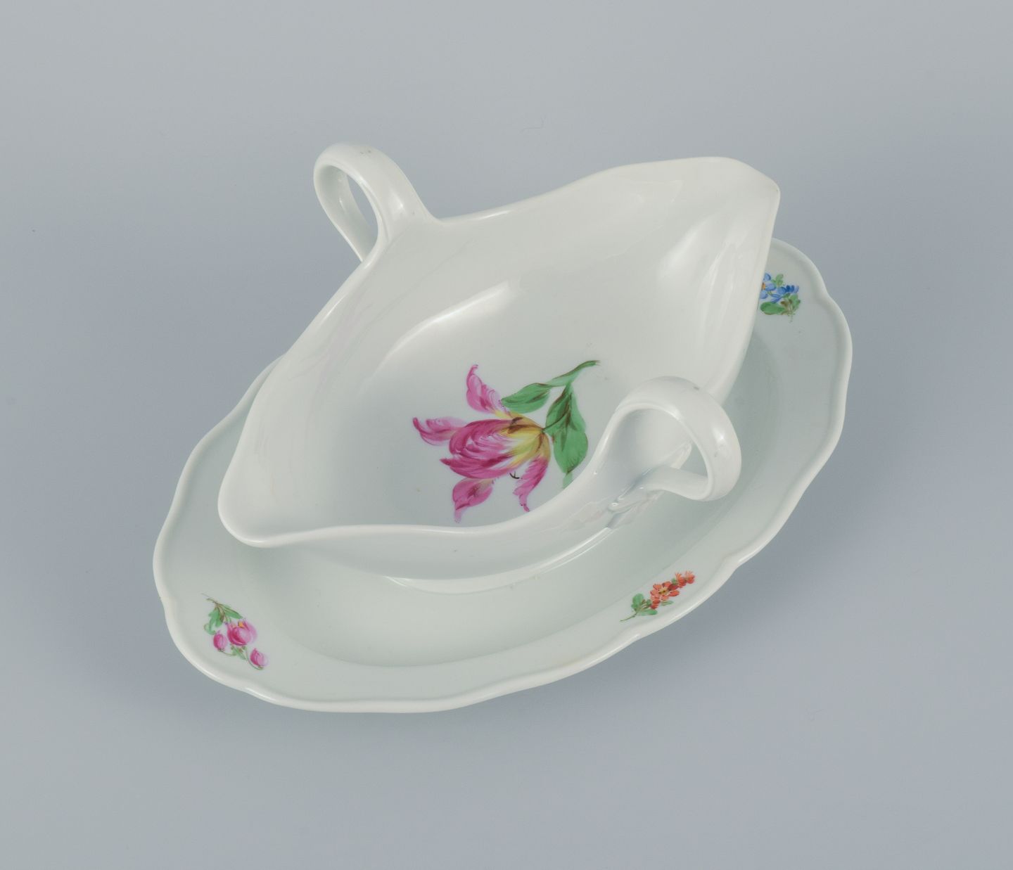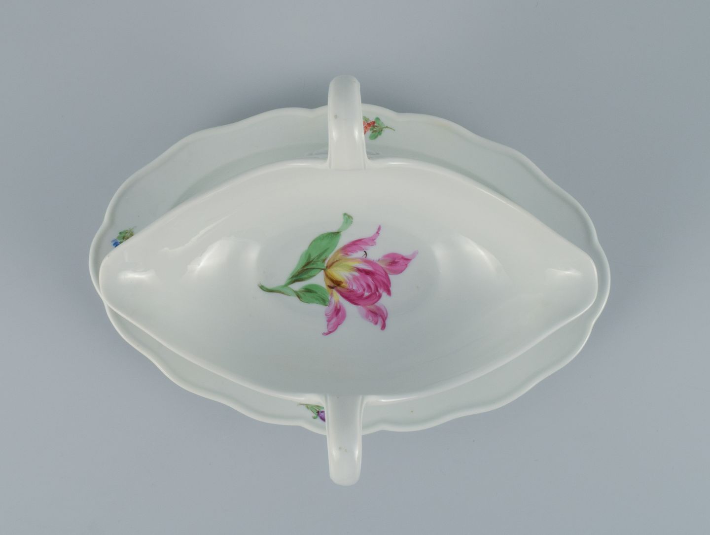 Meissen, Tyskland, saucekande på fod håndmalet med blomstermotiver i forskellige farver.