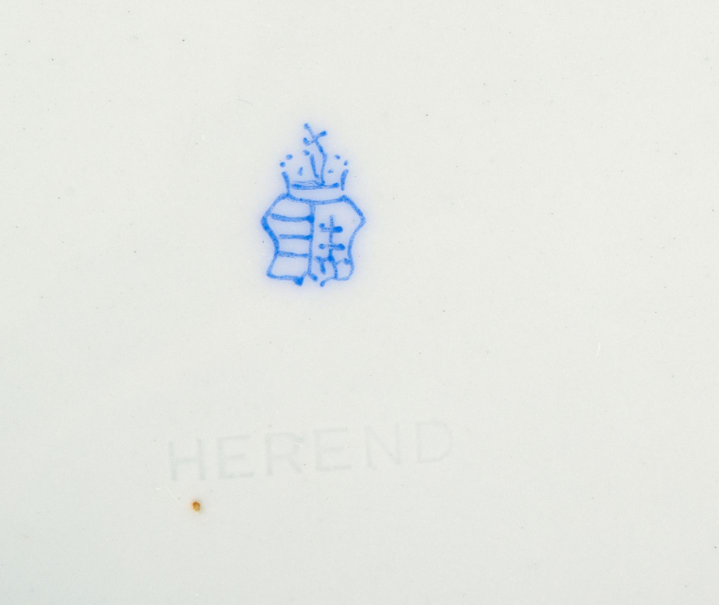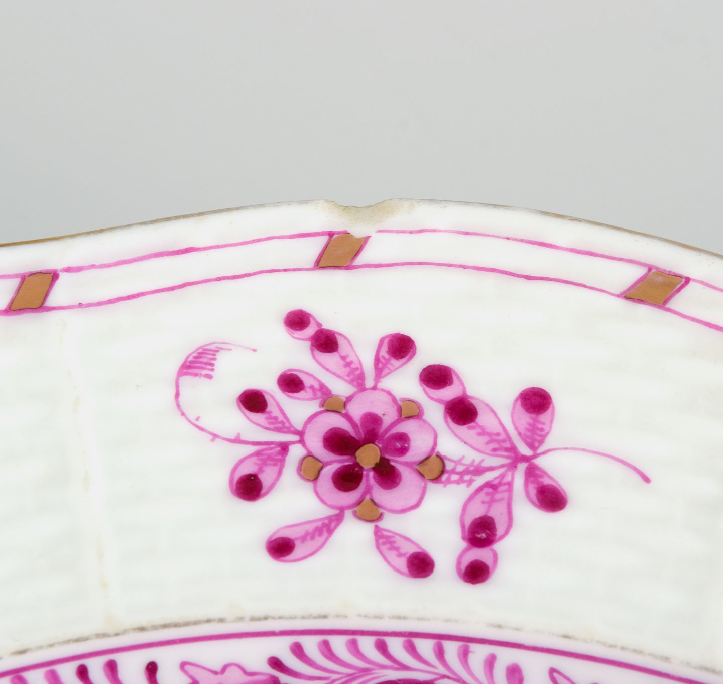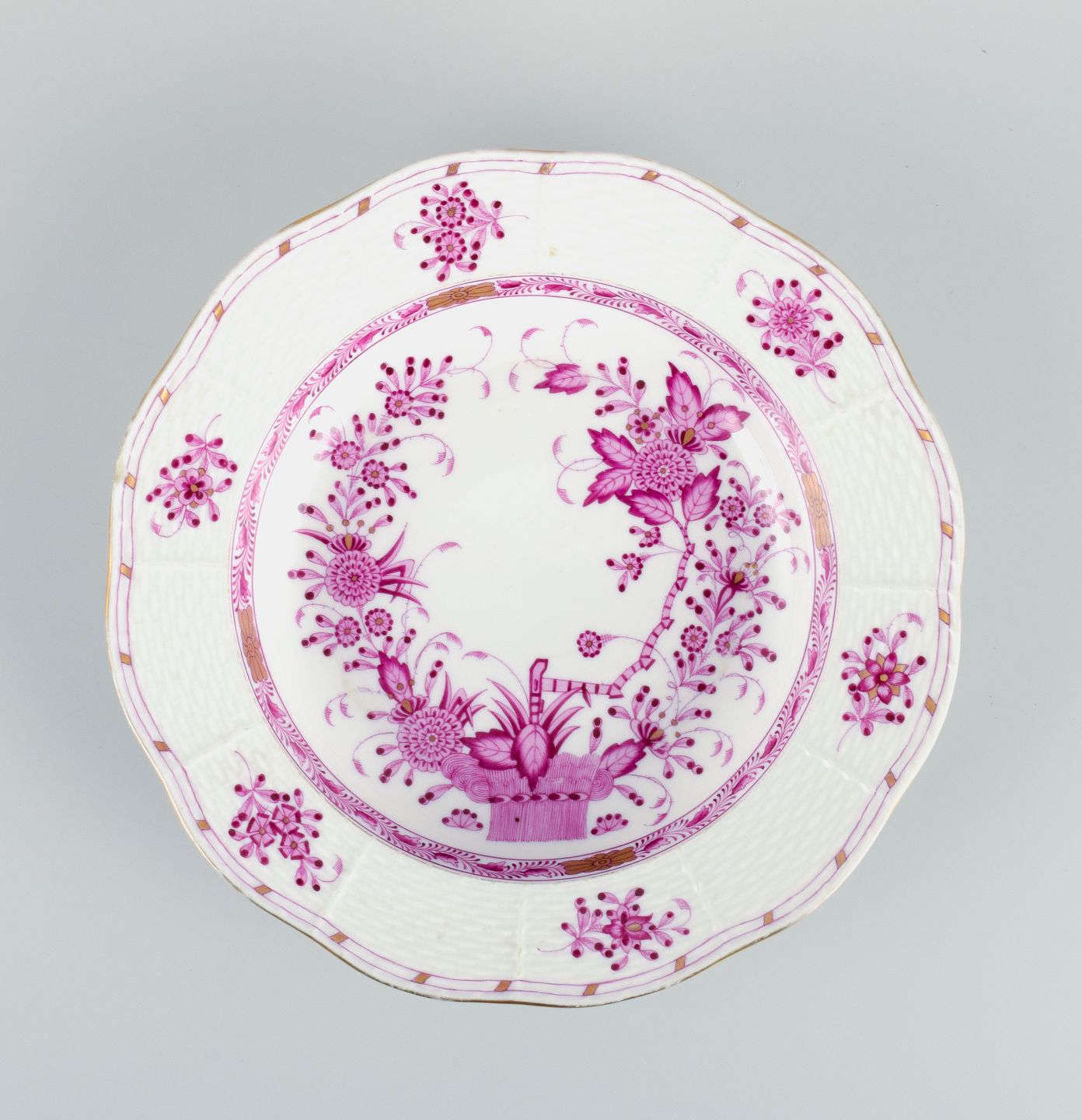 Herend, Indian Basket Raspberry, Ungarn, et sæt på to store dybe tallerkner. Håndmalet i purpur med guldekoration.