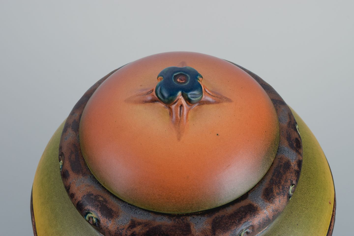 Ipsens Enke, skønvirke lågvase med glasur i orange og grønne toner. Modelnummer 541. 1920/30'erne. Stemplet. I flot stand. Mål: D 17,0 x H 25,0 cm.