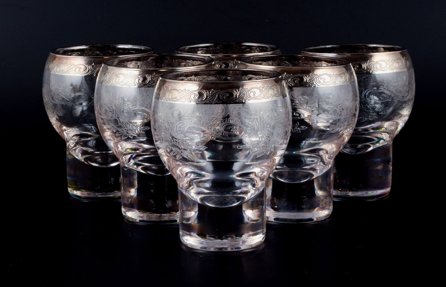 Murano, Italien, seks mundblæste og graverede ølglas med sølvkant. Midt 1900-tallet. I perfekt stand. Mål: H 10,0 x 8,0 cm.