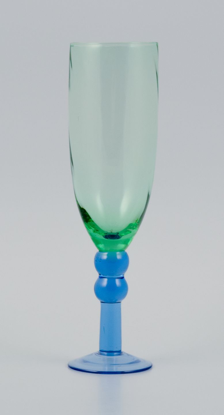 Skandinavisk glaskunstner, et sæt på seks mundblæste champagneglas i grønt og blåt glas. Sent 1900-tallet. I perfekt stand. Mål: H 22,0 x D 6,0 cm.