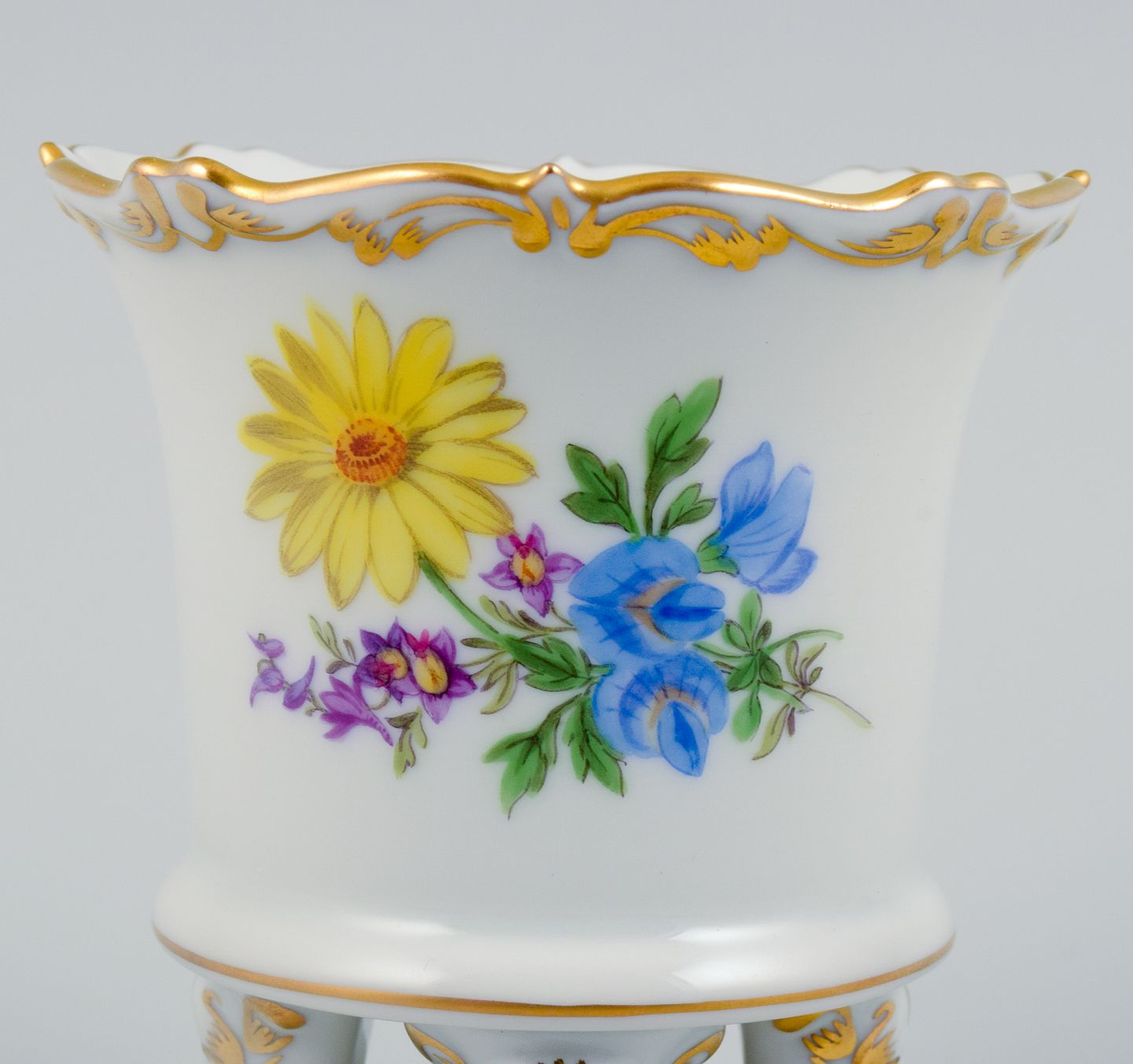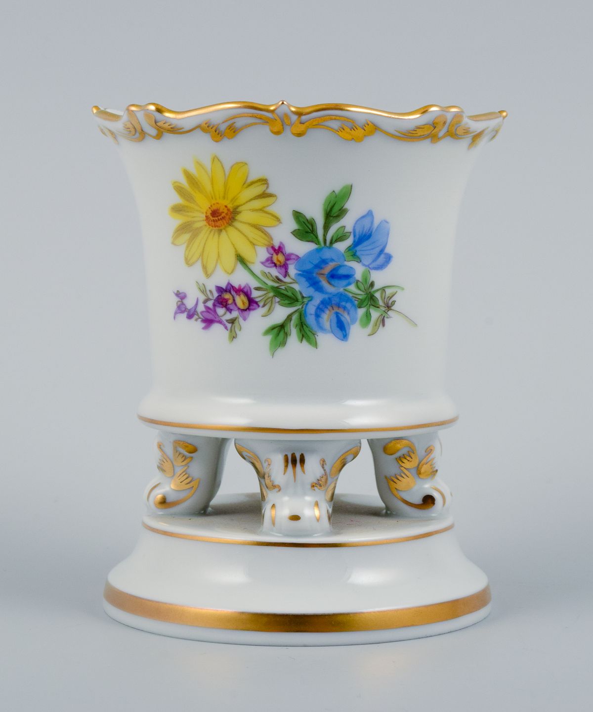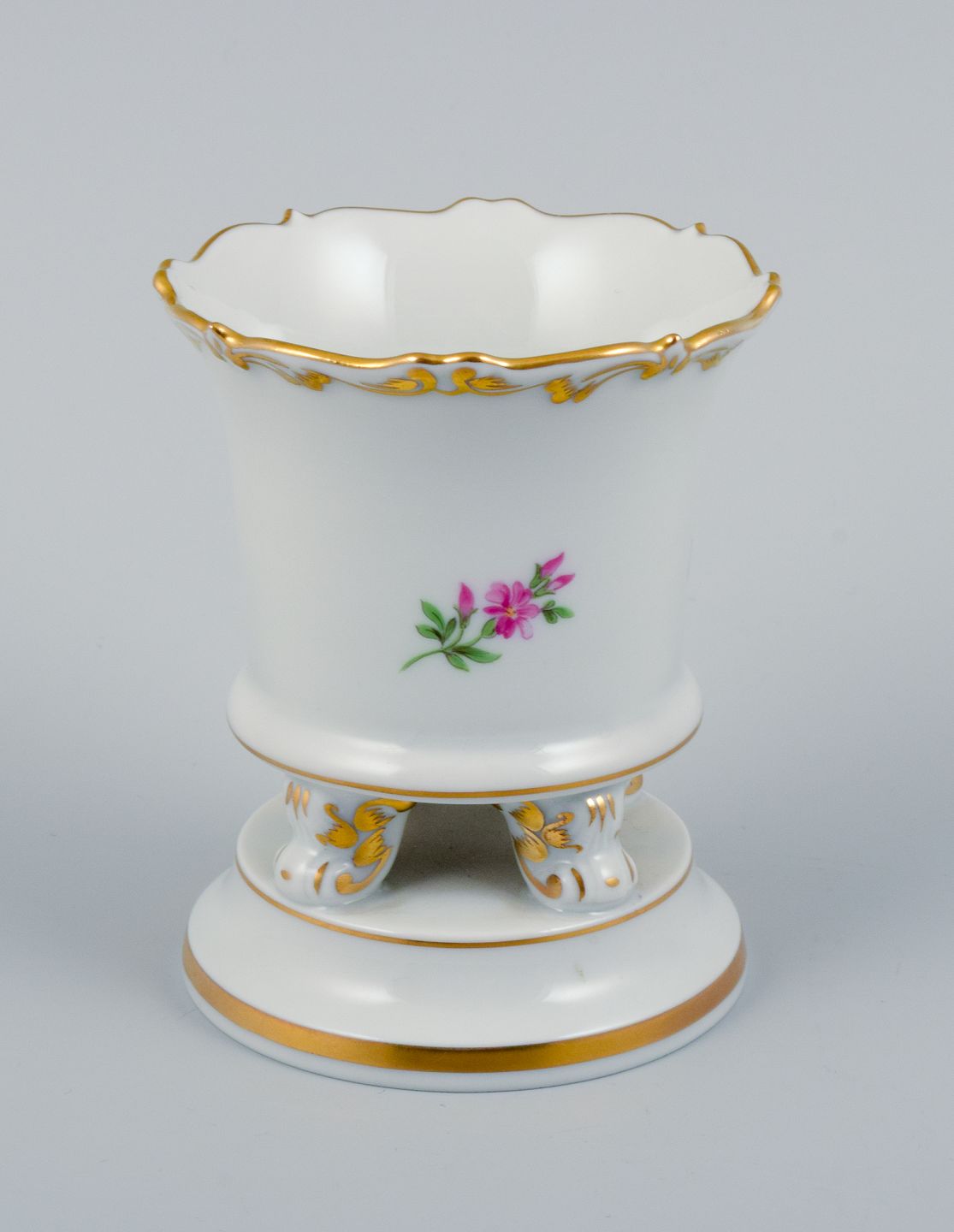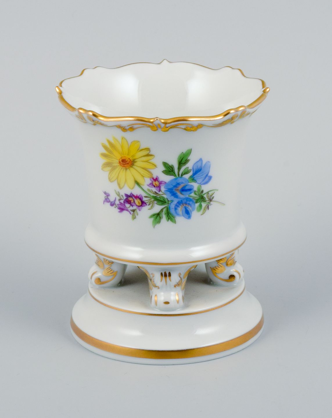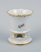 Meissen, Tyskland, lille vase på fire fødder håndmalet med blomstermotiv. Midt 1900-tallet. Perfekt stand. Første sortering. Stemplet. Mål: H 8,8 x D 7,0 cm.