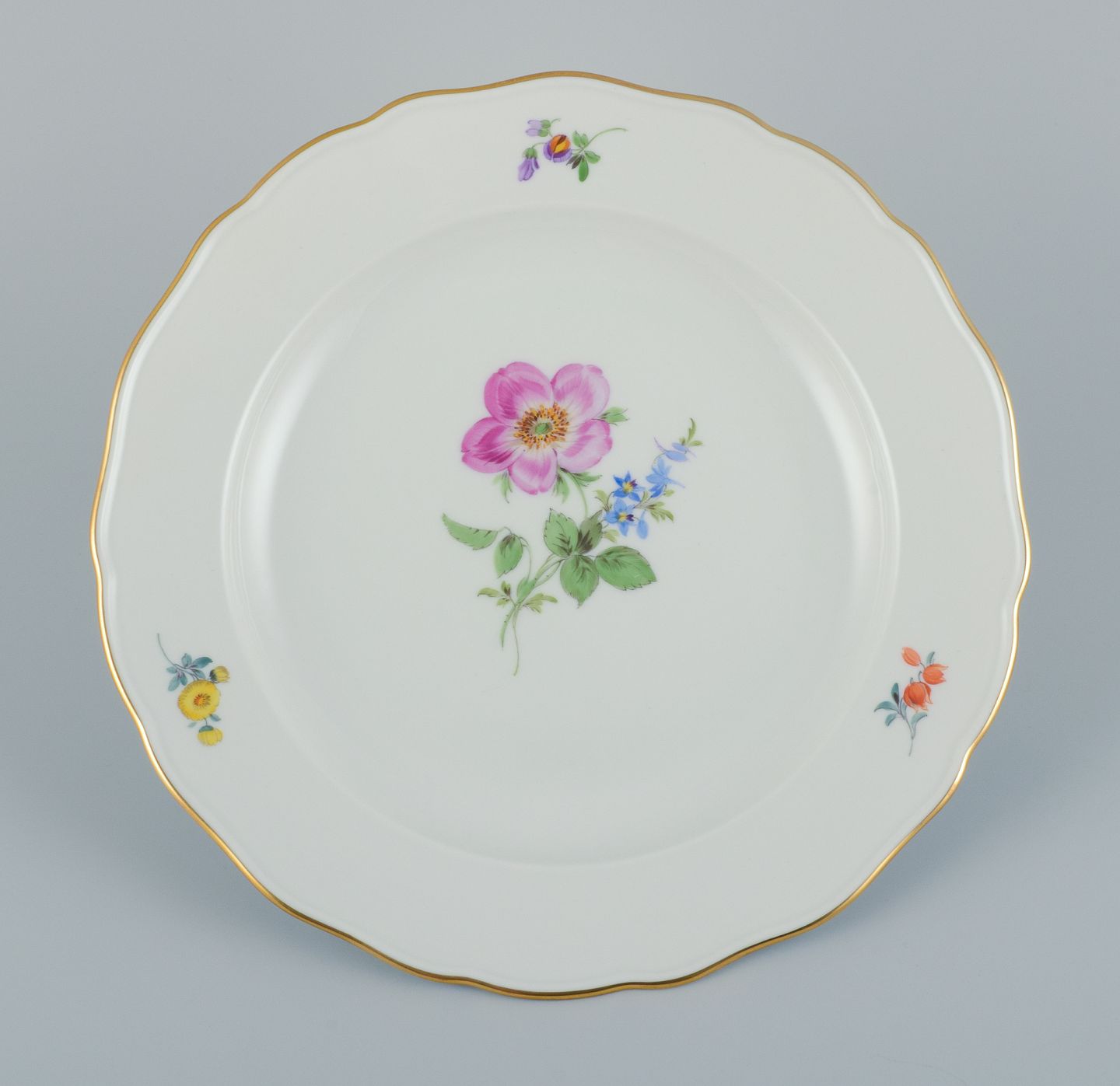 Meissen, Tyskland. Tre store middagstallerkner i porcelæn håndmalet med forskellige blomstermotiver og guldkant. Ca. 1930’erne. I perfekt stand. Tredje sortering. Stemplet. Mål: D 25,5 cm.
