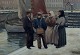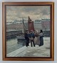 Søren Christian Bjulf (1890-1958), Denmark. Fish mongers in conversation with fishermen by dock (Gammel Strand) in Copenhagen.