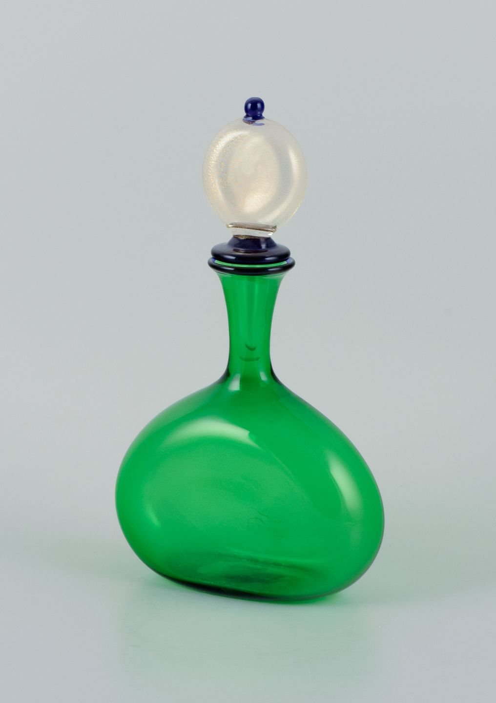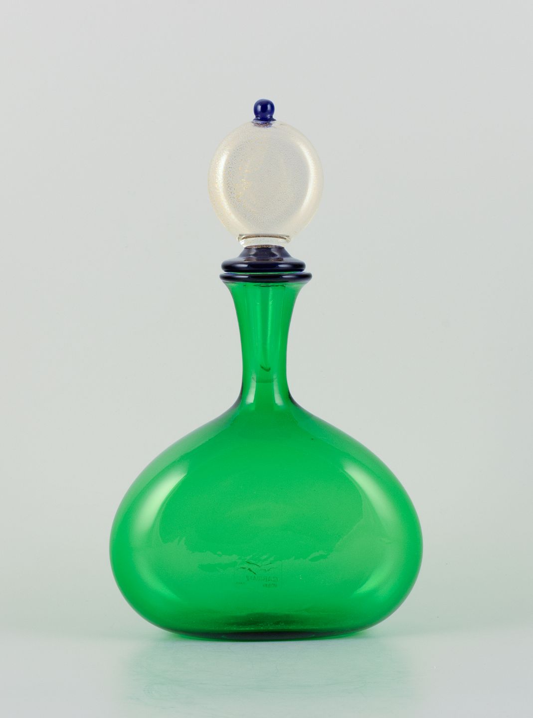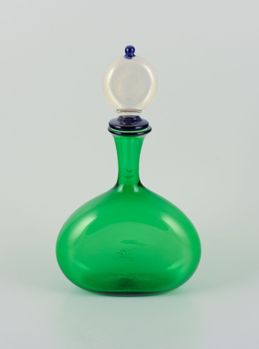 Gabbiani, Venedig, Italien, karaffel i grønt kunstglas med tilhørende prop. 1980’erne. Etiket. Perfekt stand. Mål: H 29,5 cm. x D 16,5 cm.