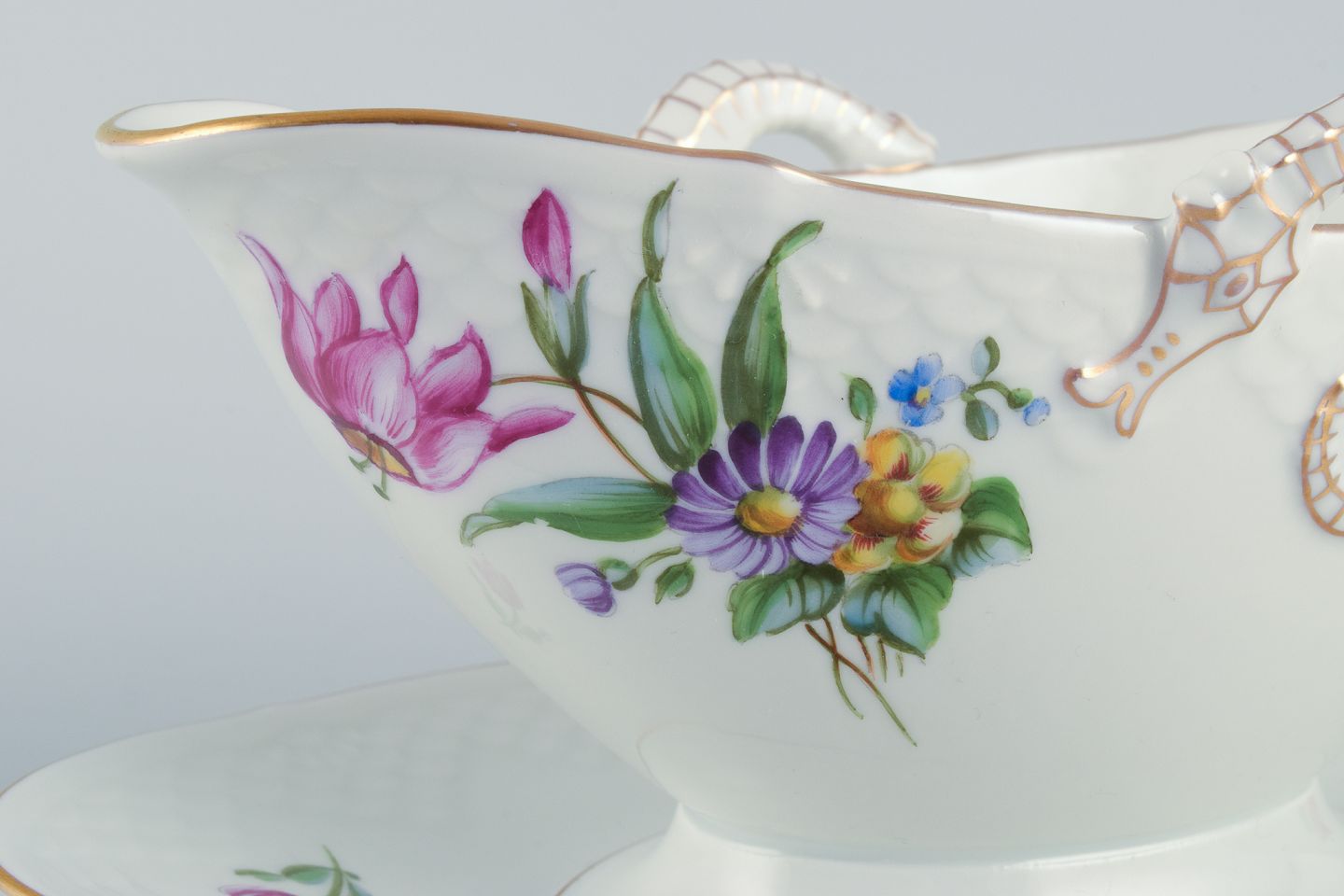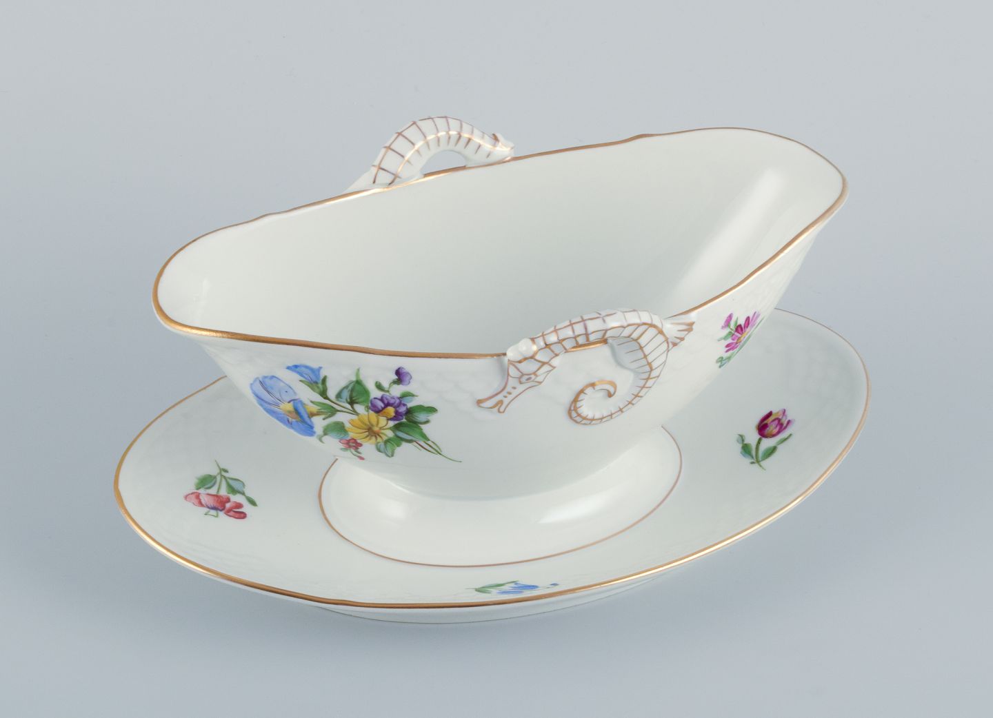 Bing & Grøndahl Saksisk Blomst, en håndmalet sauceskål med hanke i form af søheste. Ca. 1920/30’erne. Modelnummer 8 Stemplet. Første sortering. Perfekt stand. Mål: L 24,5 cm. x H 10,0 cm.