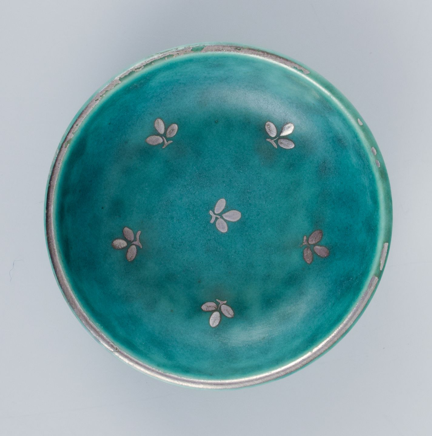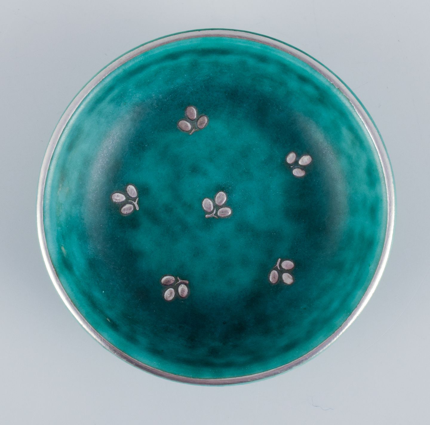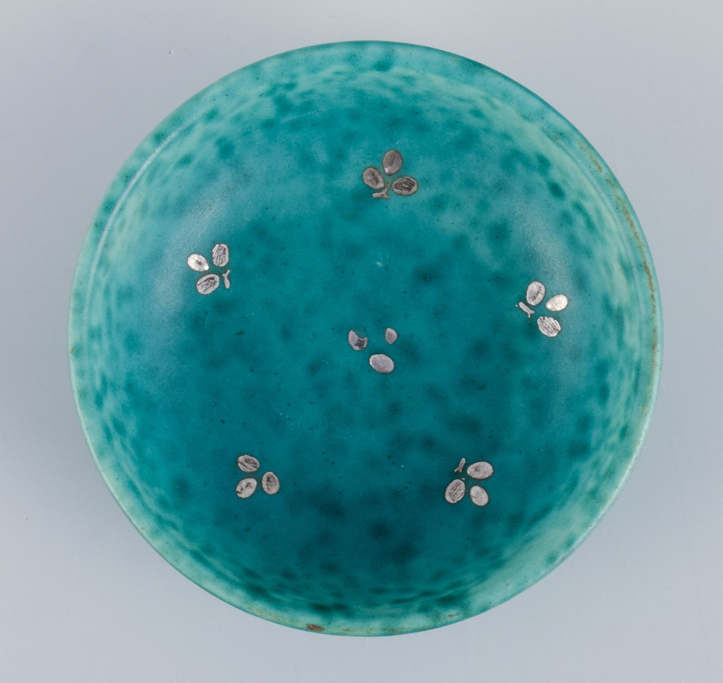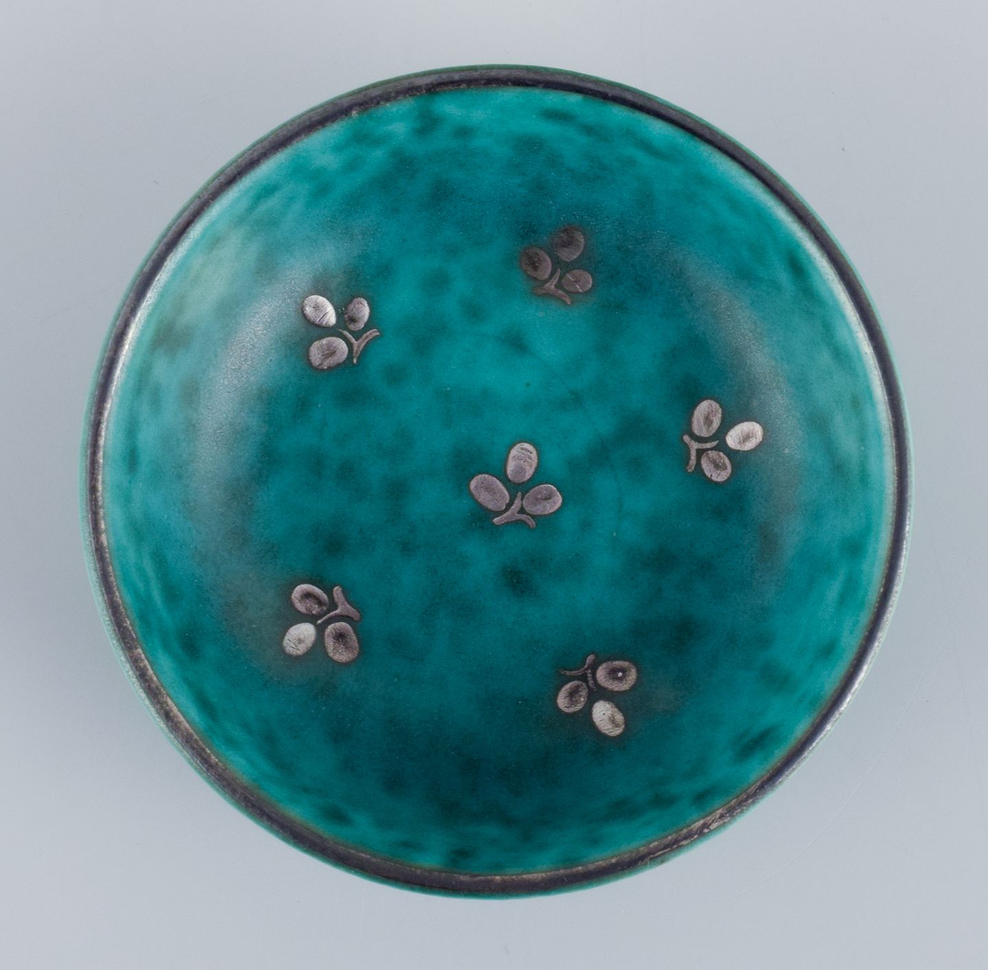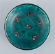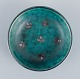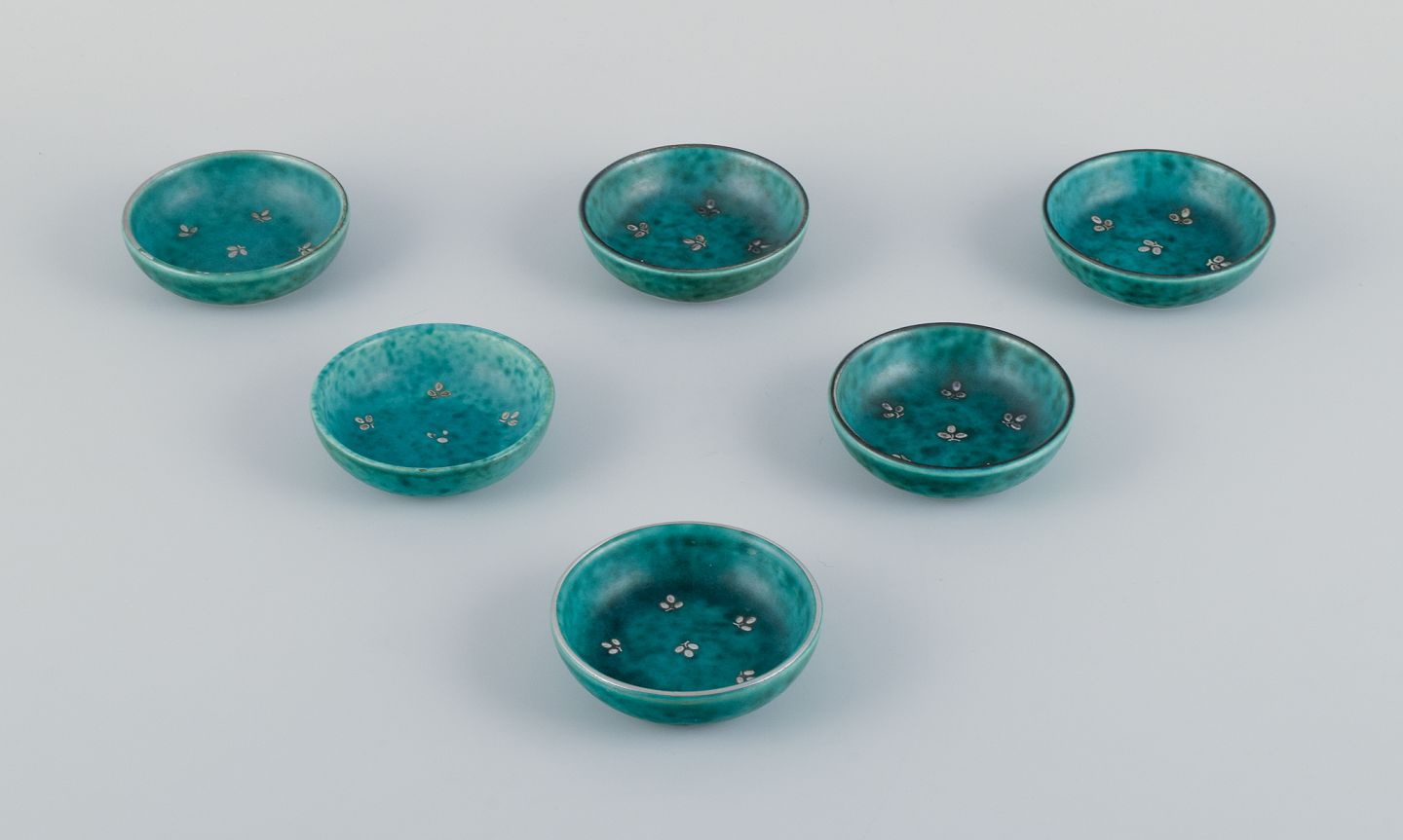 Wilhlem Kåge for Gustavsberg, et sæt på seks ”Argenta” keramikskåle. Glasur i grønne toner med blade i for af sølvindlæg.