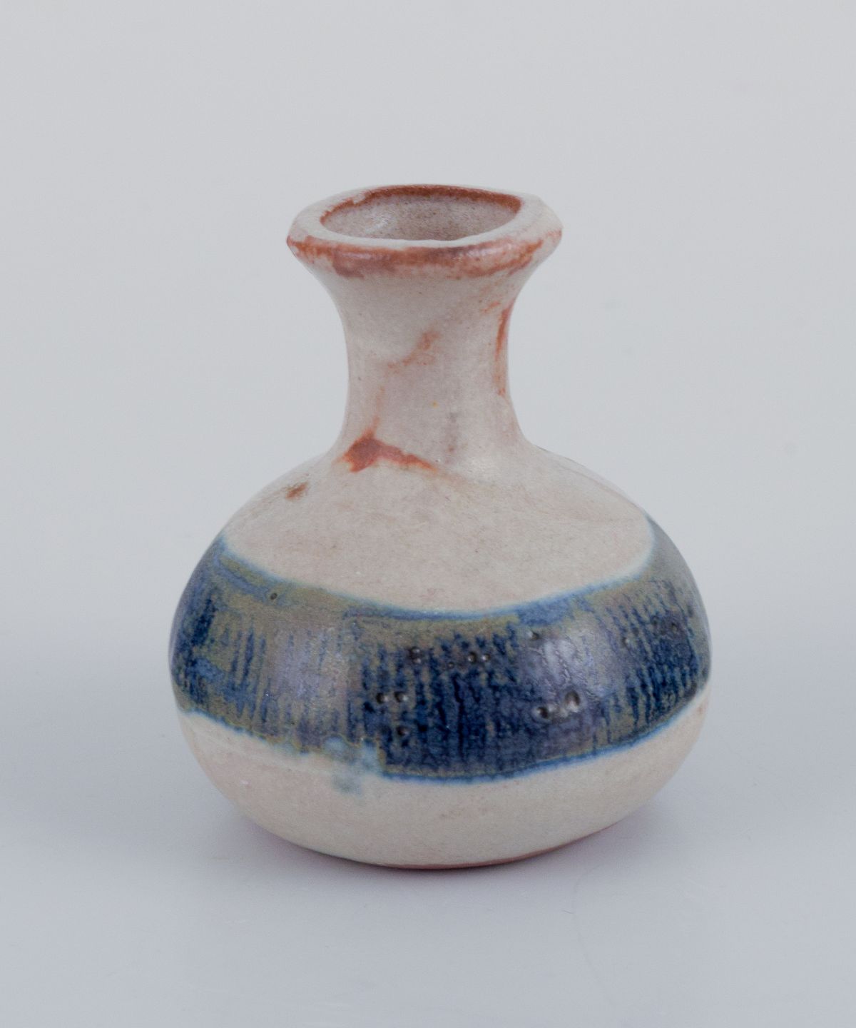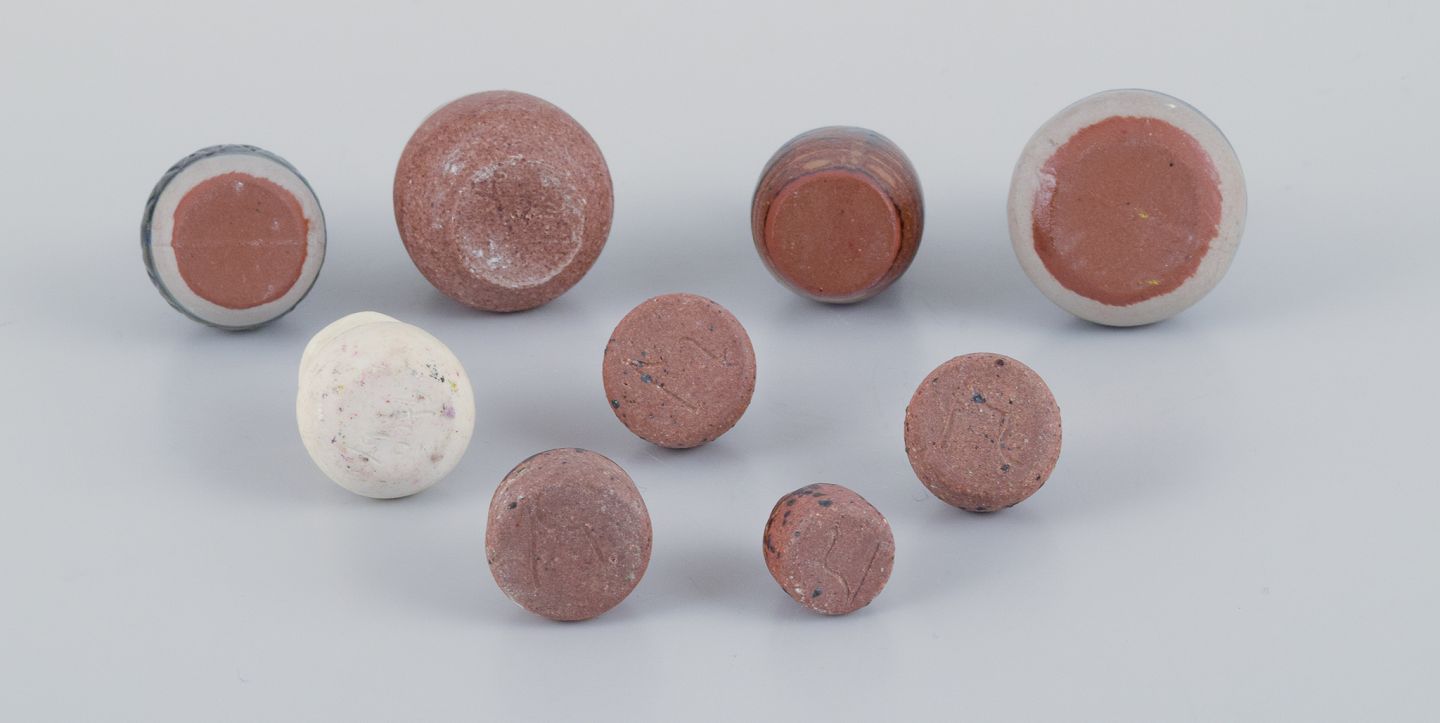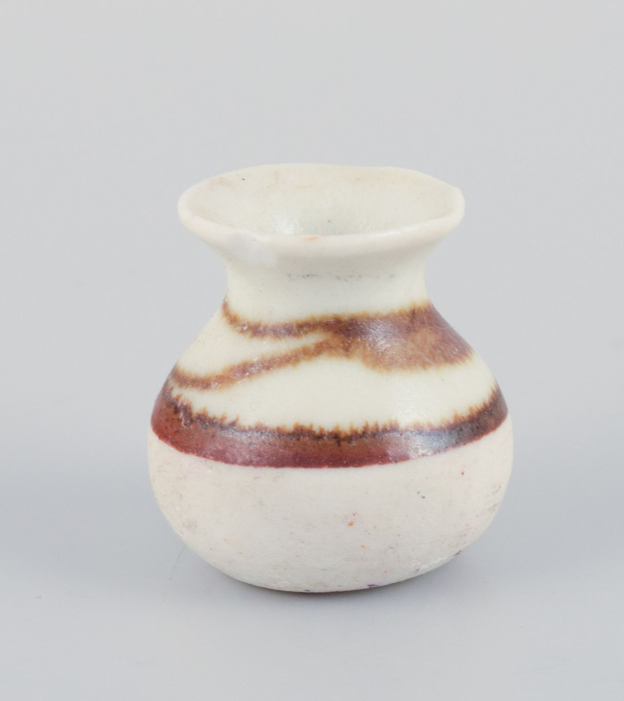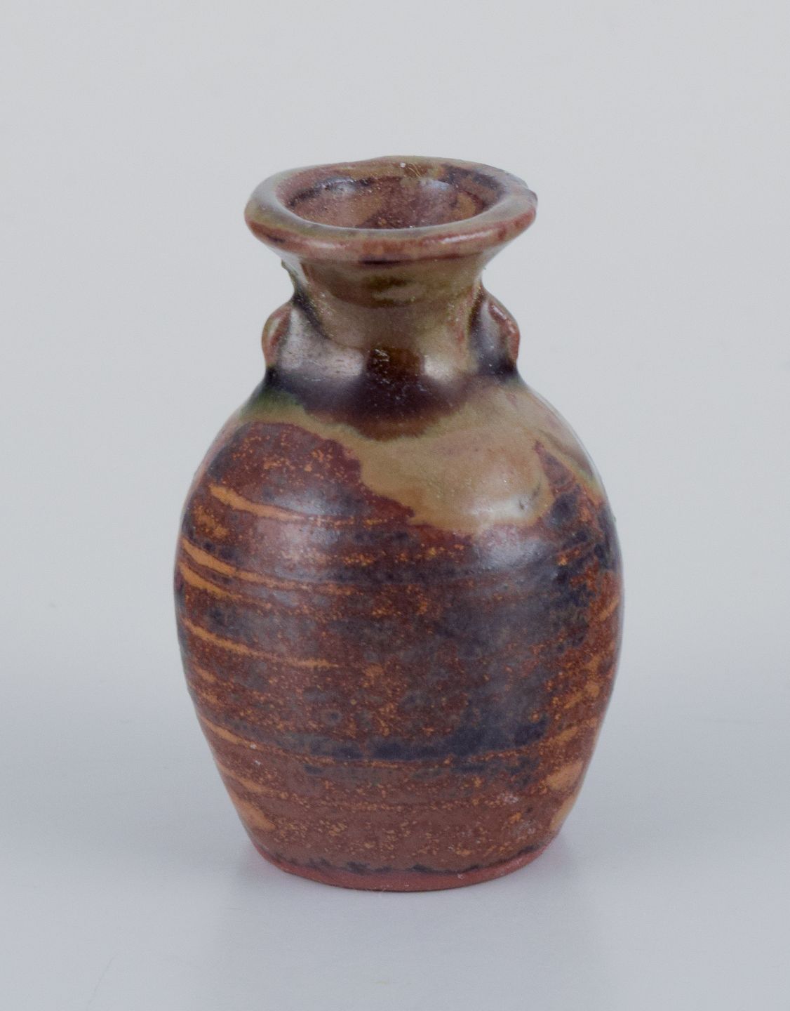 Stouby Keramik, Denmark, a collection of nine miniature ceramic vases with glaze in brown and sandy tones. Handmade.