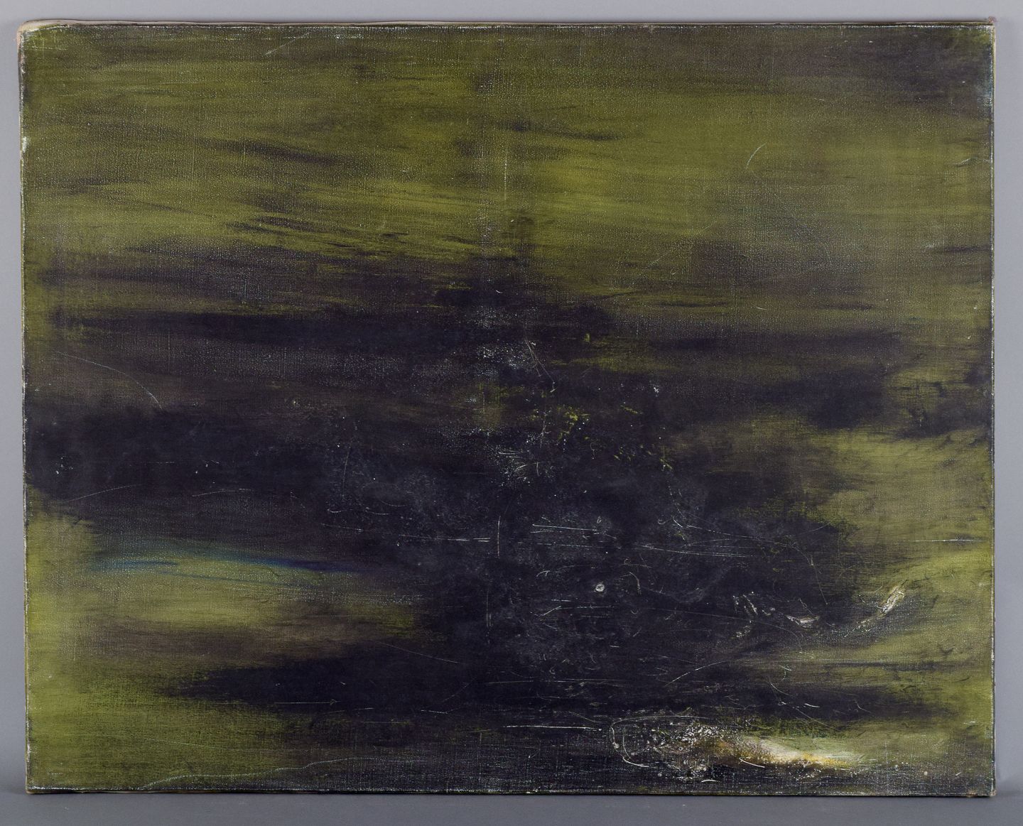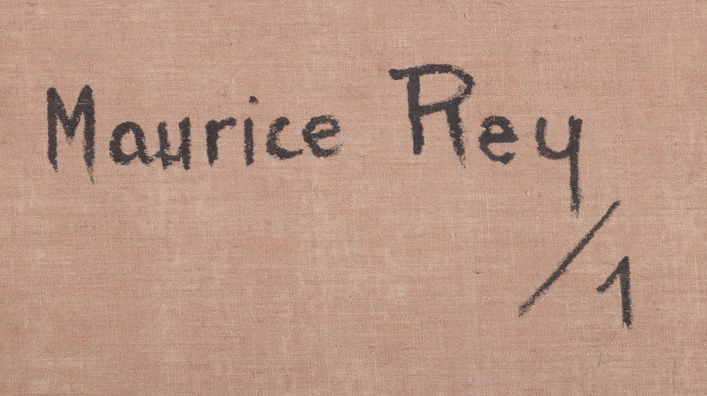 Maurice Rey (1930), spansk/fransk kunstner, olie på lærred. Abstrakt komposition. Stilrent maleri i grønne og sorte toner.