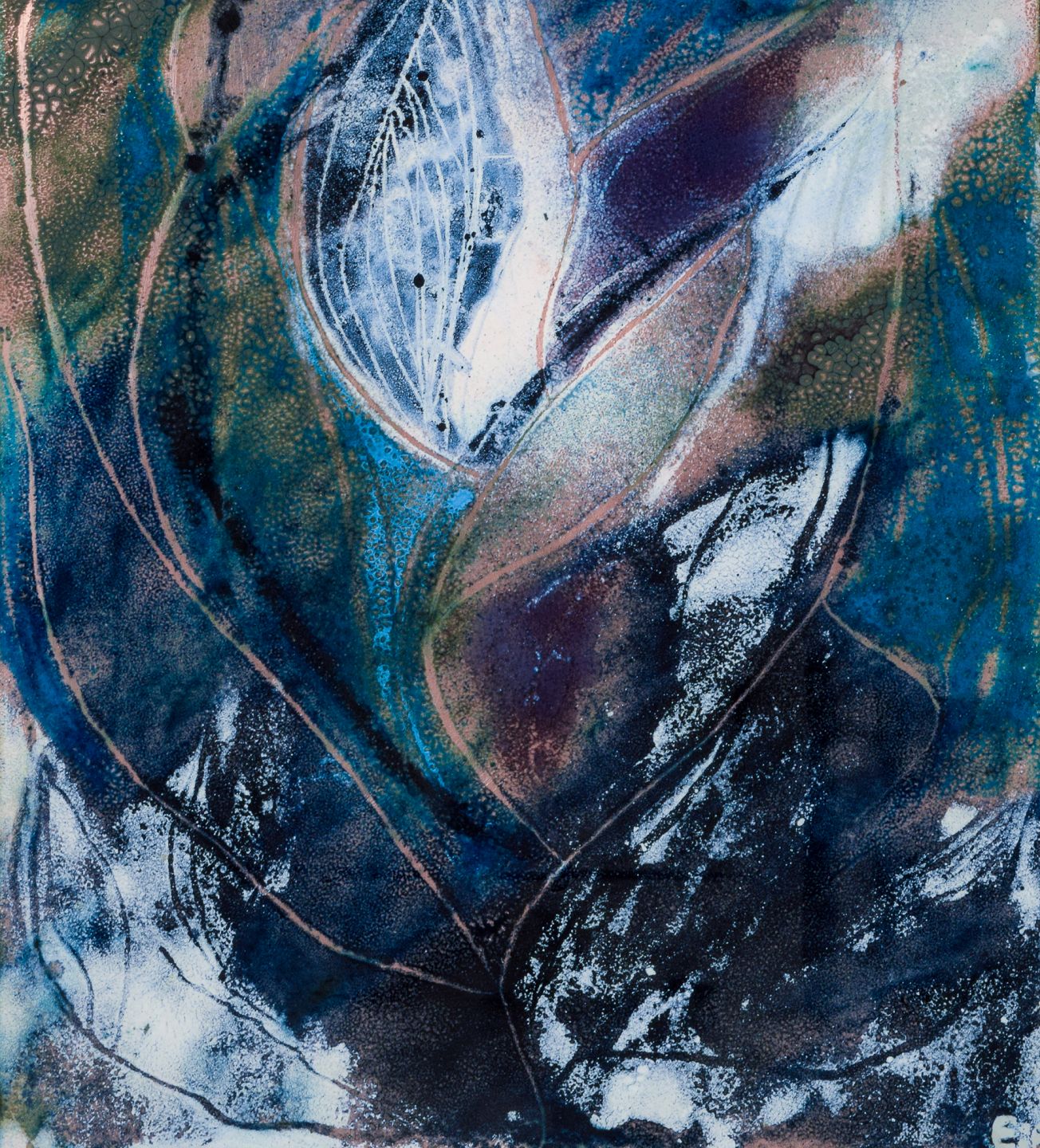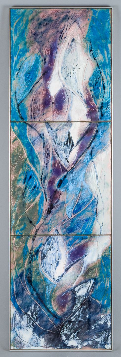 Bodil Eje, emalje på metal opsat på plade. Tredelt abstrakt komposition. Ca. 1960’erne. Signeret Eje. Perfekt stand. Total: B 31,0 cm. x H 102,0 cm.