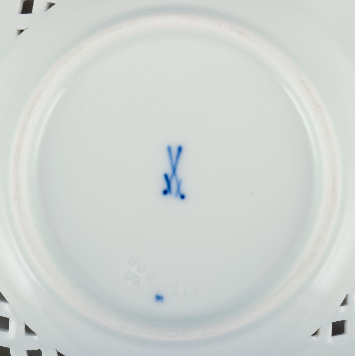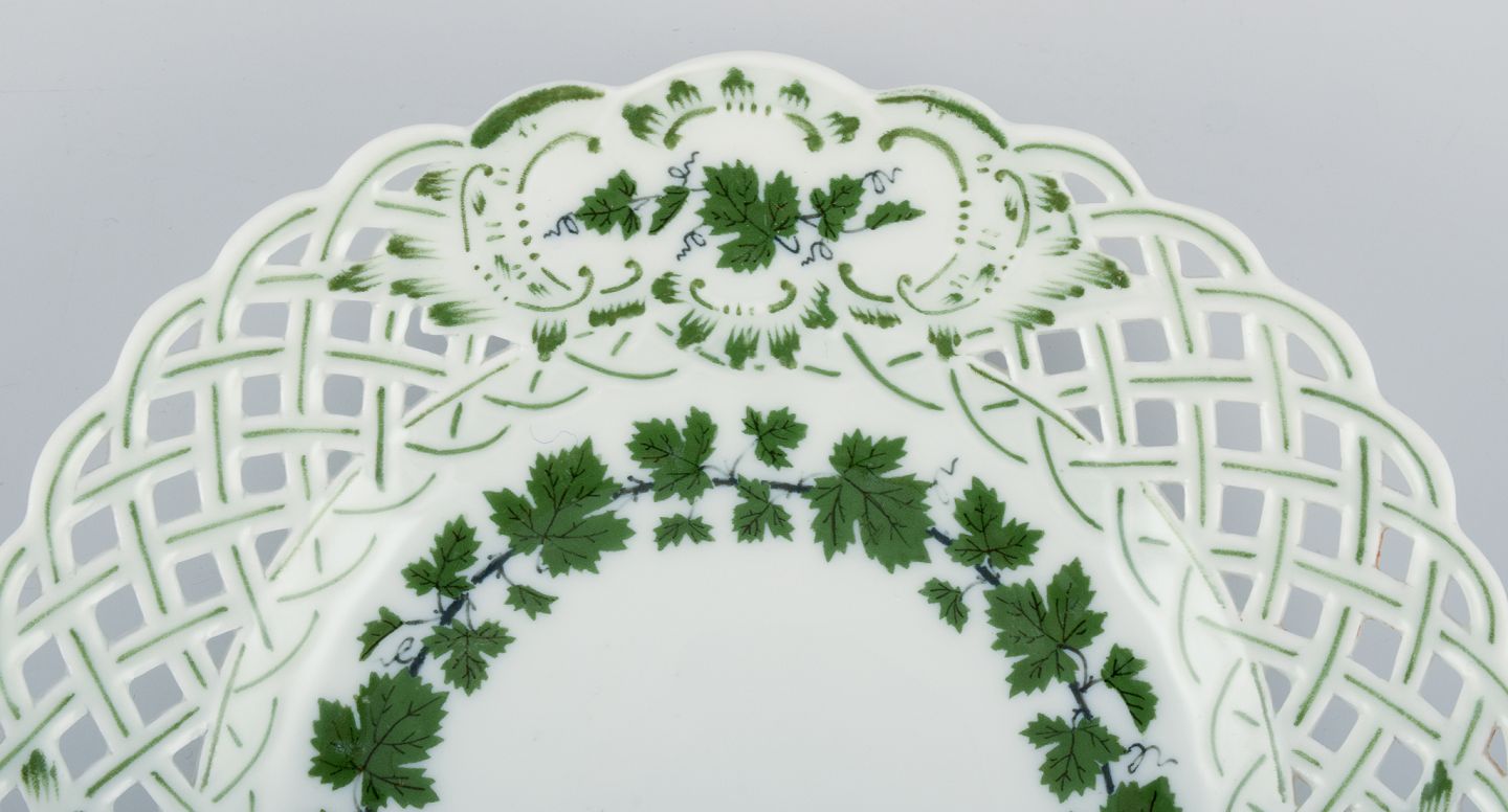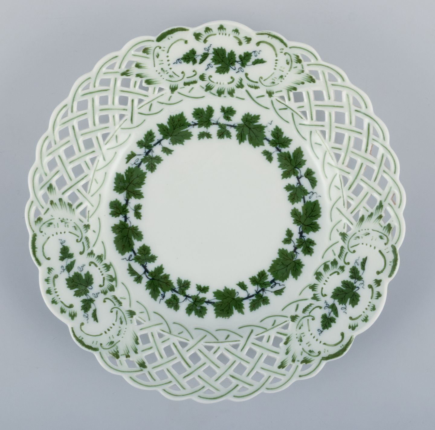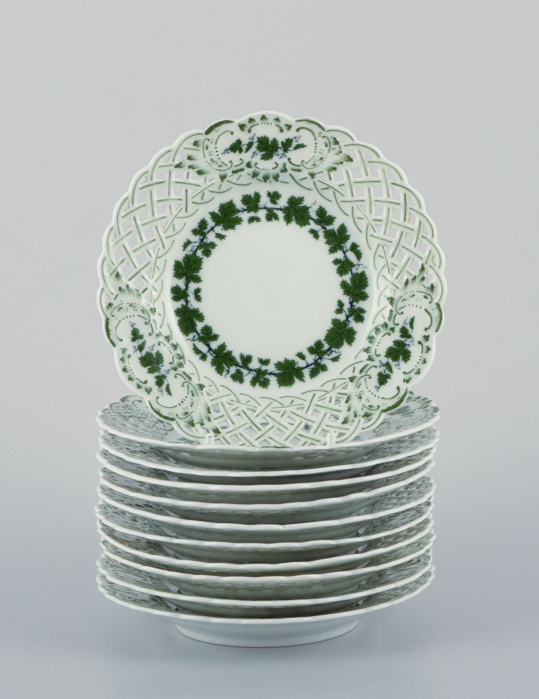 Meissen, Germany, Green Ivy Vine, a set of eleven small plates with reticulated edges. Hand-painted. 1930/40s. Marked. First factory quality. In perfect condition. Dimensions: D 15.2 cm.