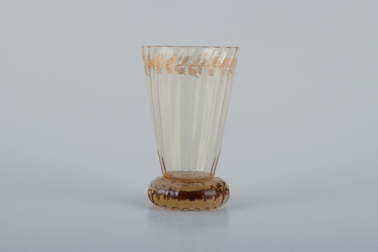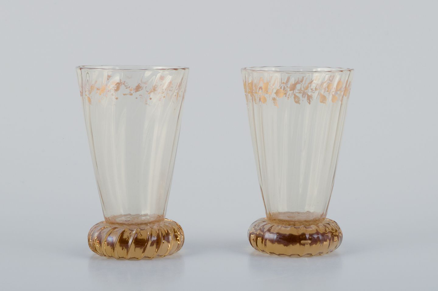 Emile Gallé (1846-1904), fransk kunstner og designer. To små krystalglas hånddekoreret med blade i guld. 1870/80’erne Signeret: "Cristalleries d'Emile Gallé, Nancy" Perfekt stand. Mål: H 8,7 cm. x B 5,2 cm.