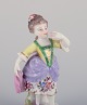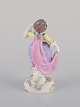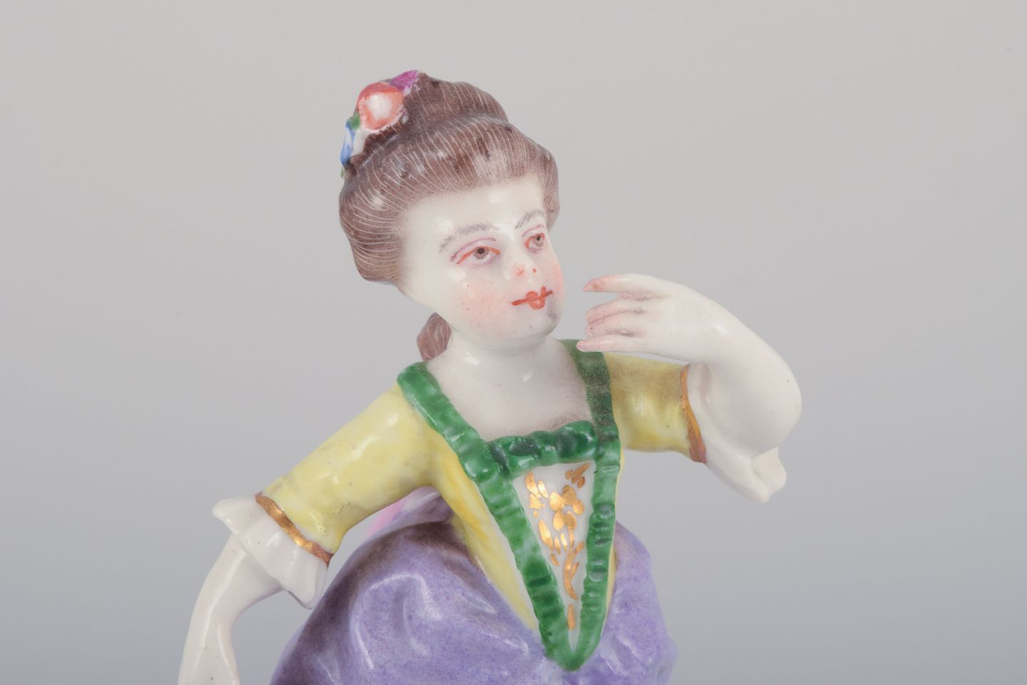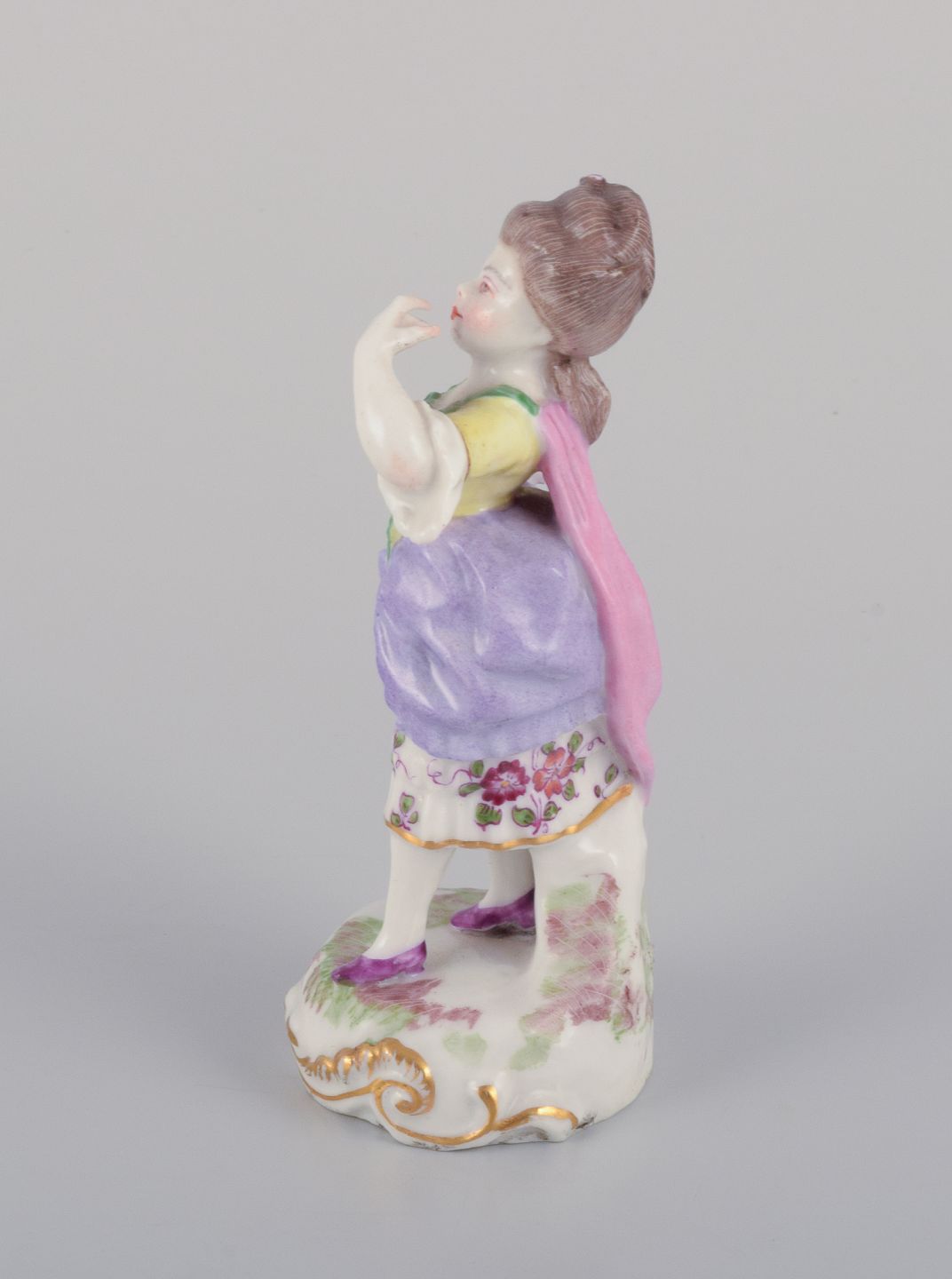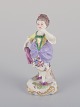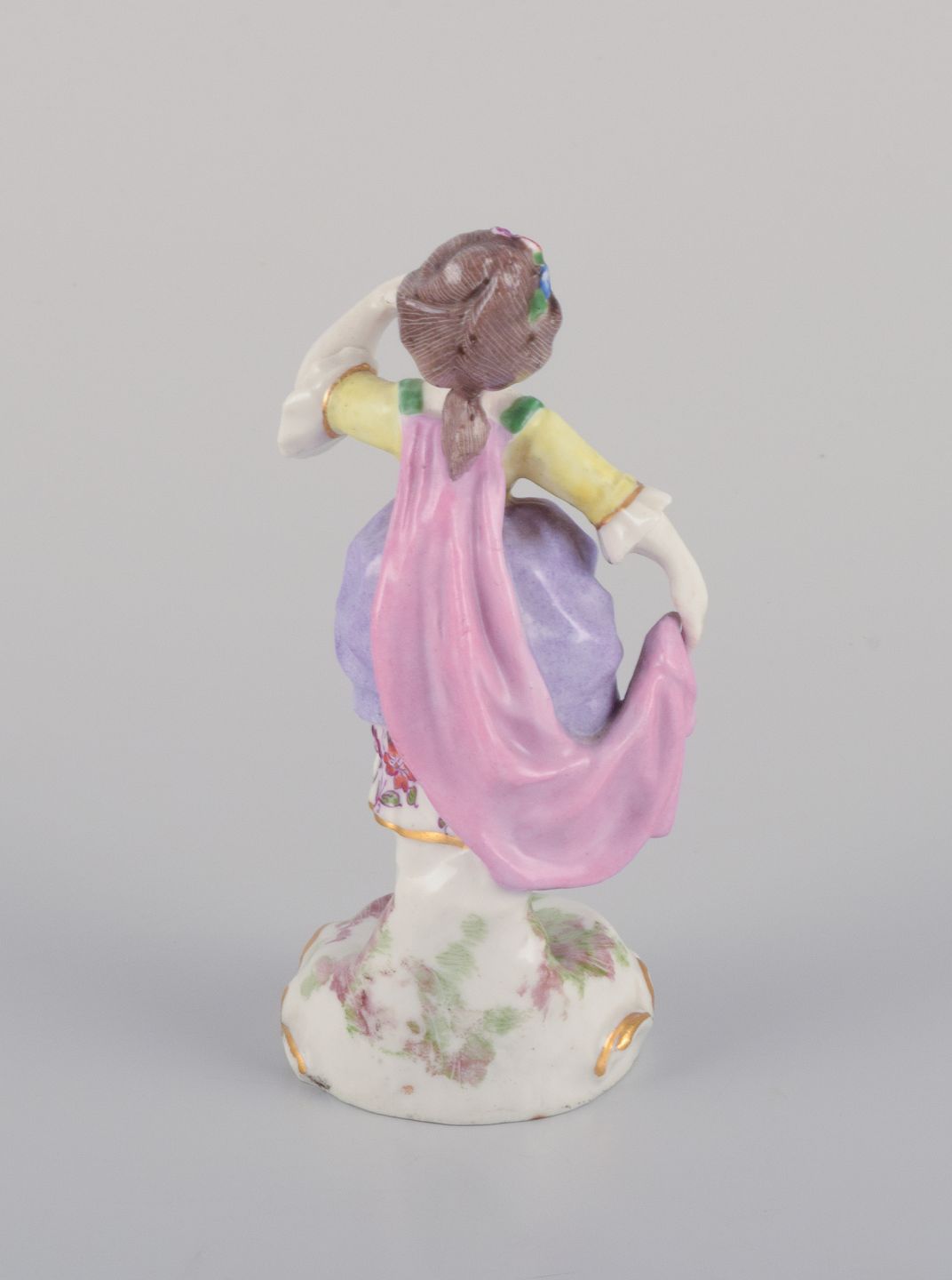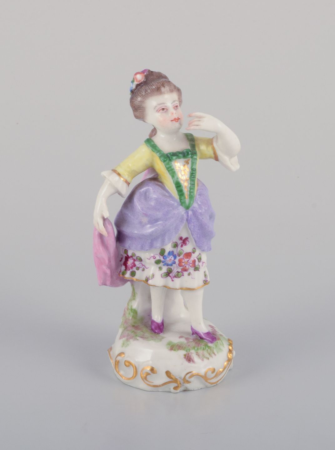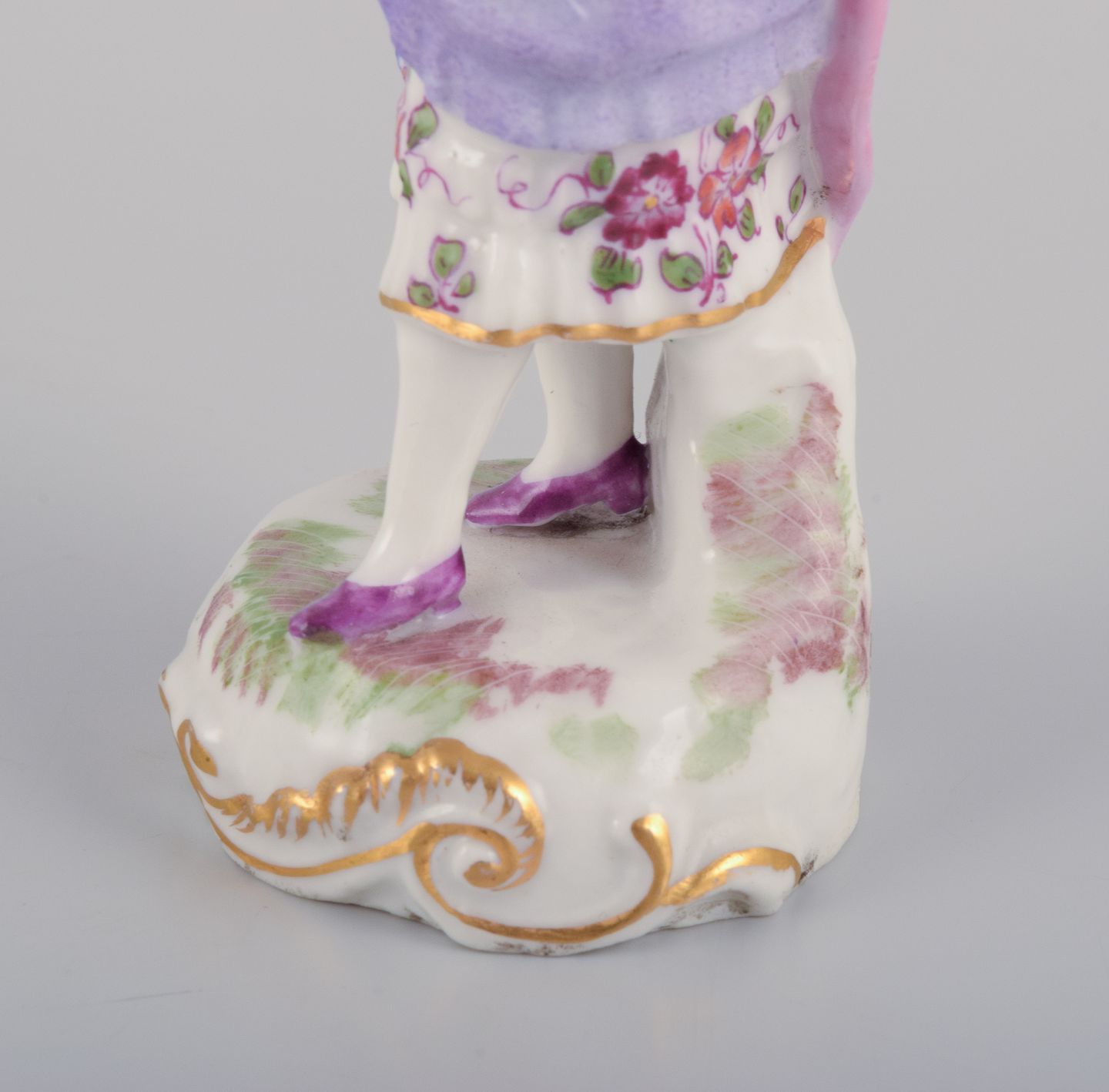 Antik tysk porcelænsfigur. Ung kvinde i fine klæder. Håndmalet i polykrome farver. 1800-tallet. Stemplet. I flot stand. Tommelfinger på venstre hånd mangler. Mål: H 11,5 cm. x D 5,5 cm.