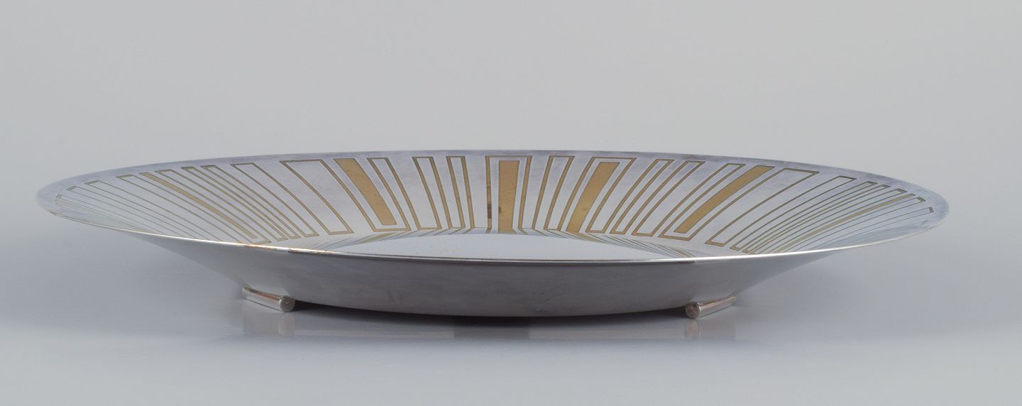 WMF, Tyskland. Stor ”Ikora” Art Deco skål på tre fødder i nysølv indlagt med messing.