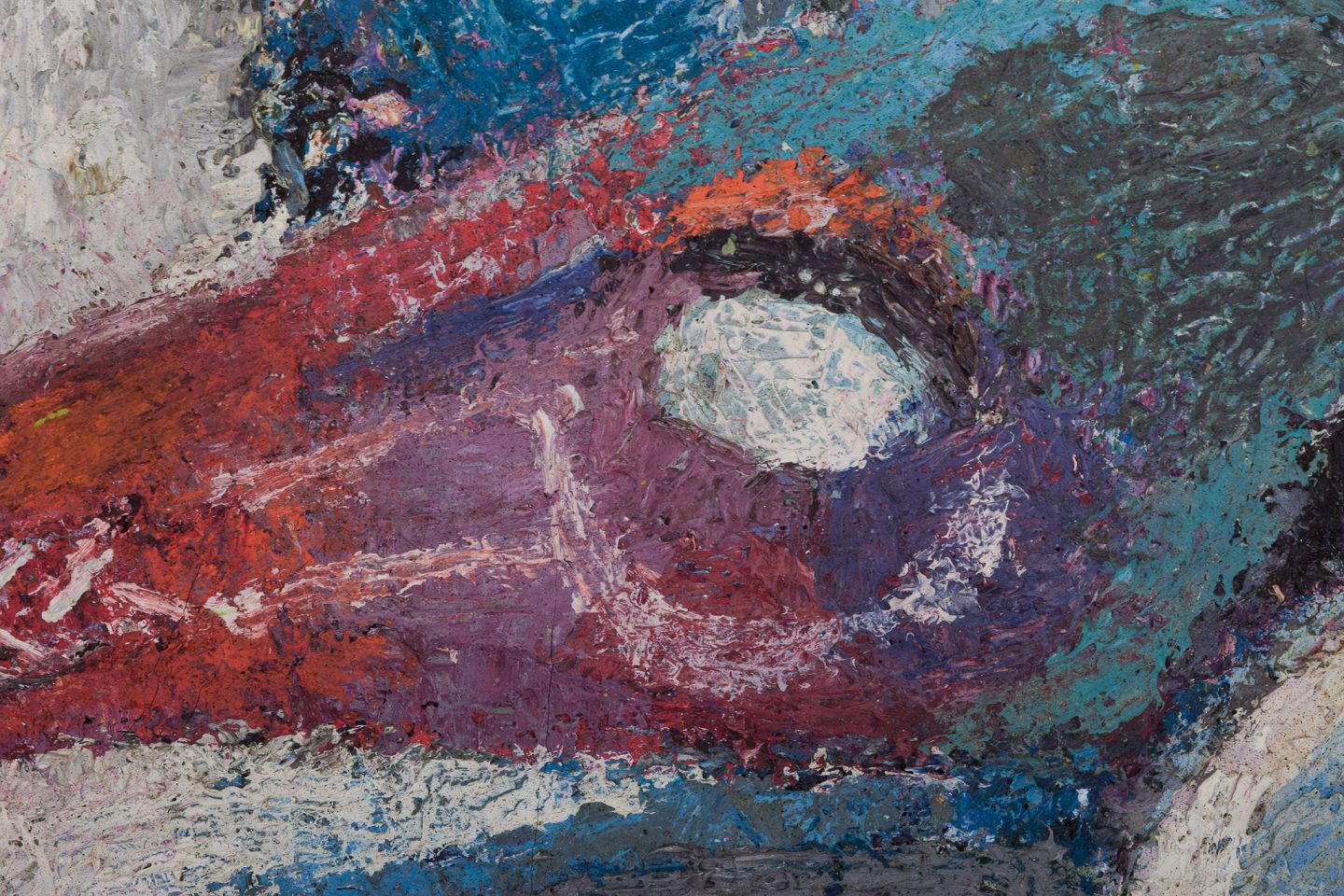 Maj Hemberg, svensk kunstner, olie på plade. Abstrakt komposition. Koloristisk palette. Malet med pastose penselstrøg.
