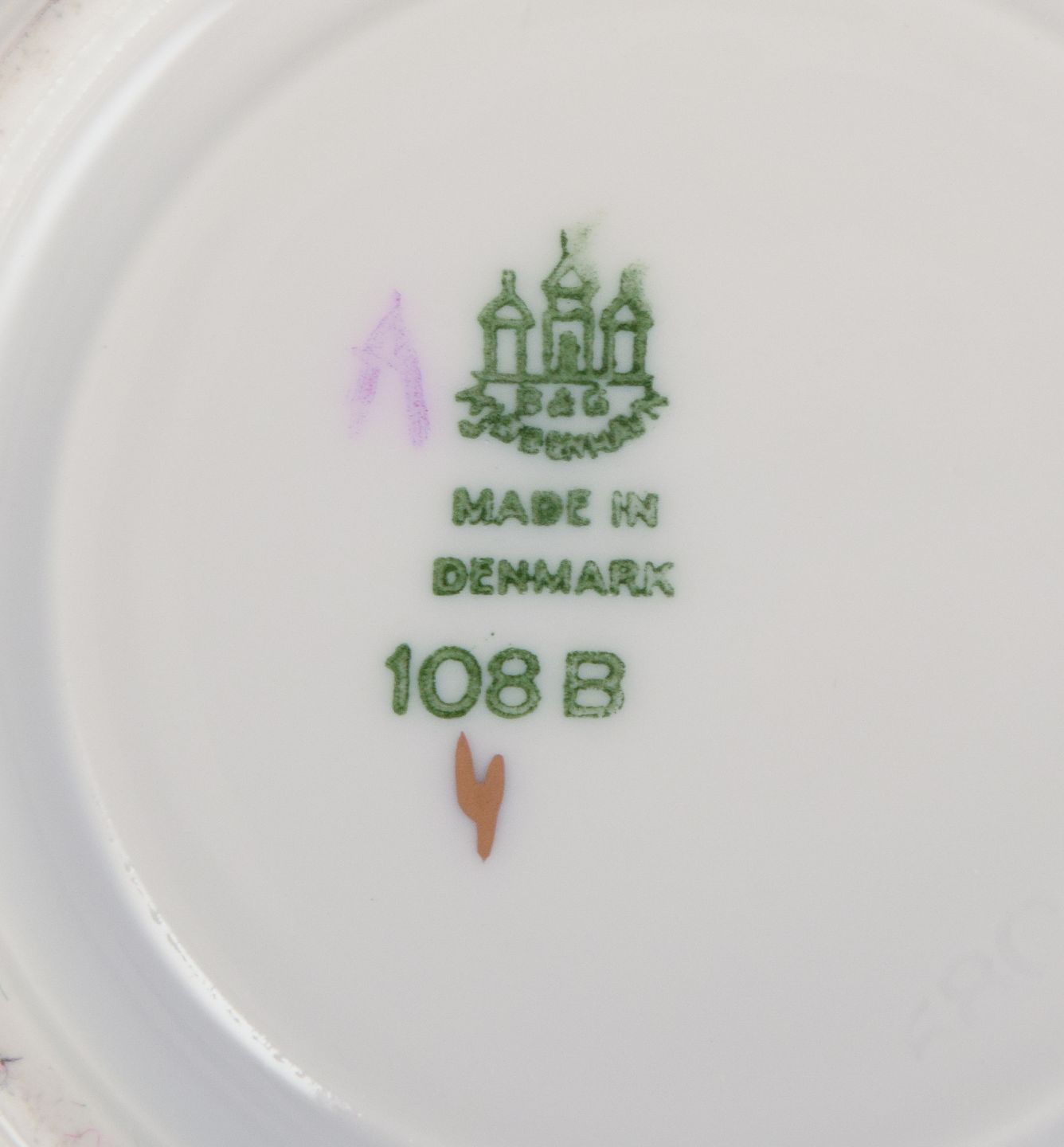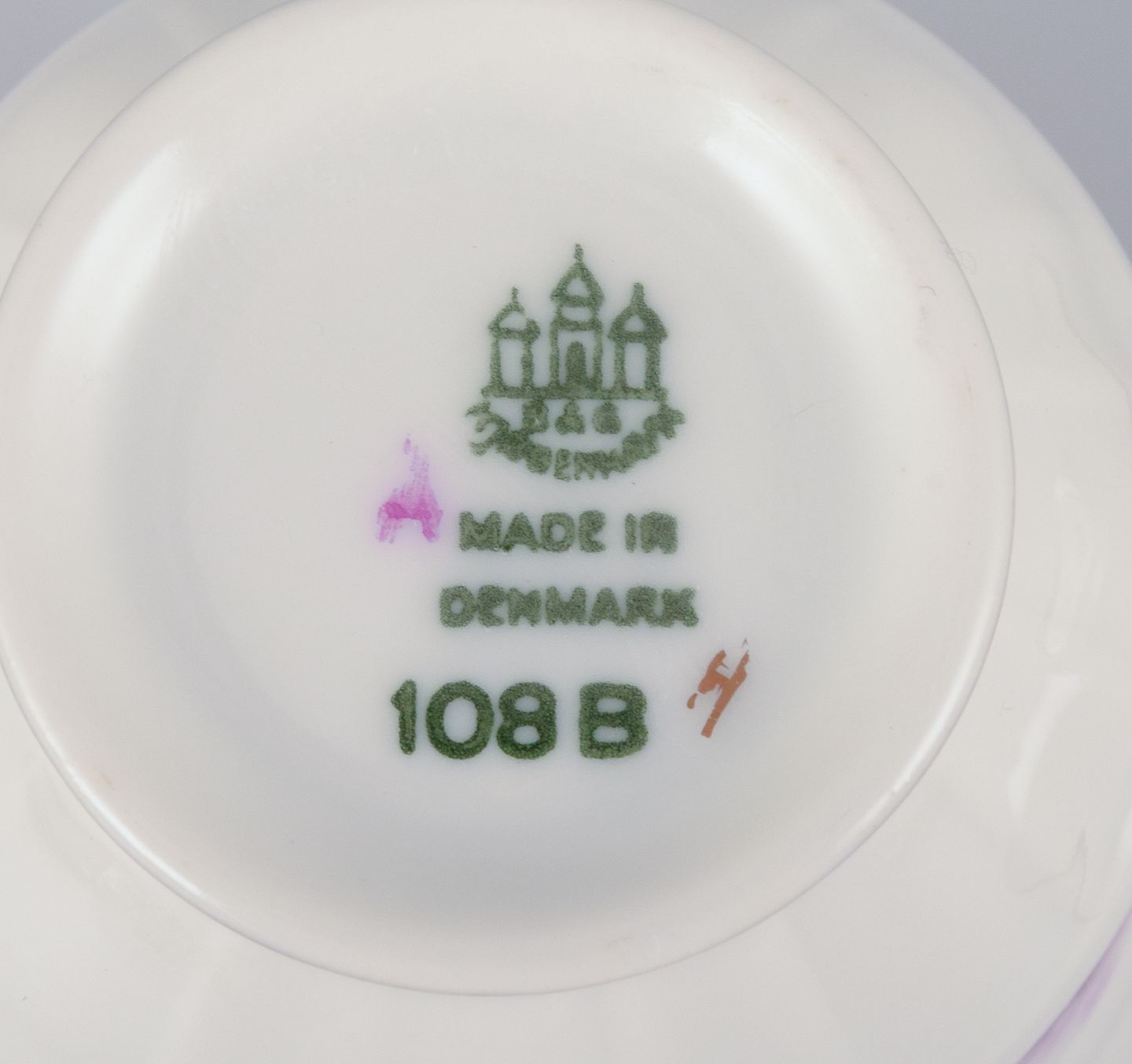 Bing & Grøndahl, Danmark. Et sæt på seks mokkakopper med tilhørende underkopper dekoreret med blomstermotiver i purpur og guldkant. Håndmalet.