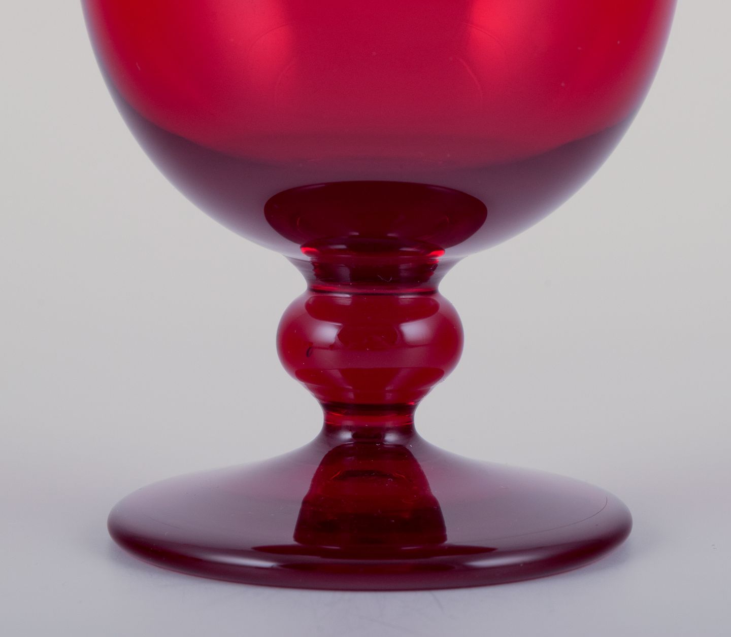 Monica Bratt for Reijmyre, Sverige. Et sæt på seks små vinglas i mundblæst vinrødt kunstglas. 1960/70’erne. Perfekt stand. Mål: H 9,4 cm. D 6,4 cm.