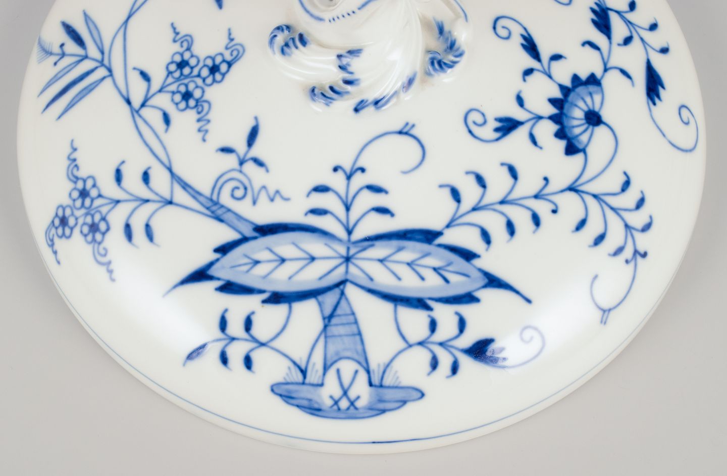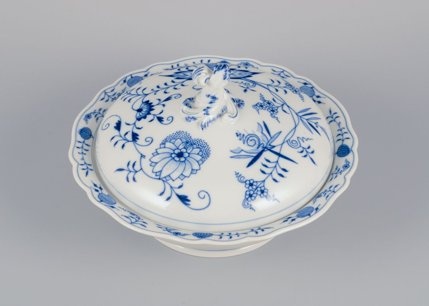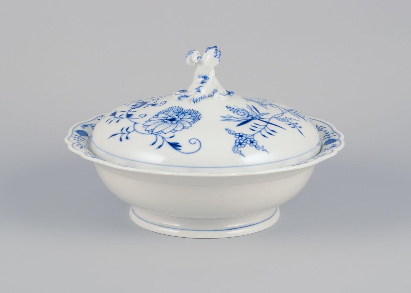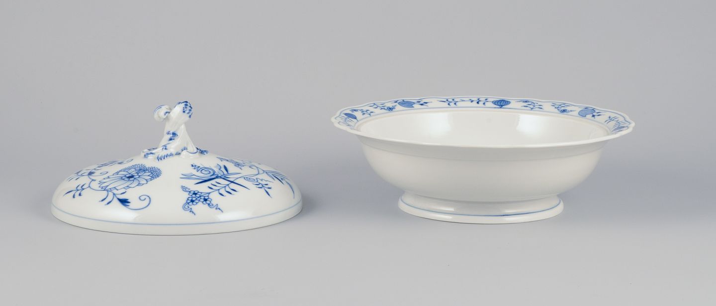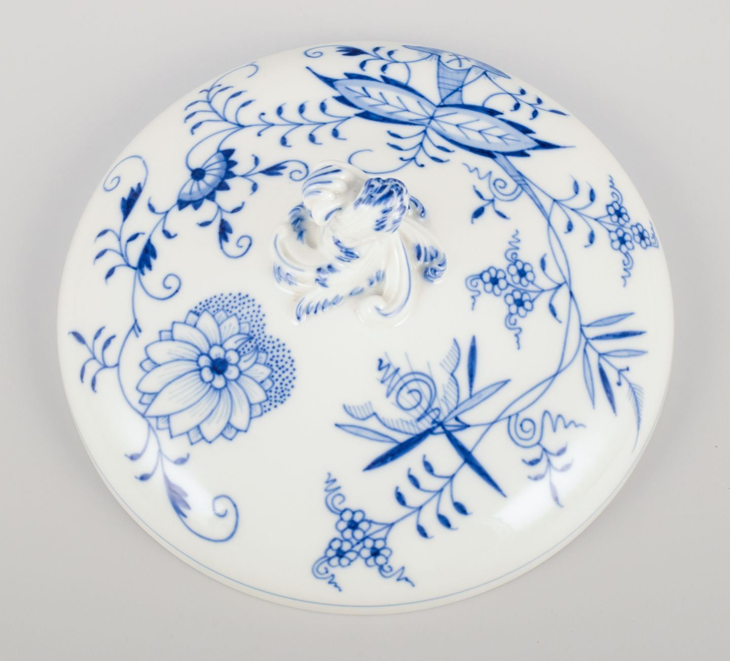 Meissen, Tyskland. Stor rund Løgmønstret lågterrin. Håndmalet. 1930’erne. Stemplet. Tredje sortering. Perfekt stand. Mål: D 26,5 cm. x 16,5 cm.