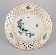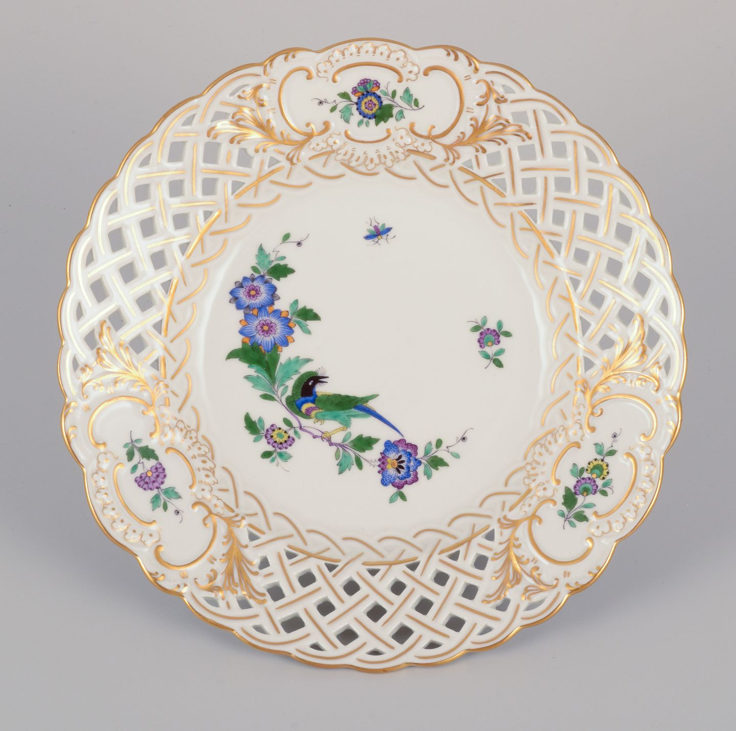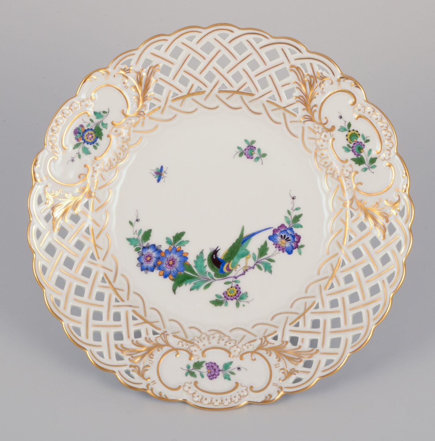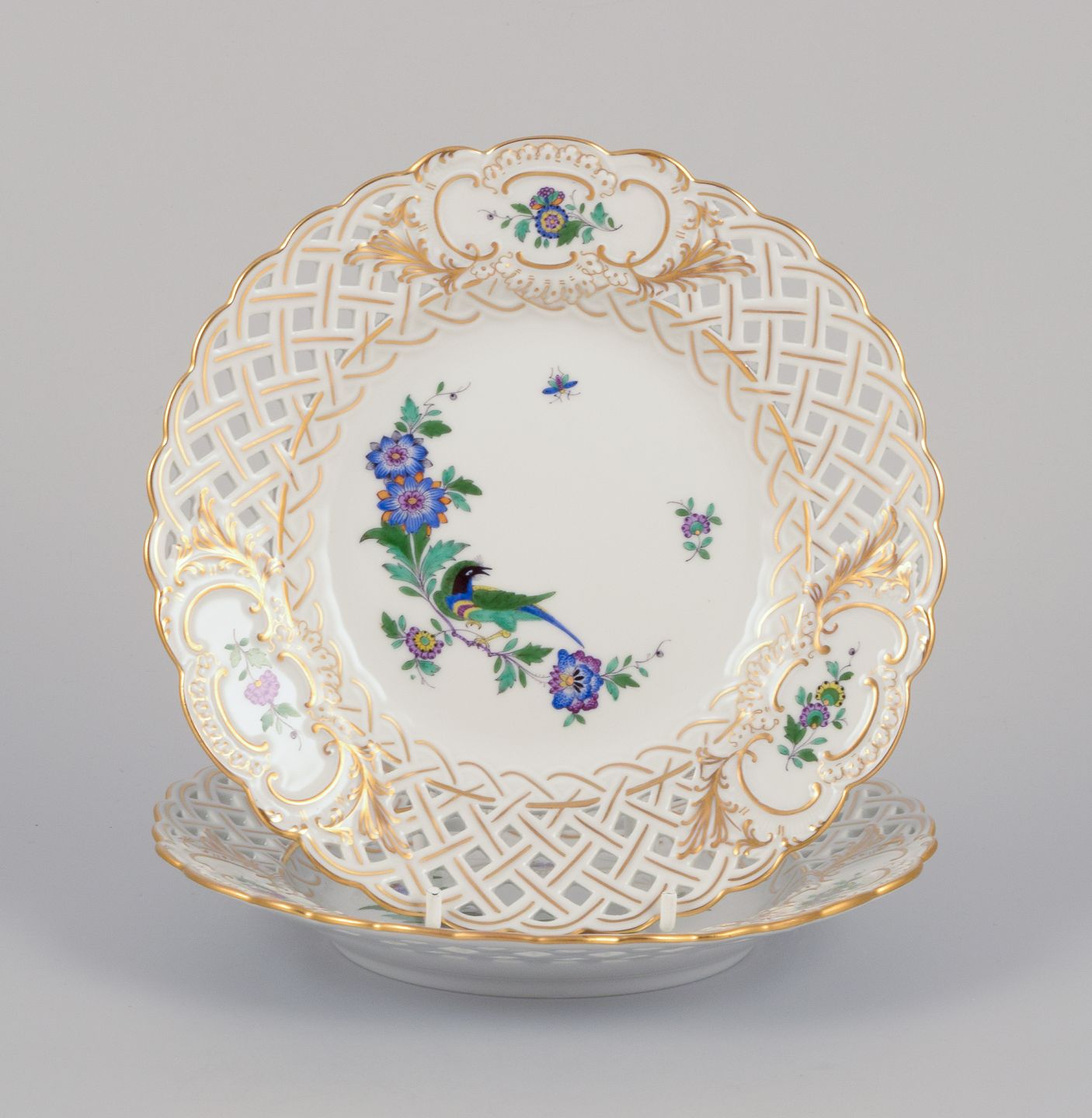 Meissen, Tyskland. To gennembrudte tallerkner i porcelæn dekoreret i guld og med eksotisk fugl på blomstergren. Midt 1900-tallet. Stemplet. Første sortering. Perfekt stand. Mål: D 18,5 cm. x H 2,8 cm.