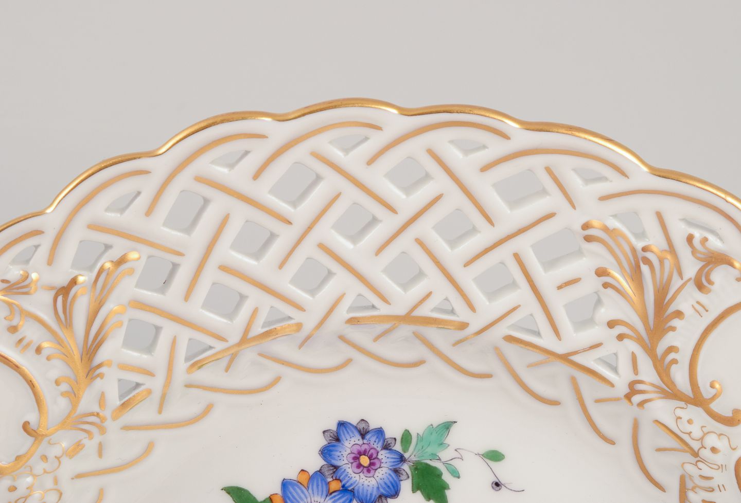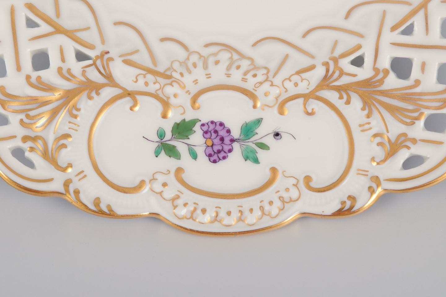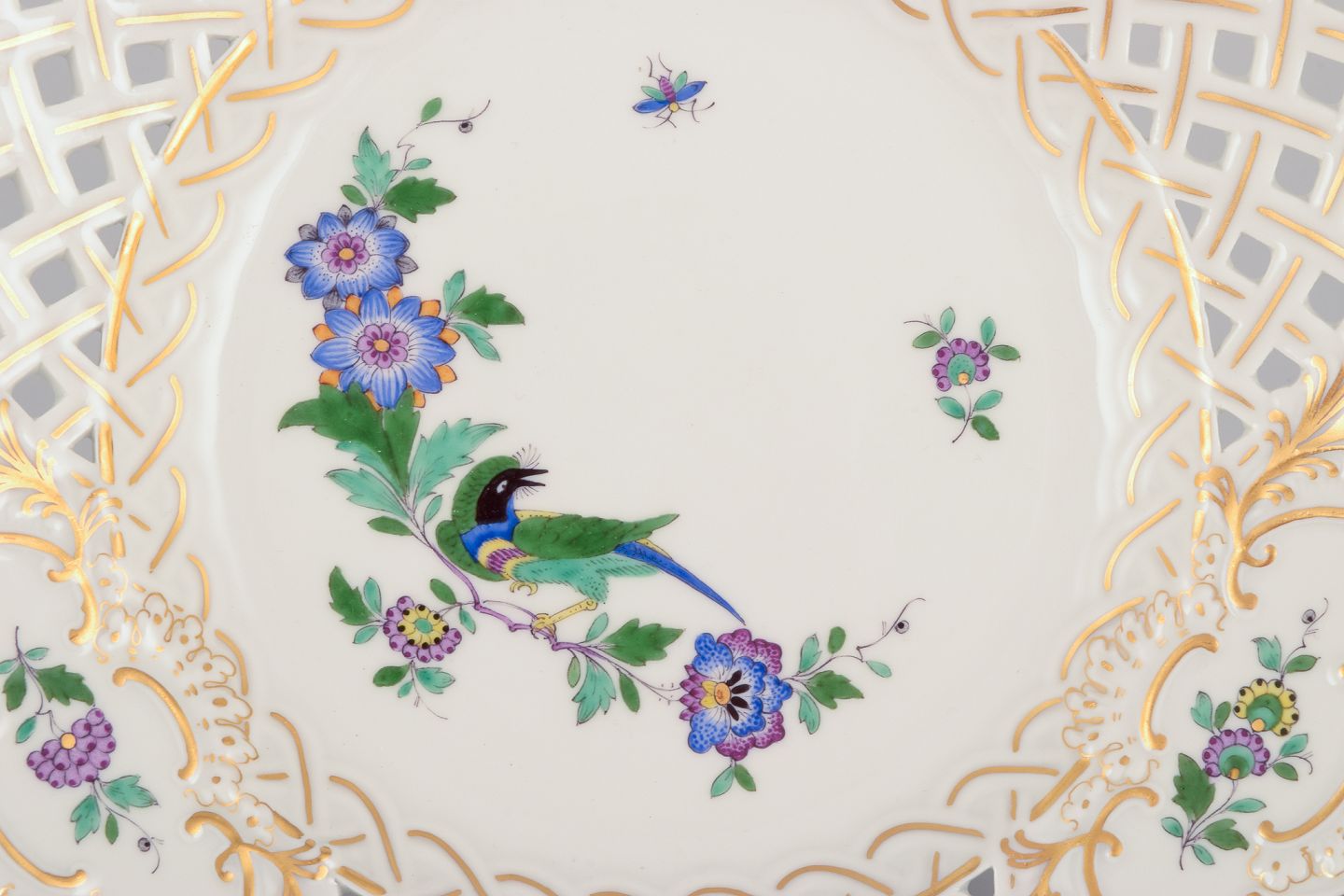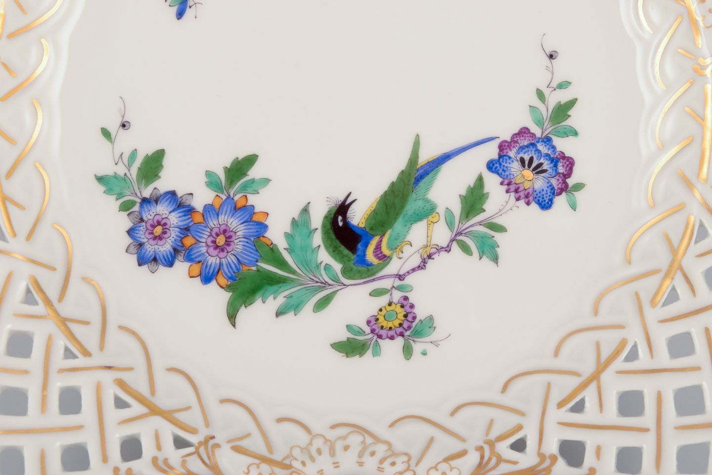 Meissen, Tyskland. To gennembrudte tallerkner i porcelæn dekoreret i guld og med eksotisk fugl på blomstergren. Midt 1900-tallet. Stemplet. Første sortering. Perfekt stand. Mål: D 18,5 cm. x H 2,8 cm.