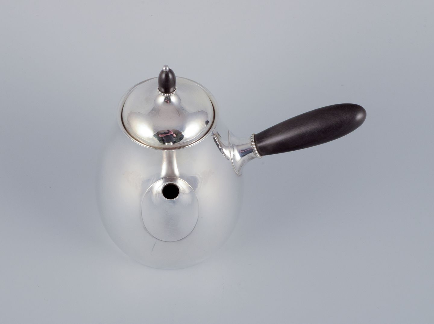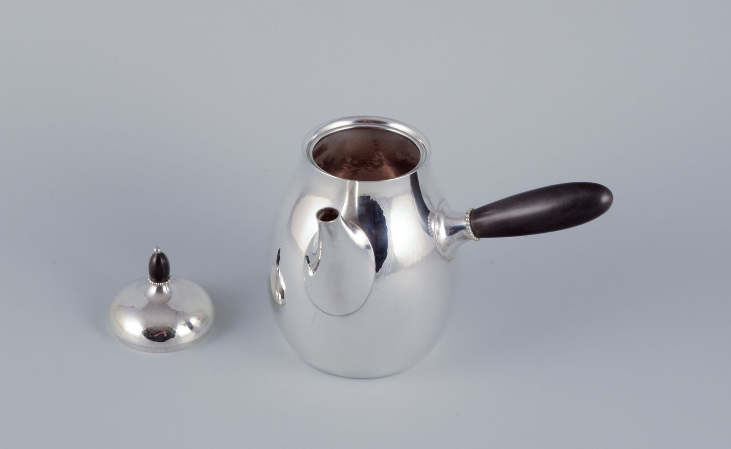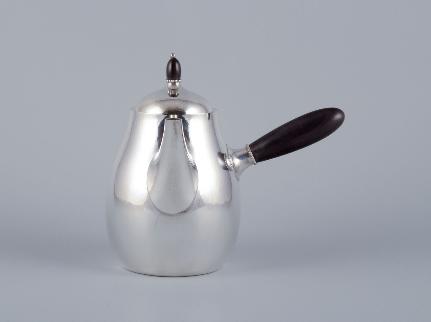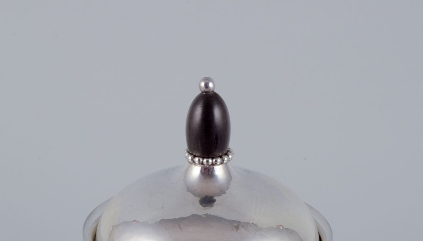 Georg Jensen kaffekande i sterlingsølv med hank og lågknop i ibenholt. Model 80A. I perfekt stand. Stemplet efter 1944. Mål: B 17,5 cm. inklusive hank x H 17,0 cm. inklusive låg.