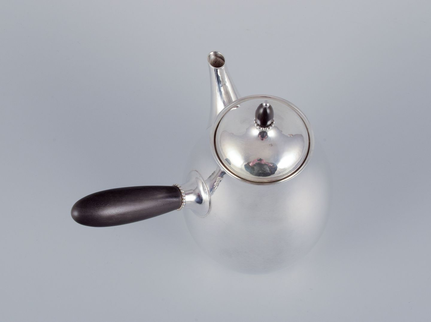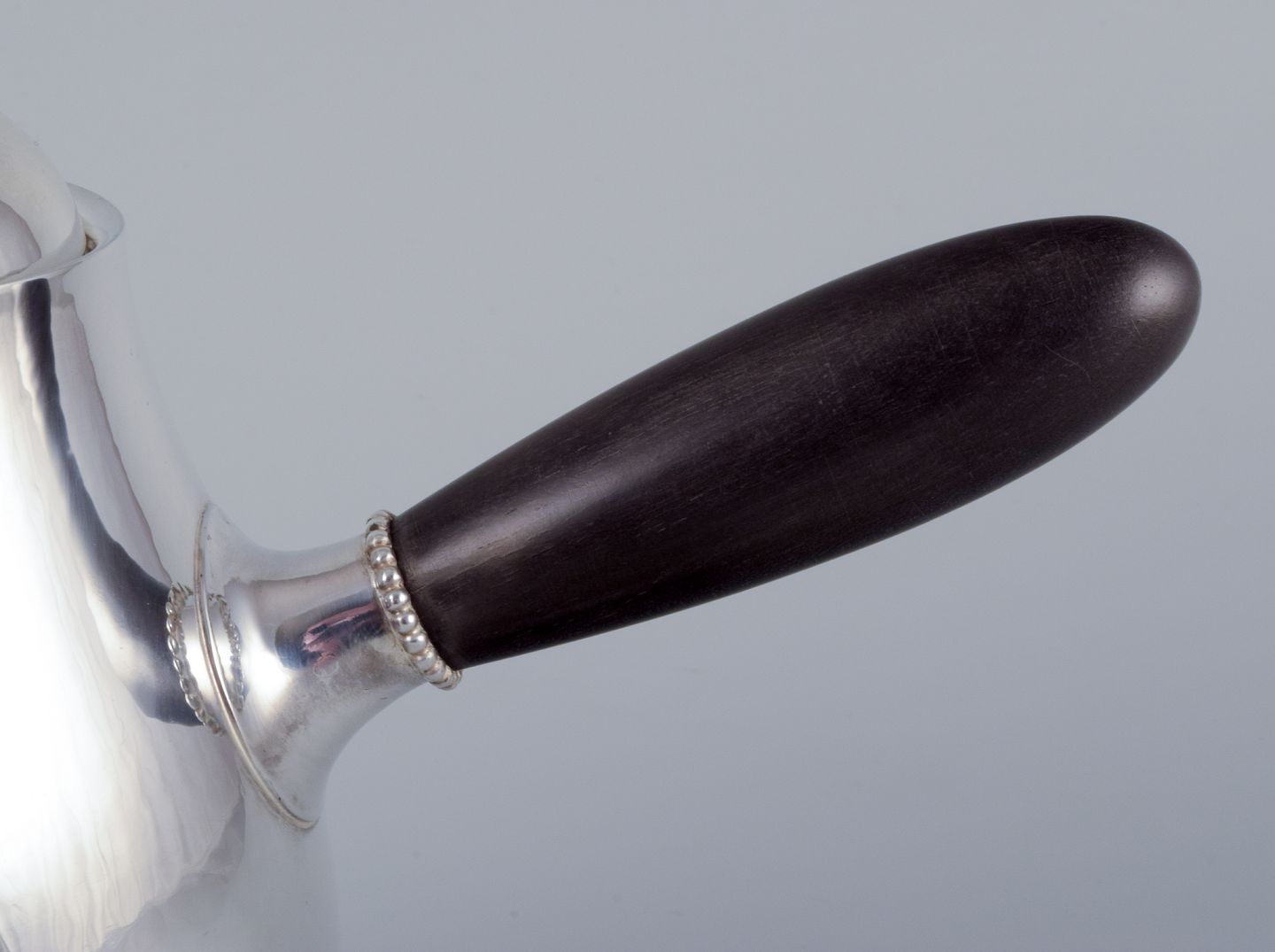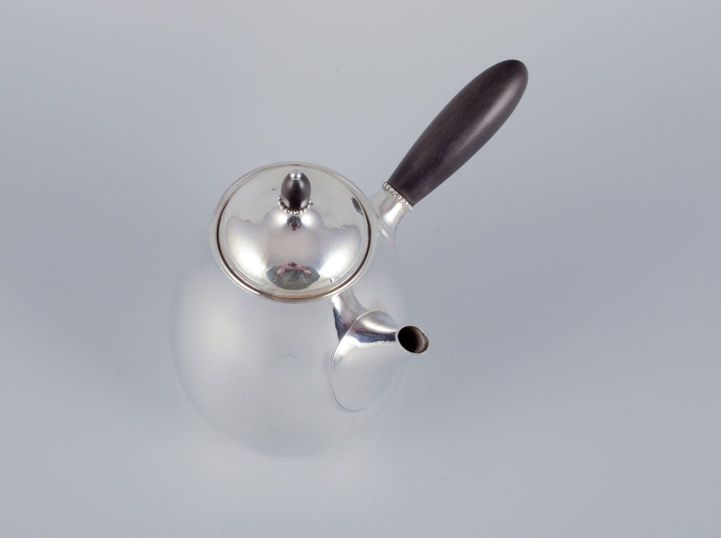 Georg Jensen kaffekande i sterlingsølv med hank og lågknop i ibenholt. Model 80A. I perfekt stand. Stemplet efter 1944. Mål: B 17,5 cm. inklusive hank x H 17,0 cm. inklusive låg.