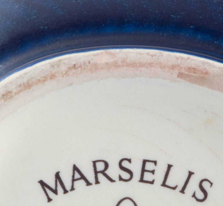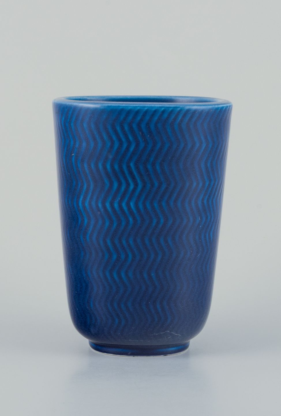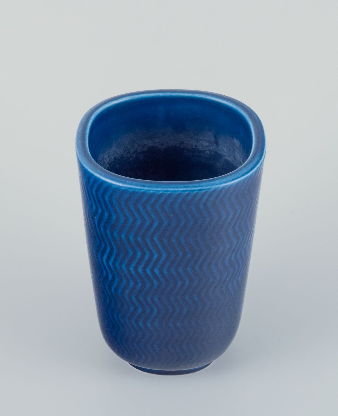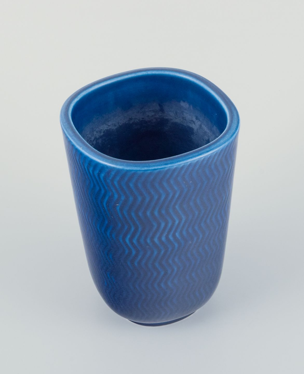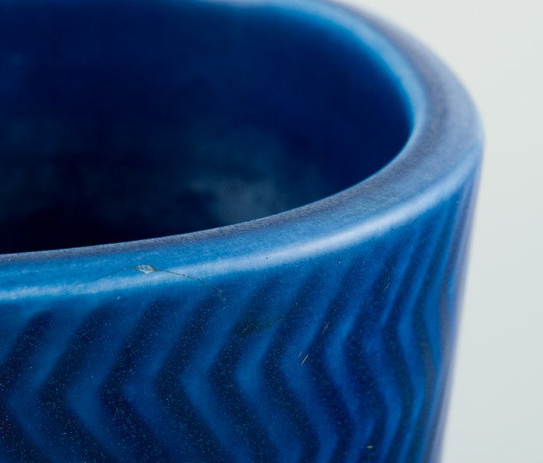 Nils Thorsson for Aluminia. ”Marselis” fajancevase i dybblå glasur med stiliseret mønster.