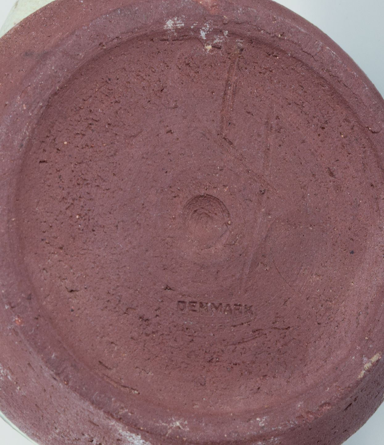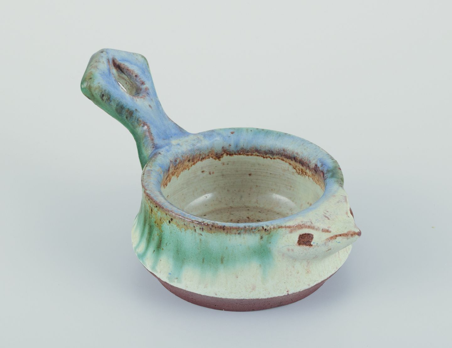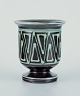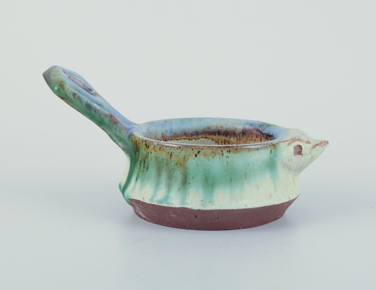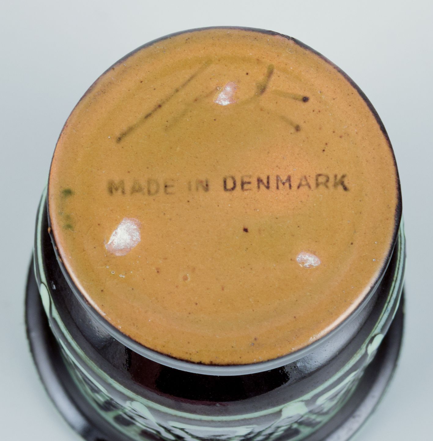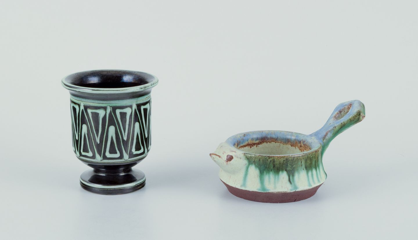 Kähler, Denmark. Small vase and small bowl with a handle shaped like a bird. Handmade ceramic. Vase with a geometric pattern.