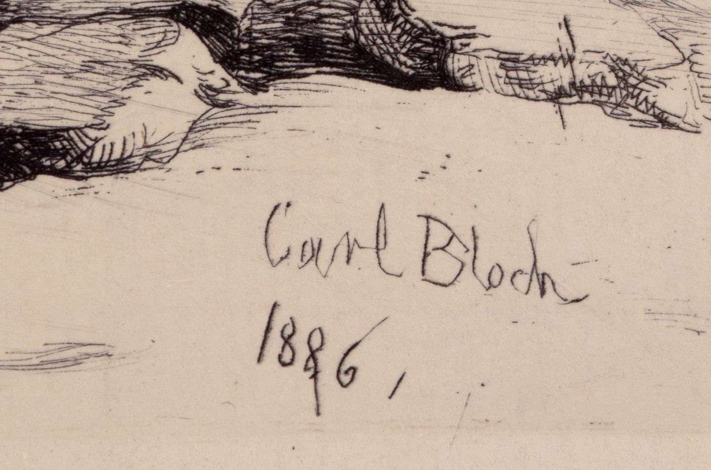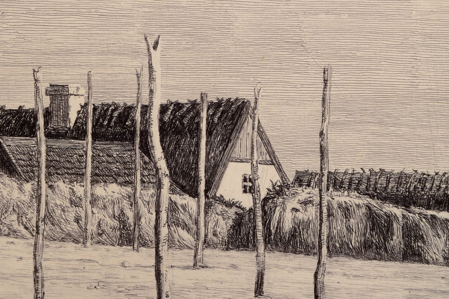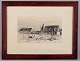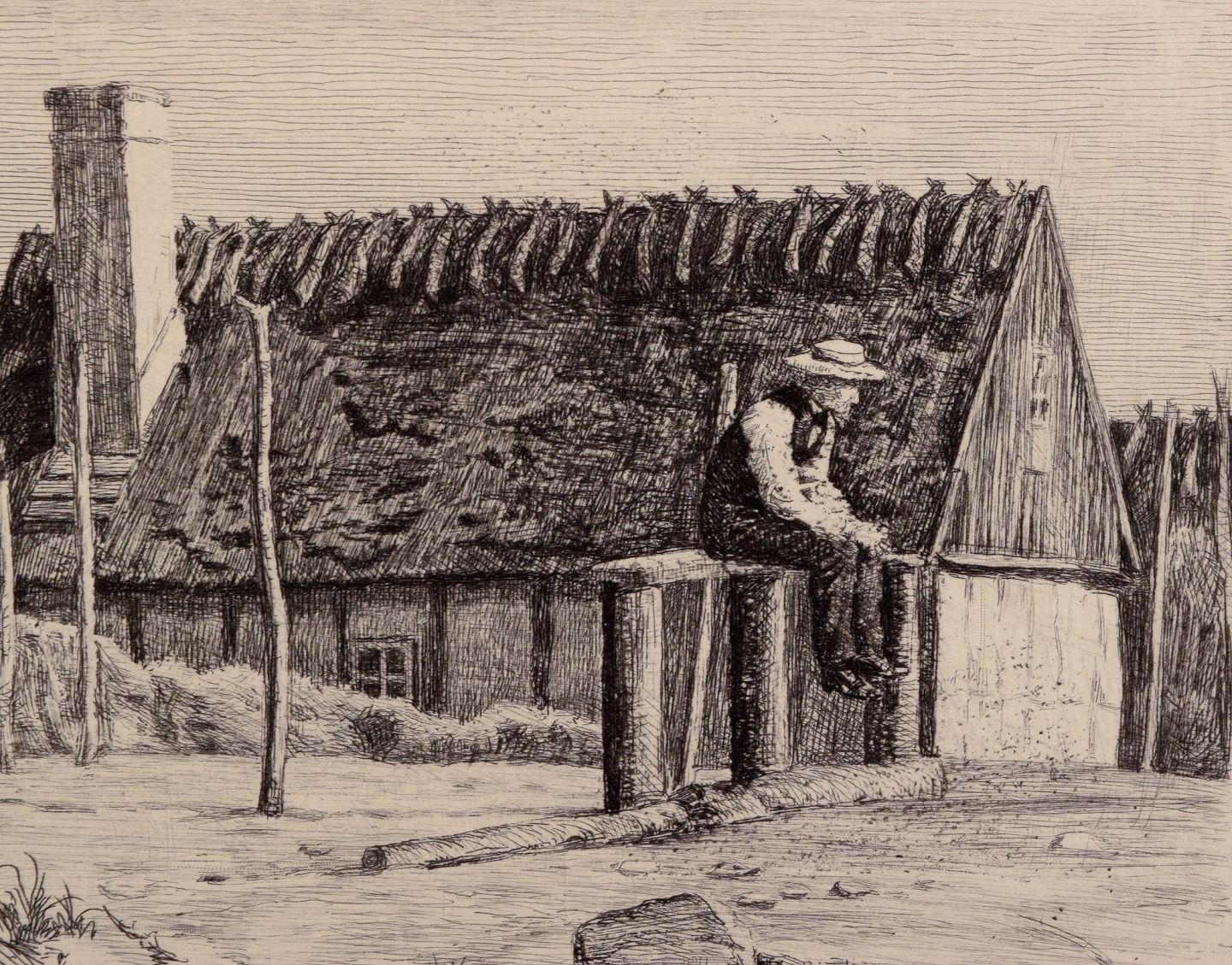 Carl Bloch (1834–1890). Radering af siddende fisker med stråtækte huse i baggrund.