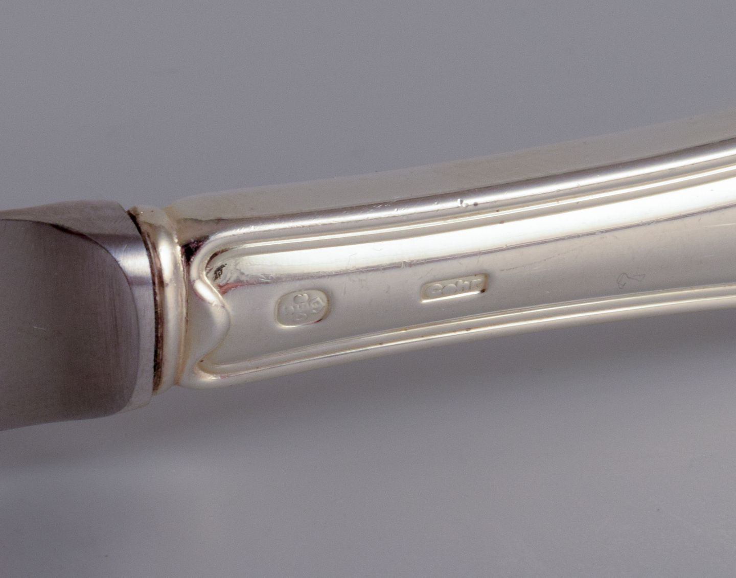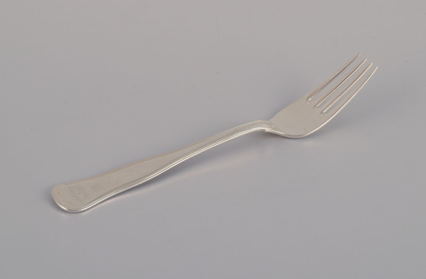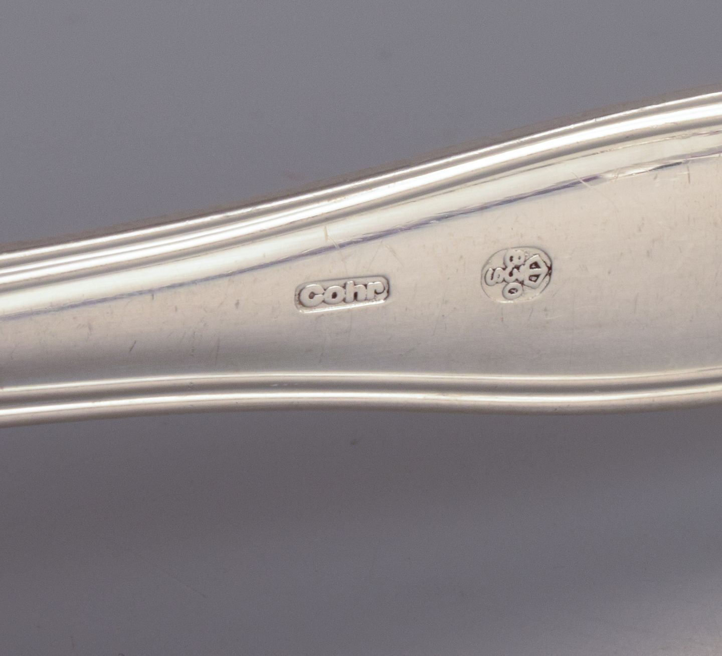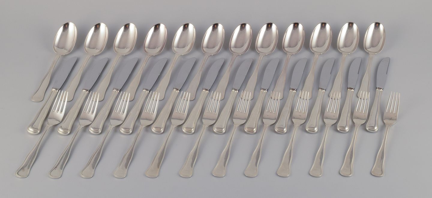 Cohr, dansk sølvsmed. Dobbeltriflet. Komplet tolvpersoners frokostservice bestående af tolv frokostknive, tolv frokostgafler og tolv dessertskeer i tretårnet sølv.