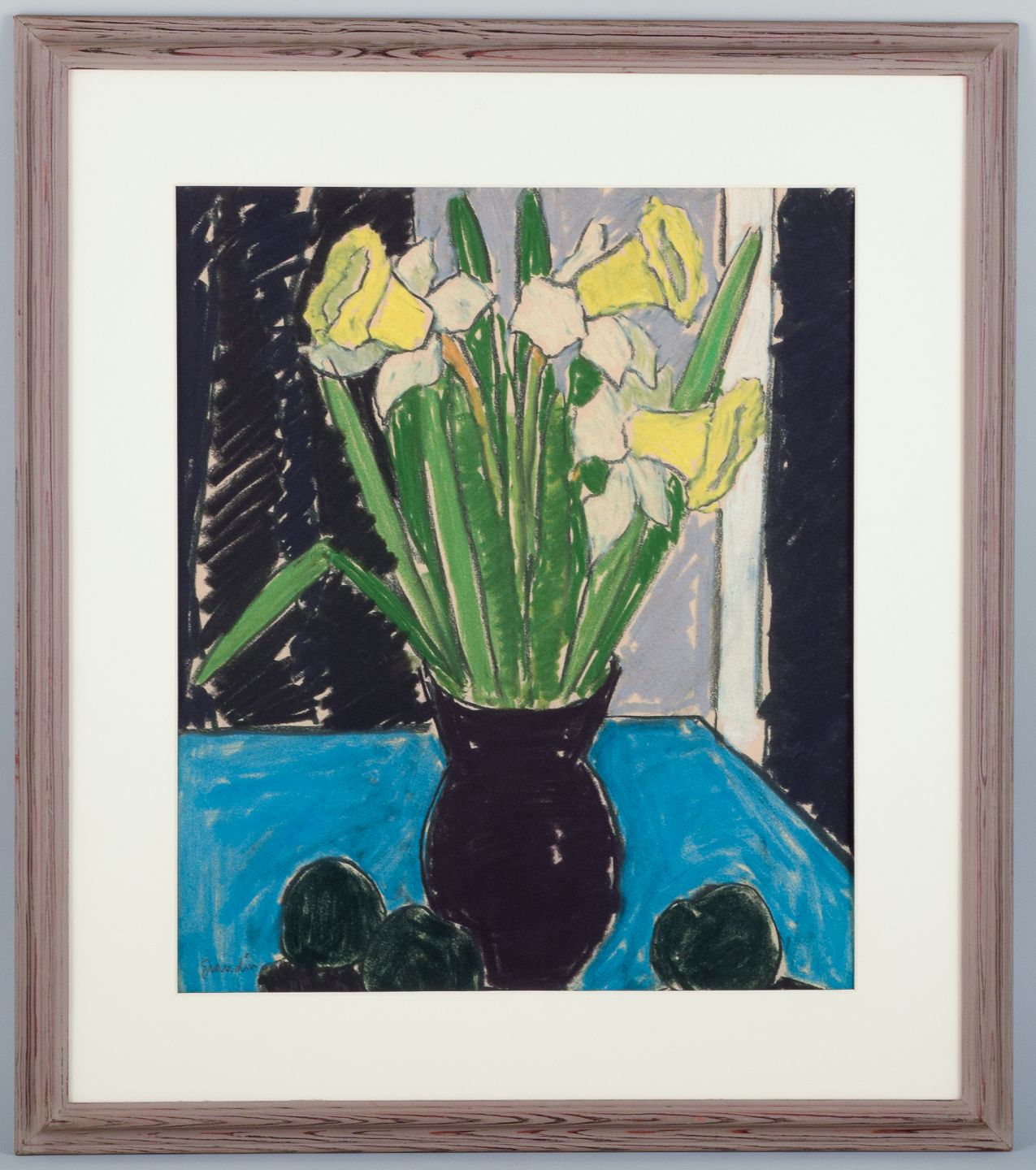 Svän Grandin (1906-1982), svensk kunstner. Mixed media på papir. Blomsteropstilling i modernistisk stil. 1960'erne. Perfekt stand. Lysmål: 36,0 cm. x 42,5 cm. Totalmål: 53,0 cm. x 60,0 cm.