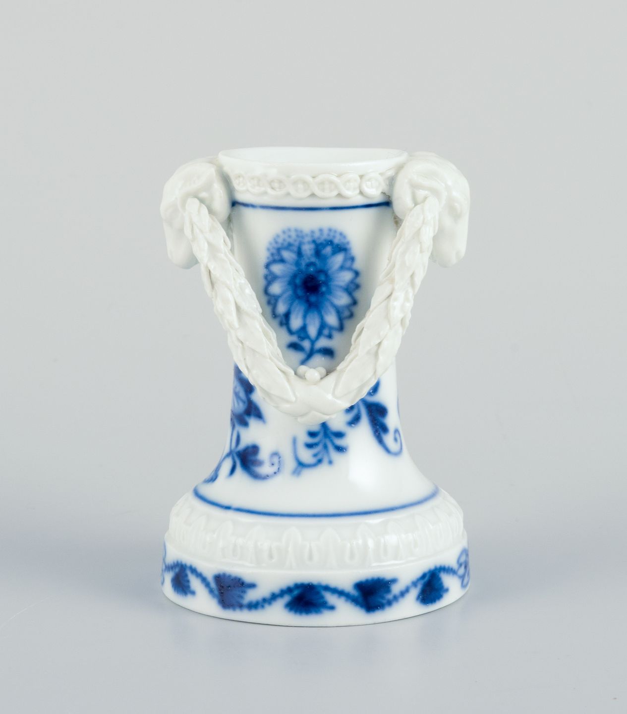 Meissen, Tyskland. Sjælden løgmønstret miniaturevase med vædderhoveder. Tidlig 1900-tallet. Første sortering. Perfekt stand. Stemplet. Mål: H 8,0 cm. x D 5,6 cm.