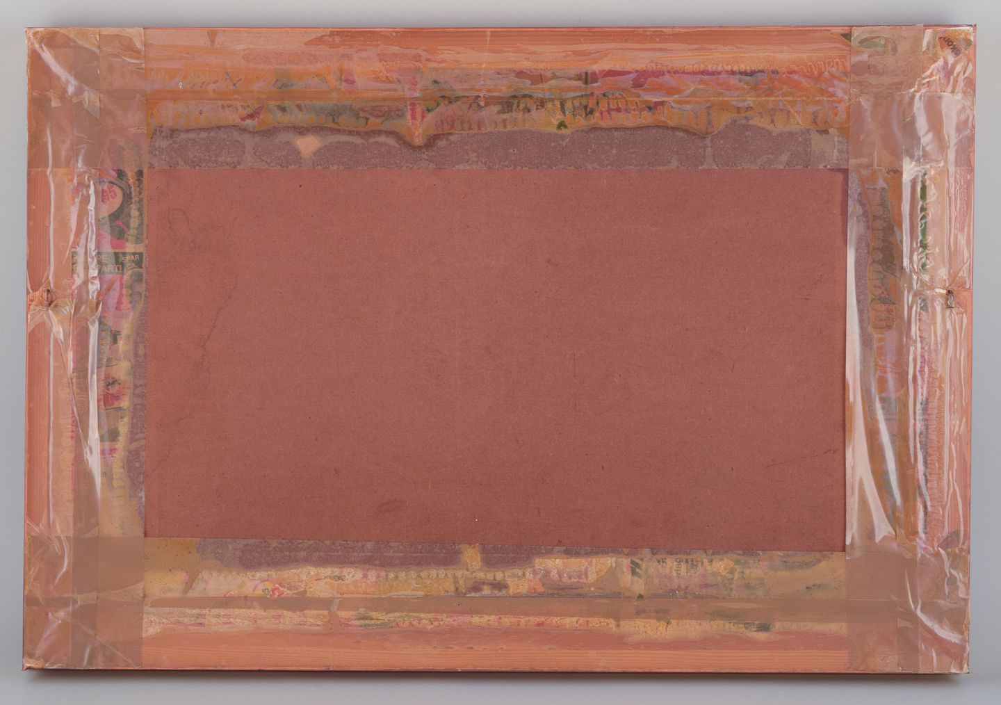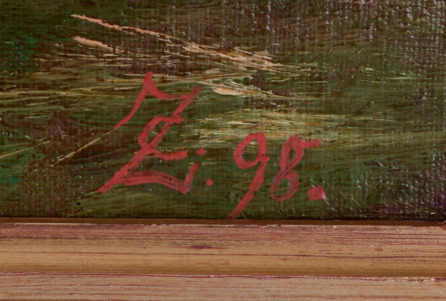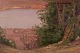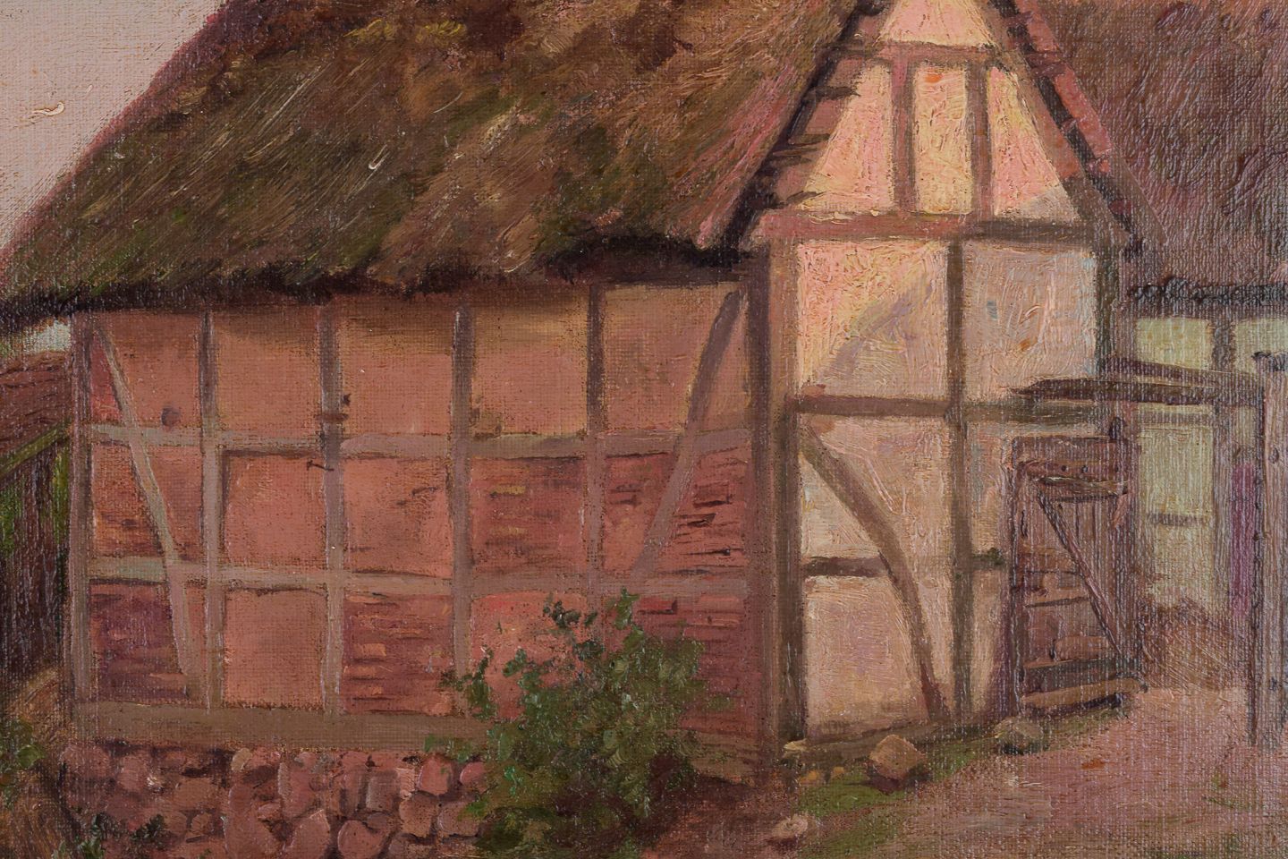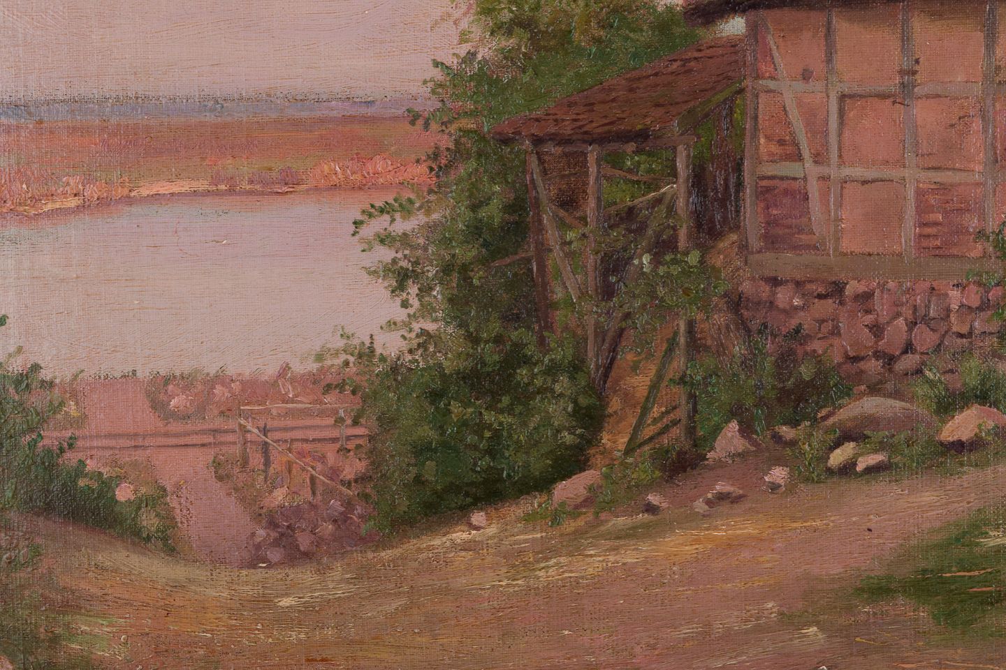 Olie på malerplade. Dansk sommerlandskab. Stråtækt hus ved sø med udsigt over marker.