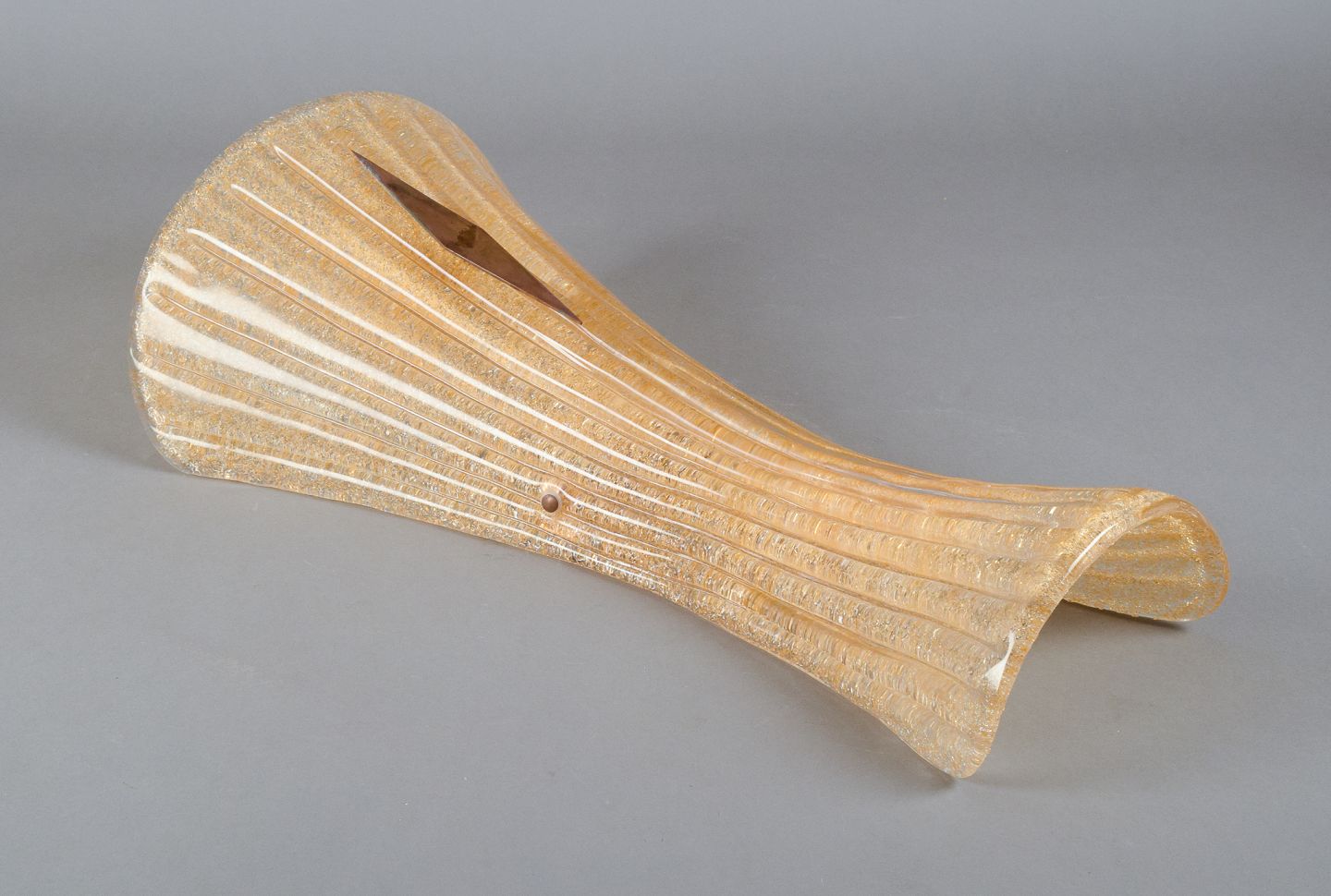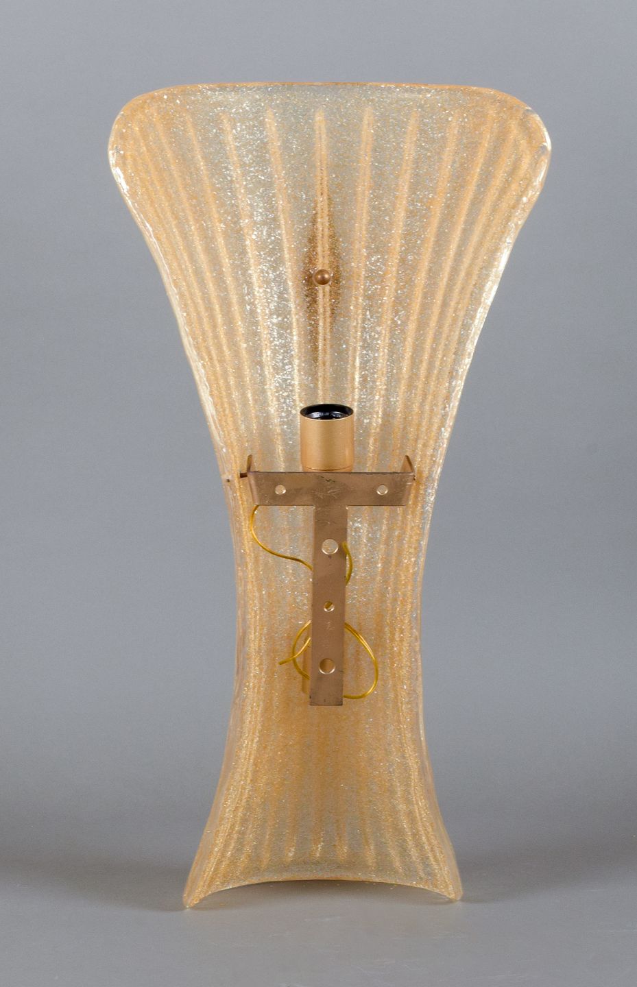 Barovier og Toso, Venedig. Stor væglampe i kanneleret mundblæst kunstglas og messing. Klart mundblæst glas med "guldstøv" indlagt. To fatninger: E27 (øverst) og E14 (nederst).