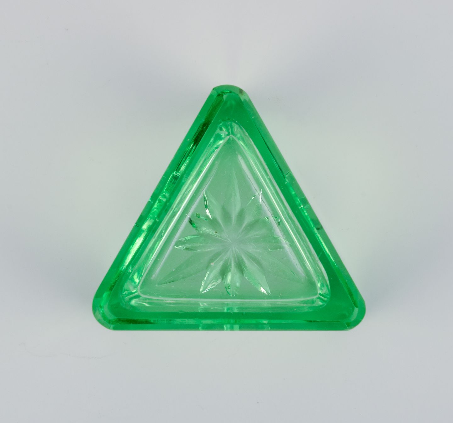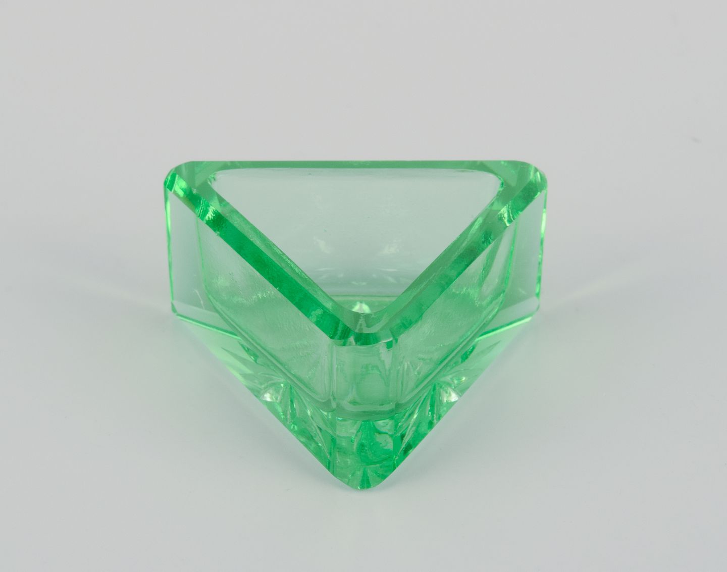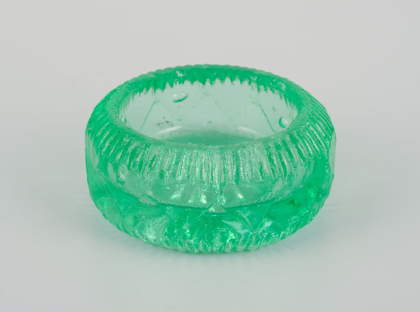 Fåglavik Glasbruk (1874-1980), Sverige. Seks saltkar i farvet glas. Grønt håndlavet glas. Privat svensk samling. Midt 1900-tallet. I perfekt stand. Største: D 5,5 cm. x H 2,5 cm.