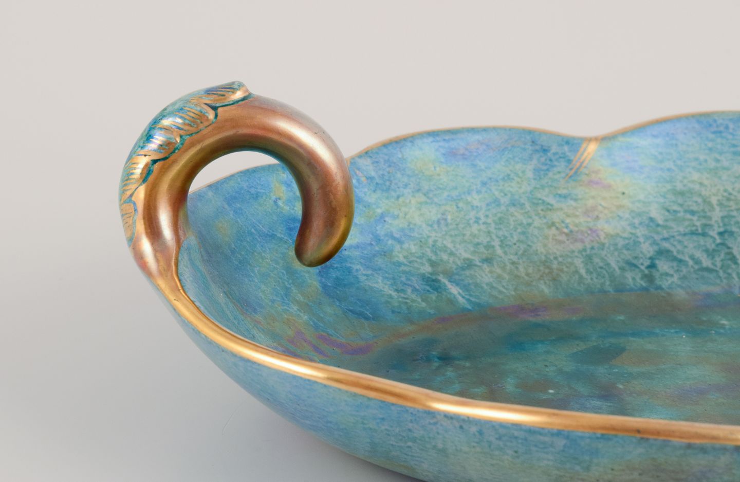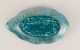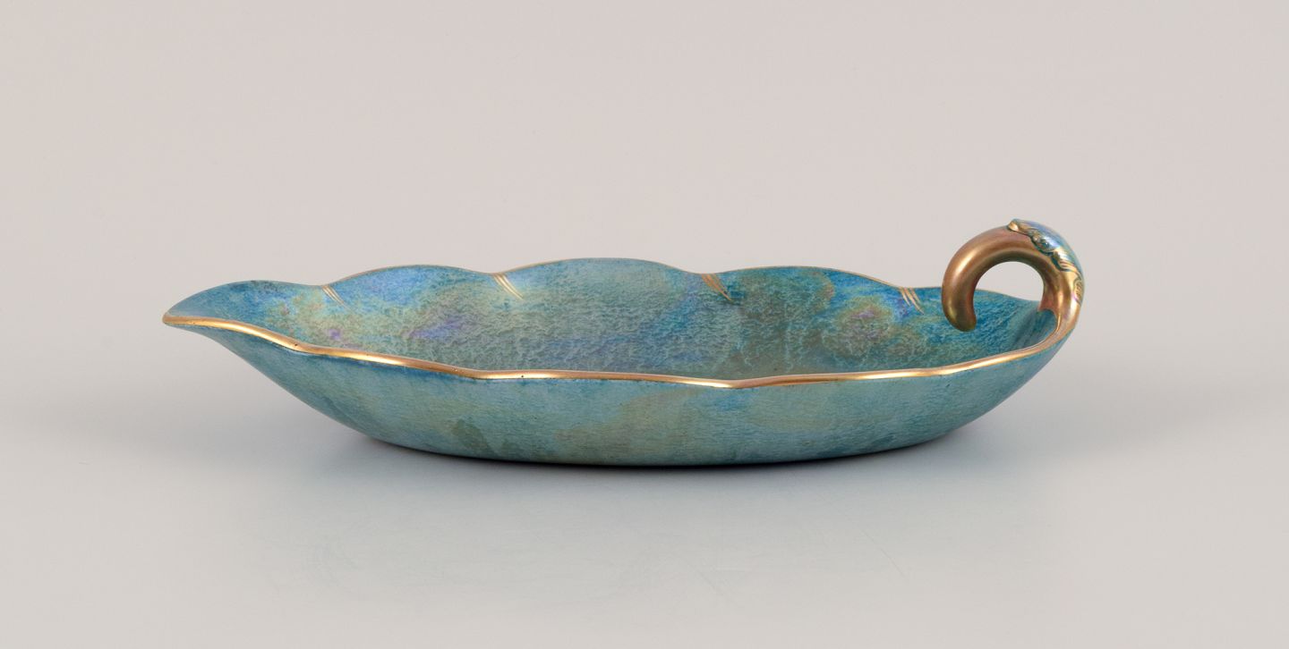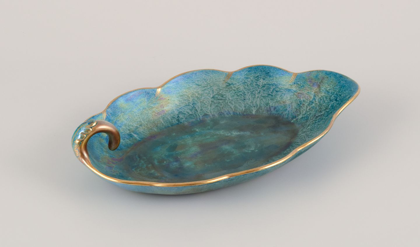 Leaf-shaped ceramic bowl with glaze in green-blue tones, gold decoration.